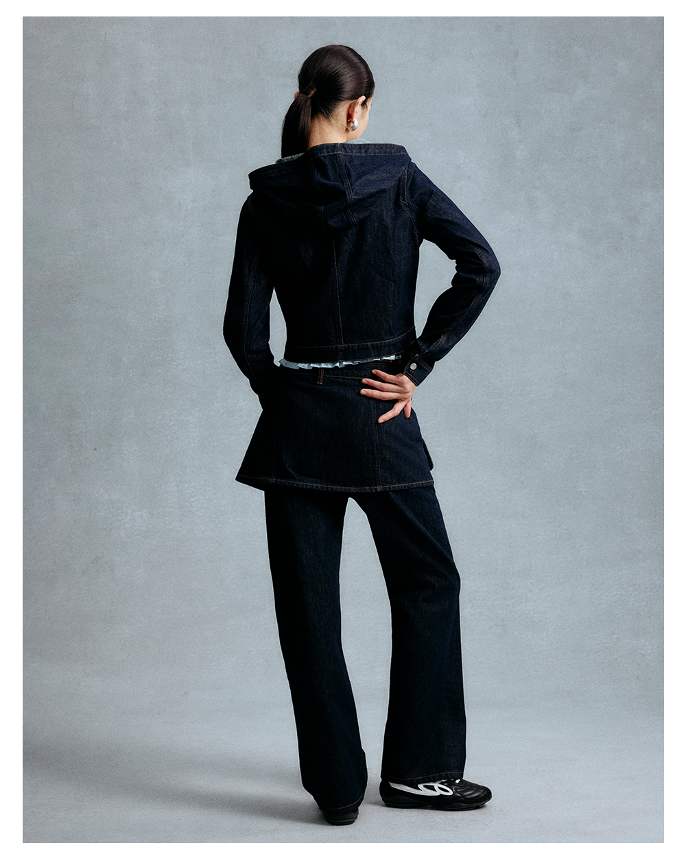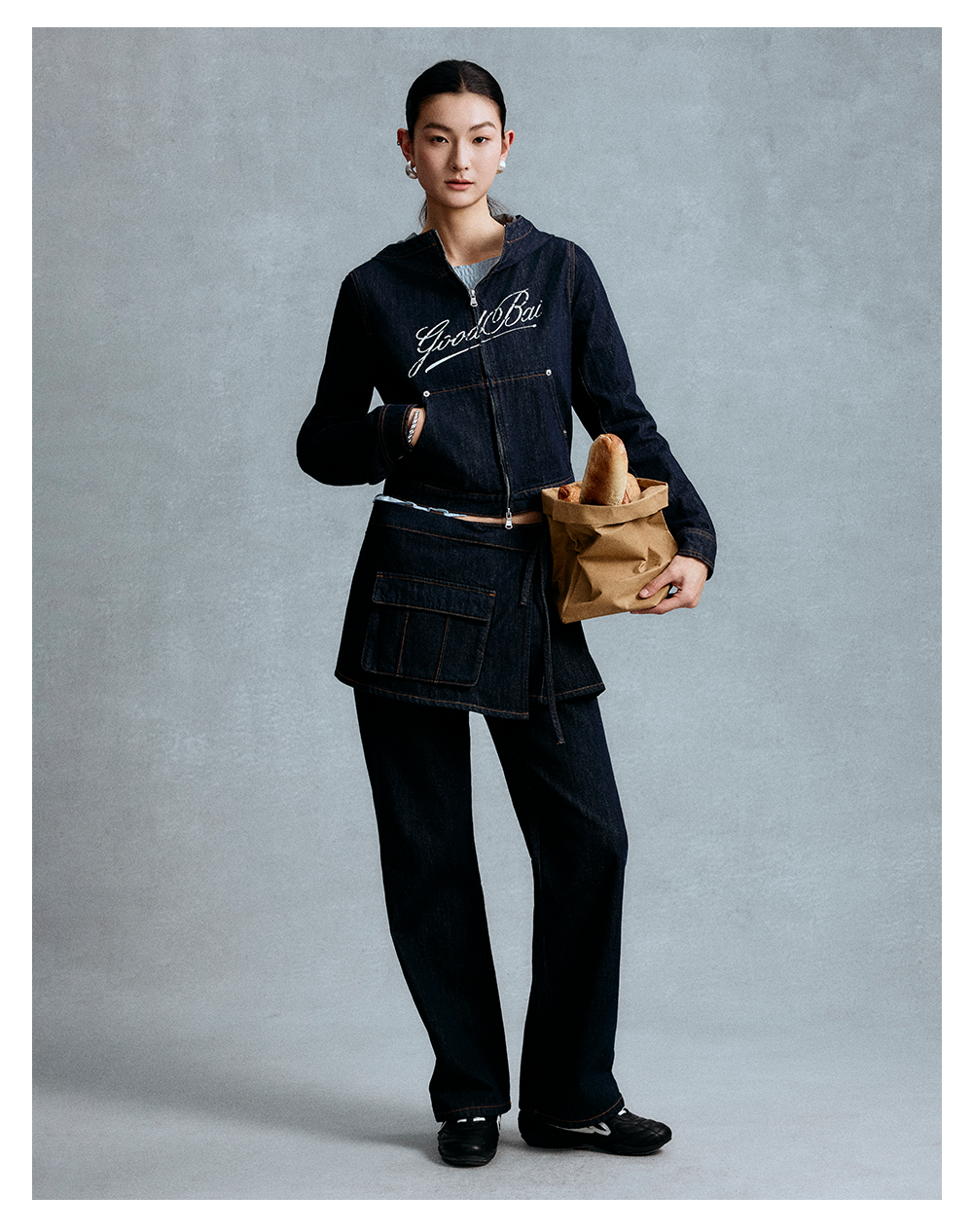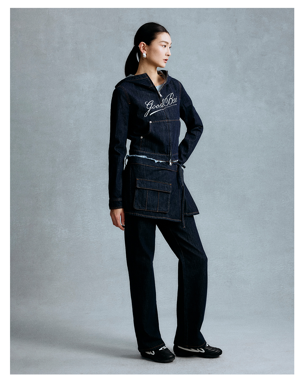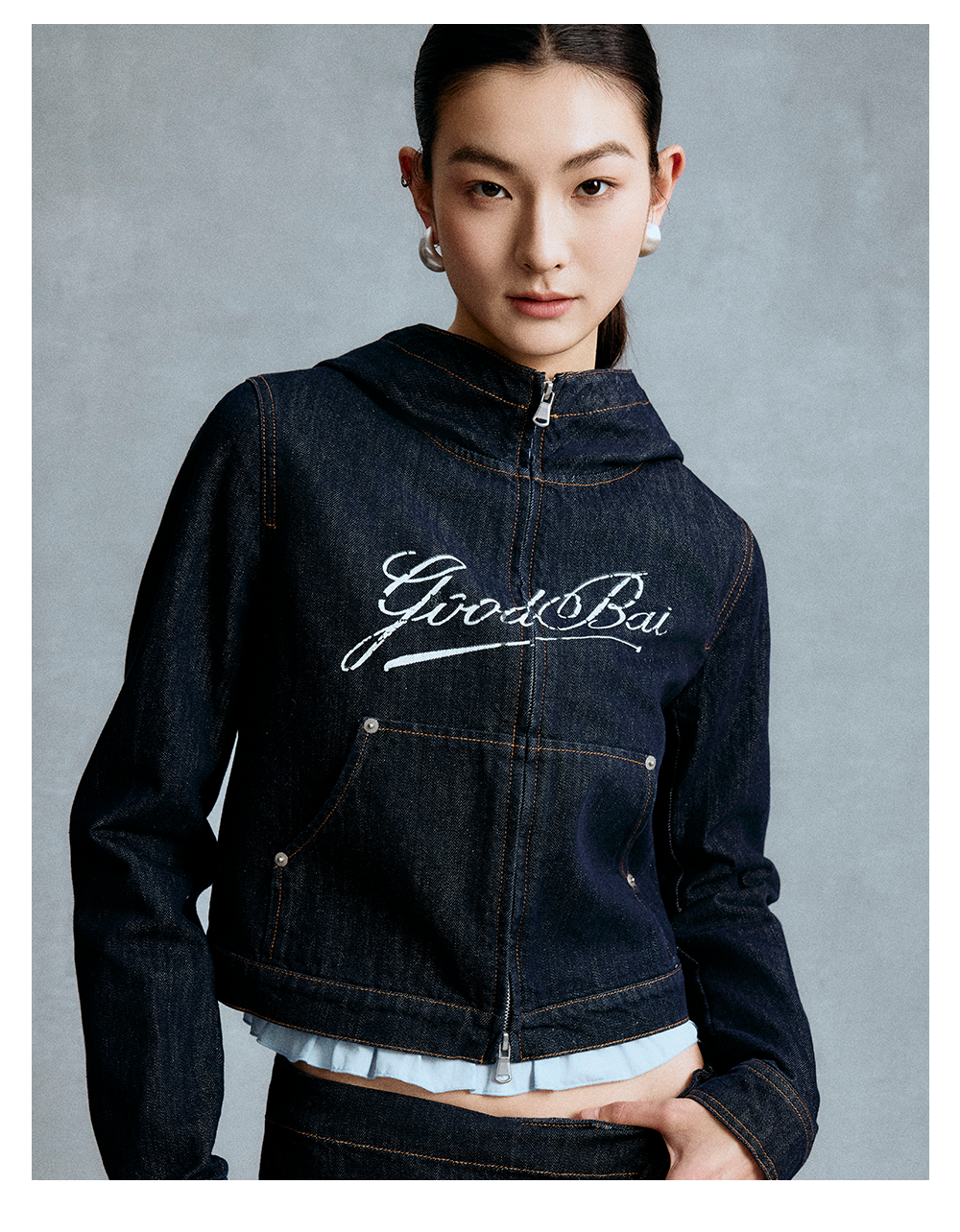 GOODBAI 斜体logo印花连帽正肩长袖牛仔外套