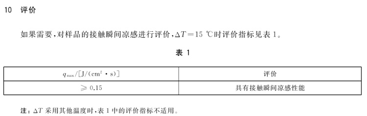 经检测后接触凉感系数≥0.15时,则评价该产品具有接触瞬间凉感性能