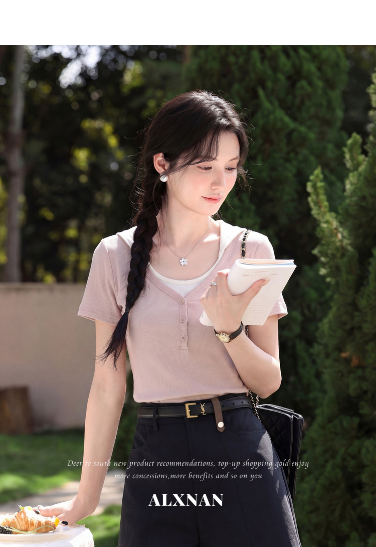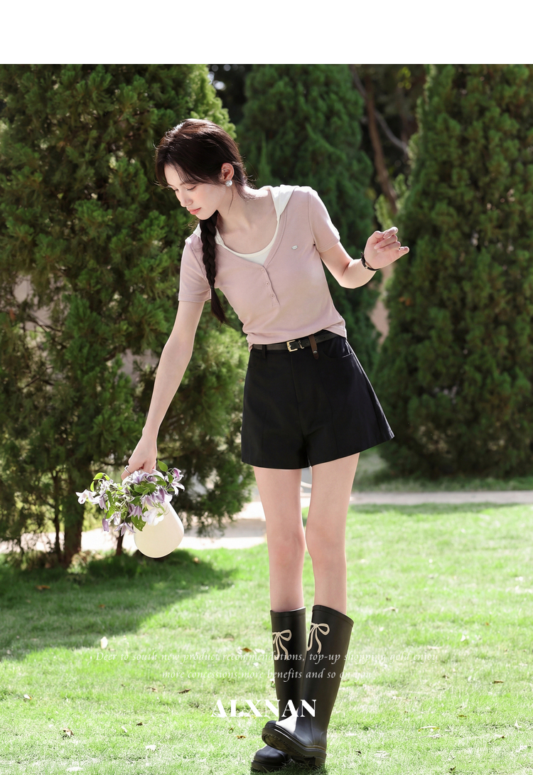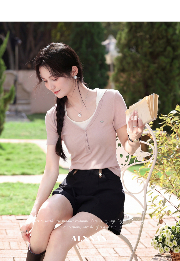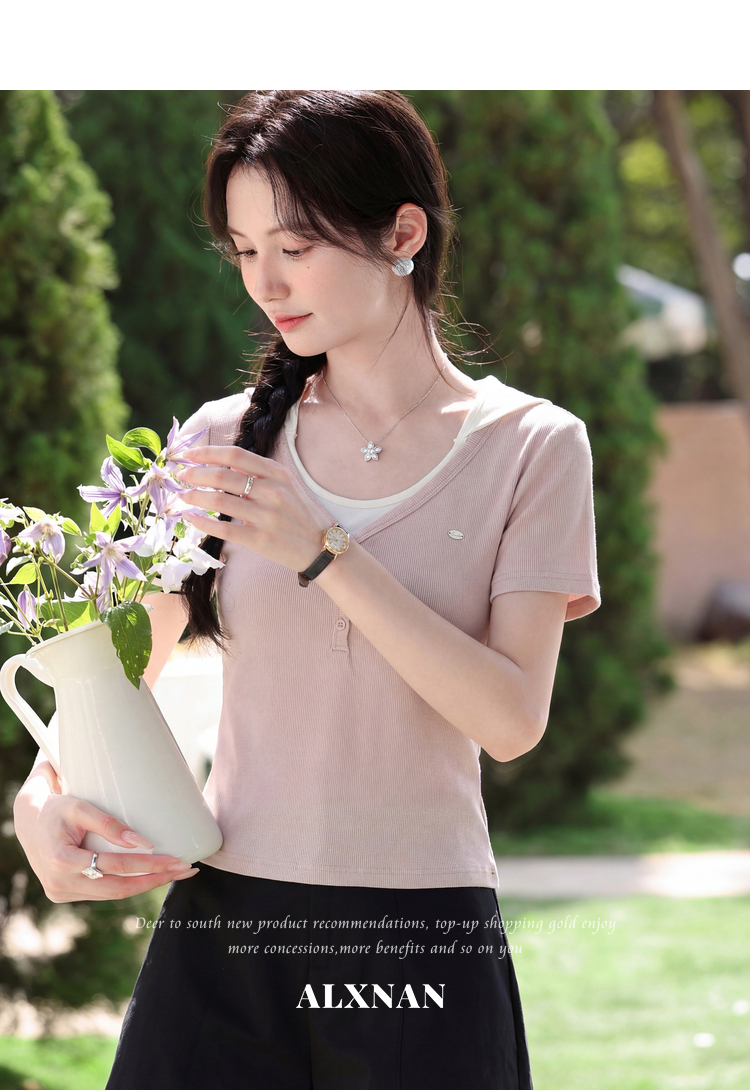 鹿向南【0405/20:00新品前1小时7折限量100件】假两件粉色T恤短袖