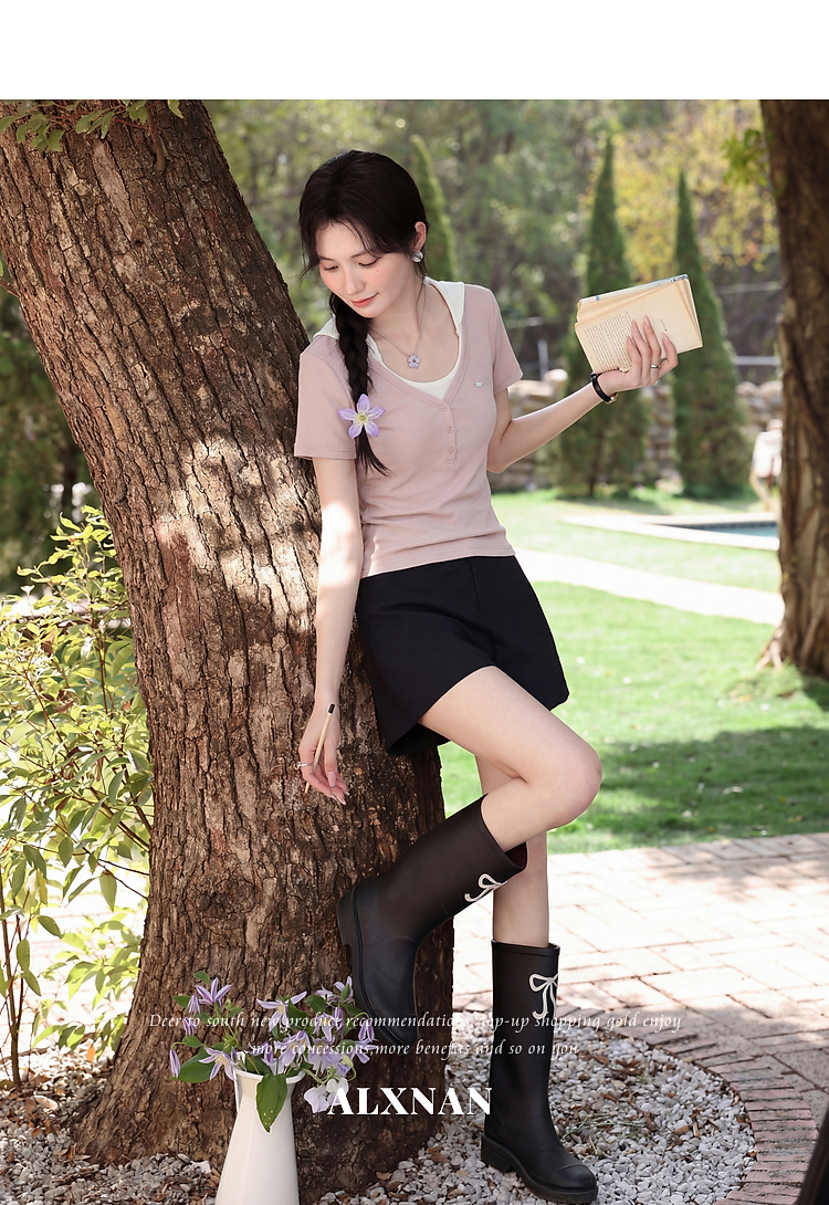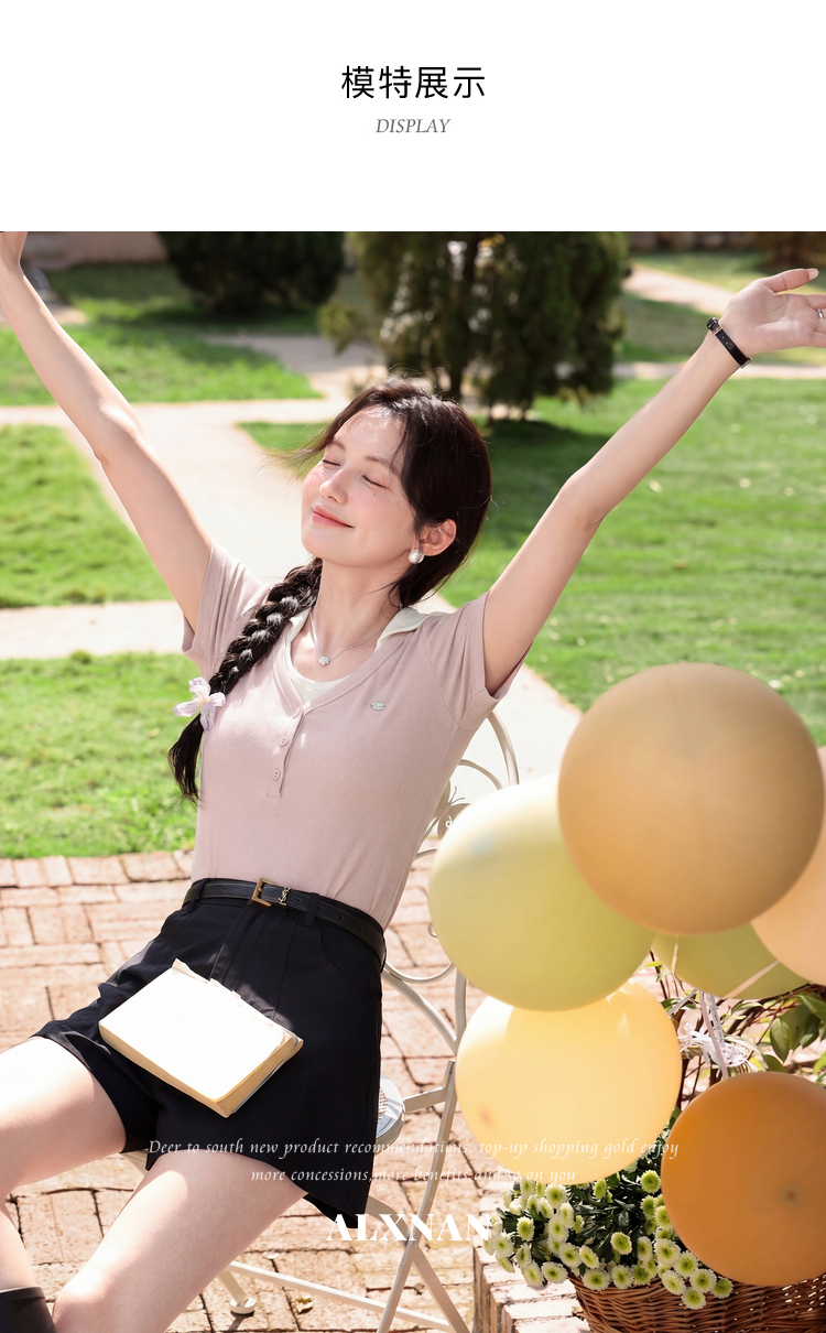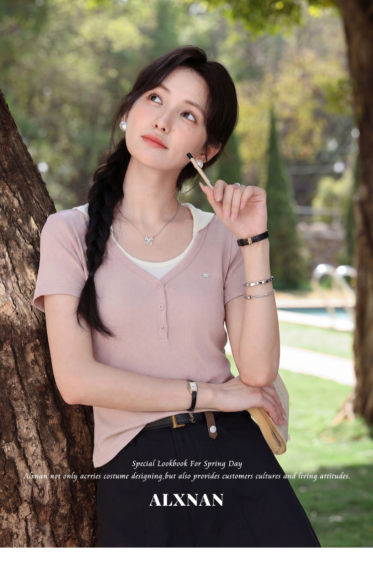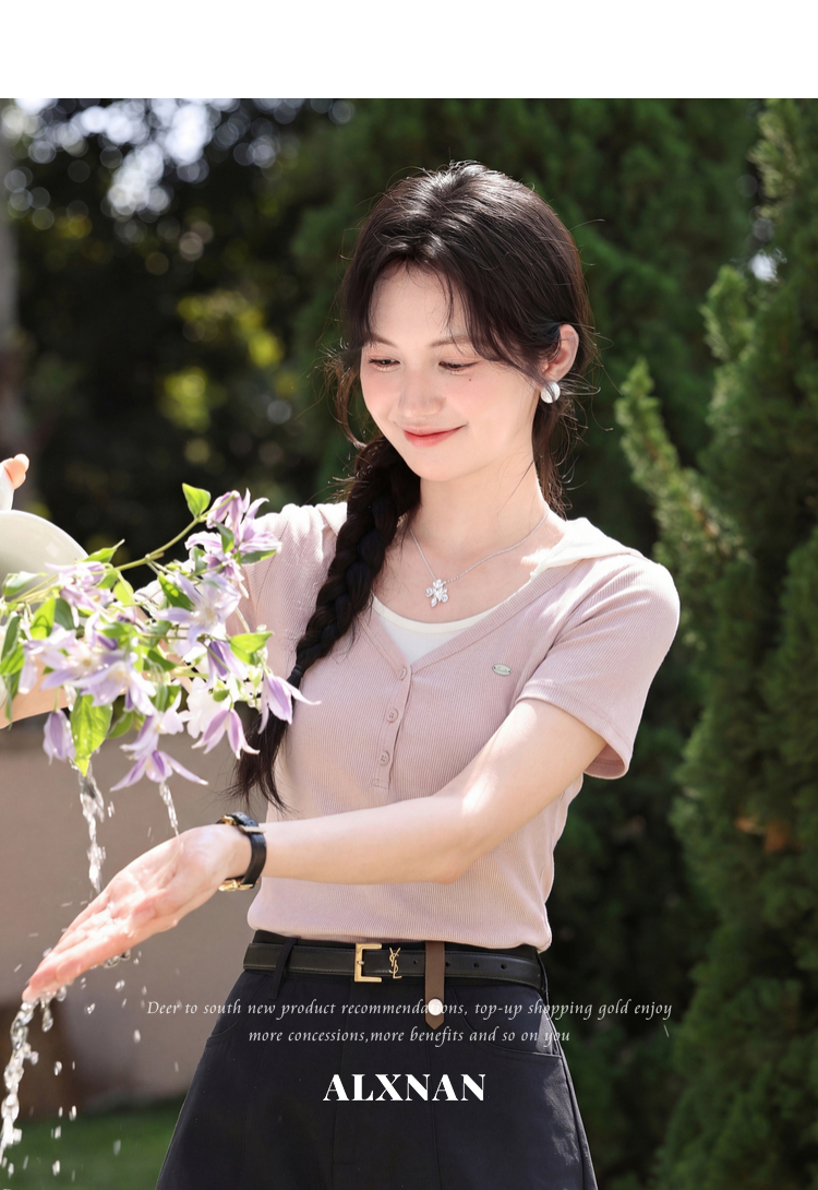 鹿向南【0405/20:00新品前1小时7折限量100件】假两件粉色T恤短袖