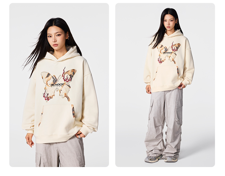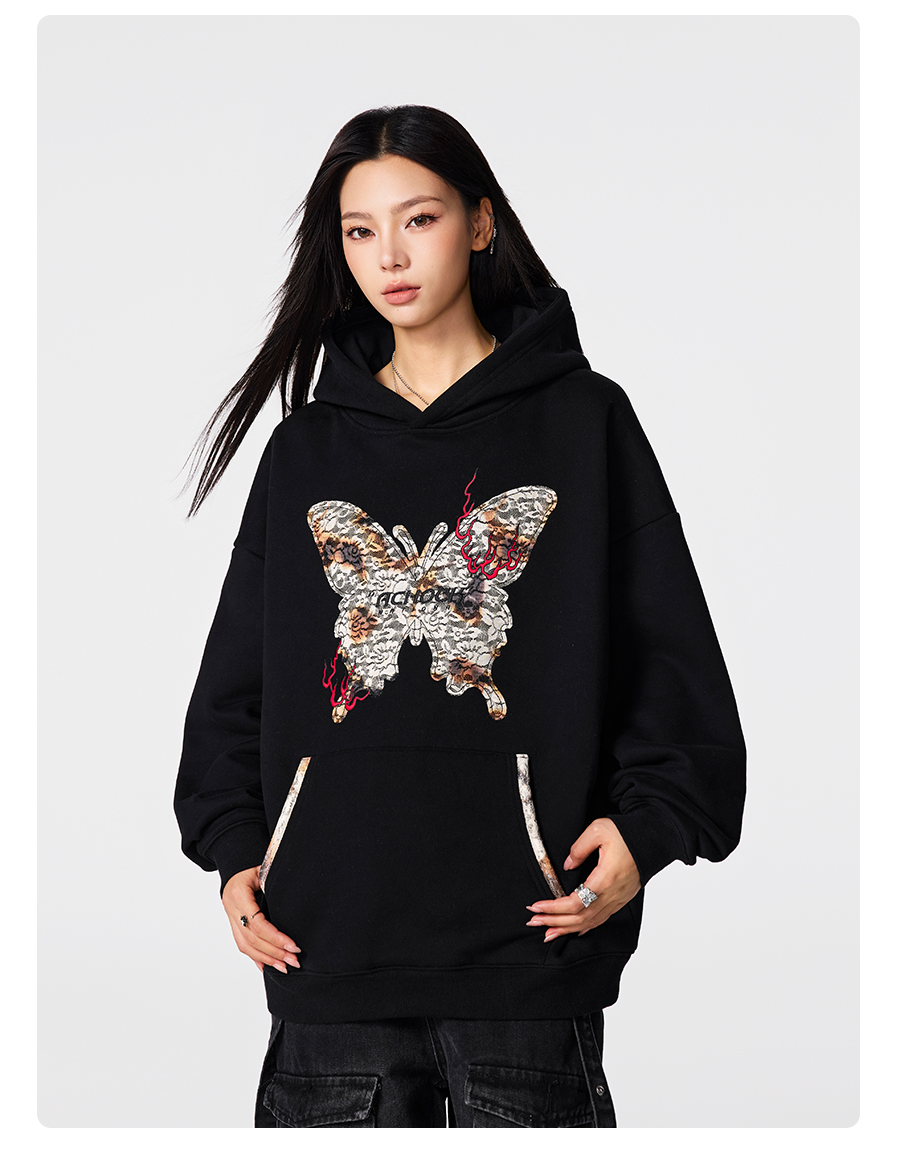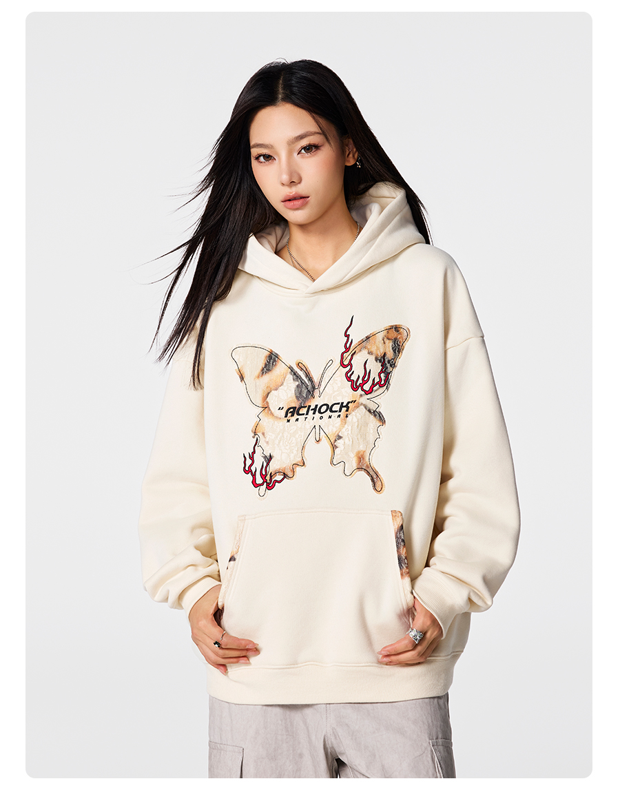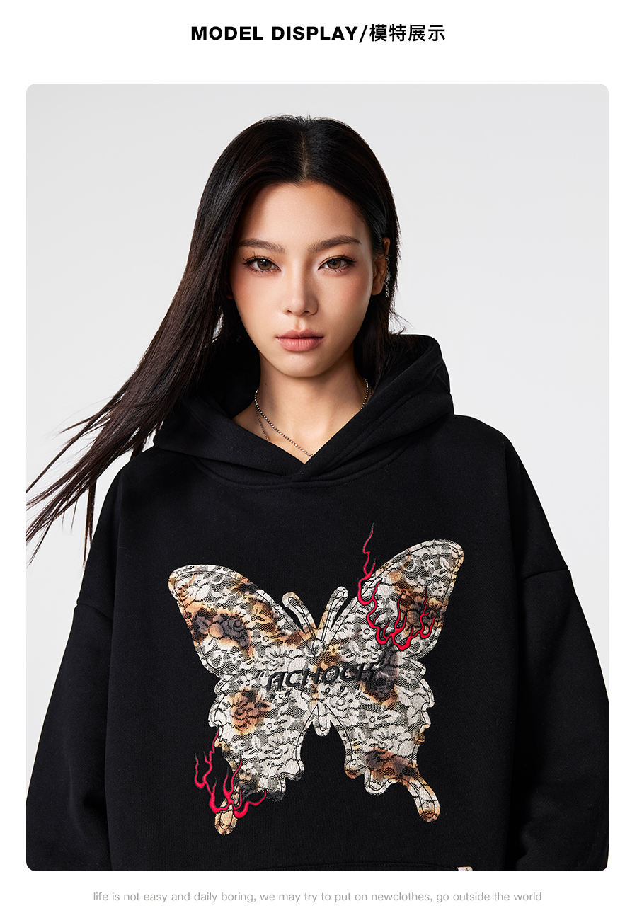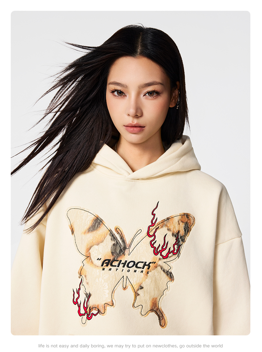【Achock官方店】蝴蝶烧花蕾丝贴布刺绣连帽卫衣美式潮牌帽衫卫衣