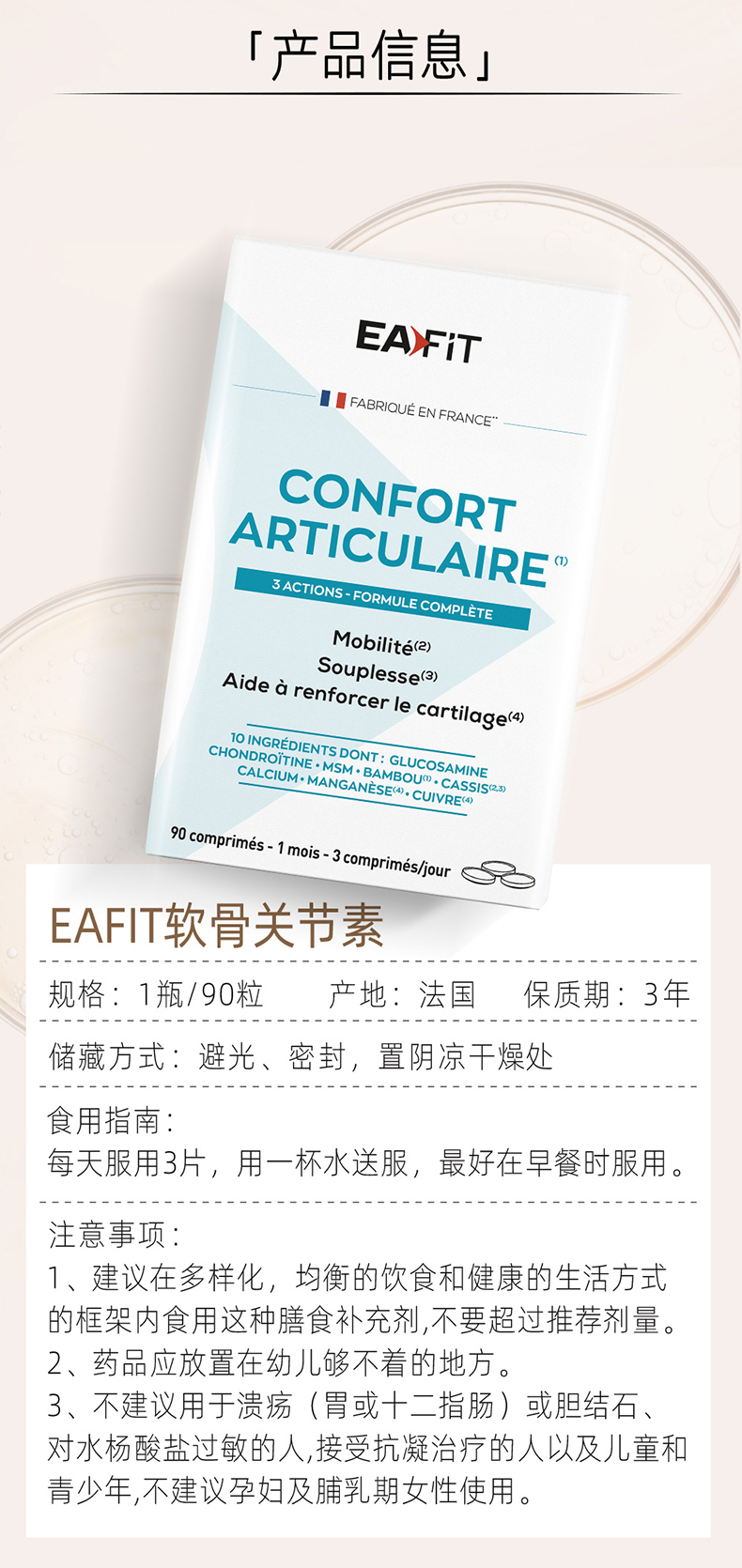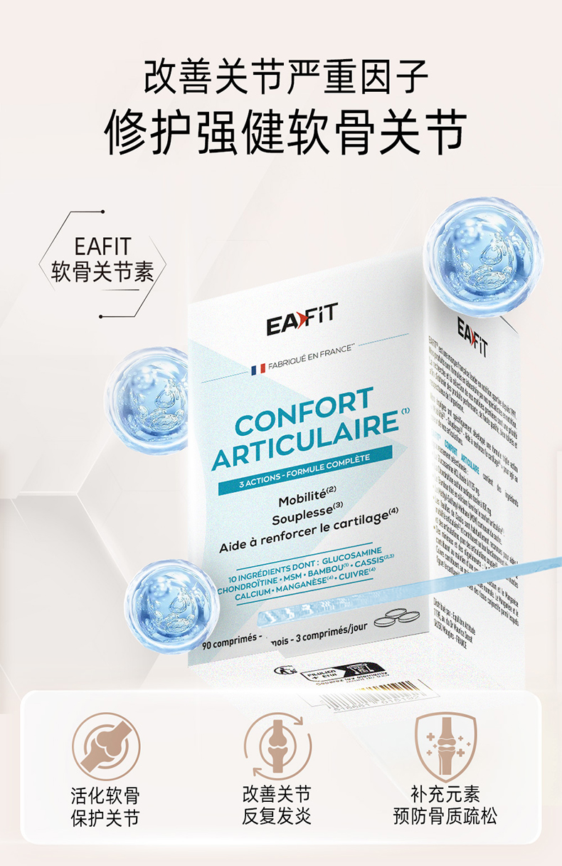 【限时秒杀】法国进口EAFIT软骨素片90粒装修护强健软骨关节补充元素预防骨质疏松(有效期至2026年6月1日)