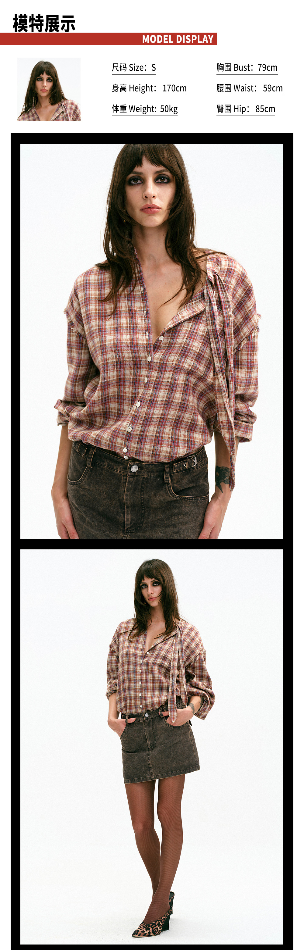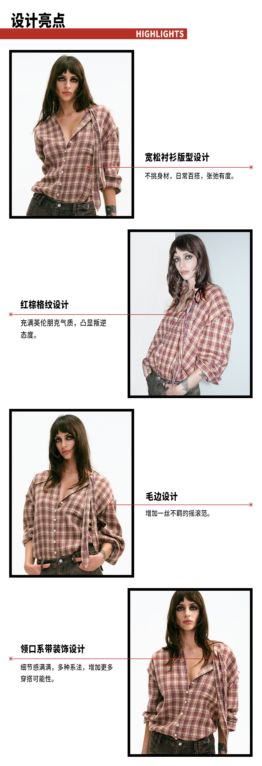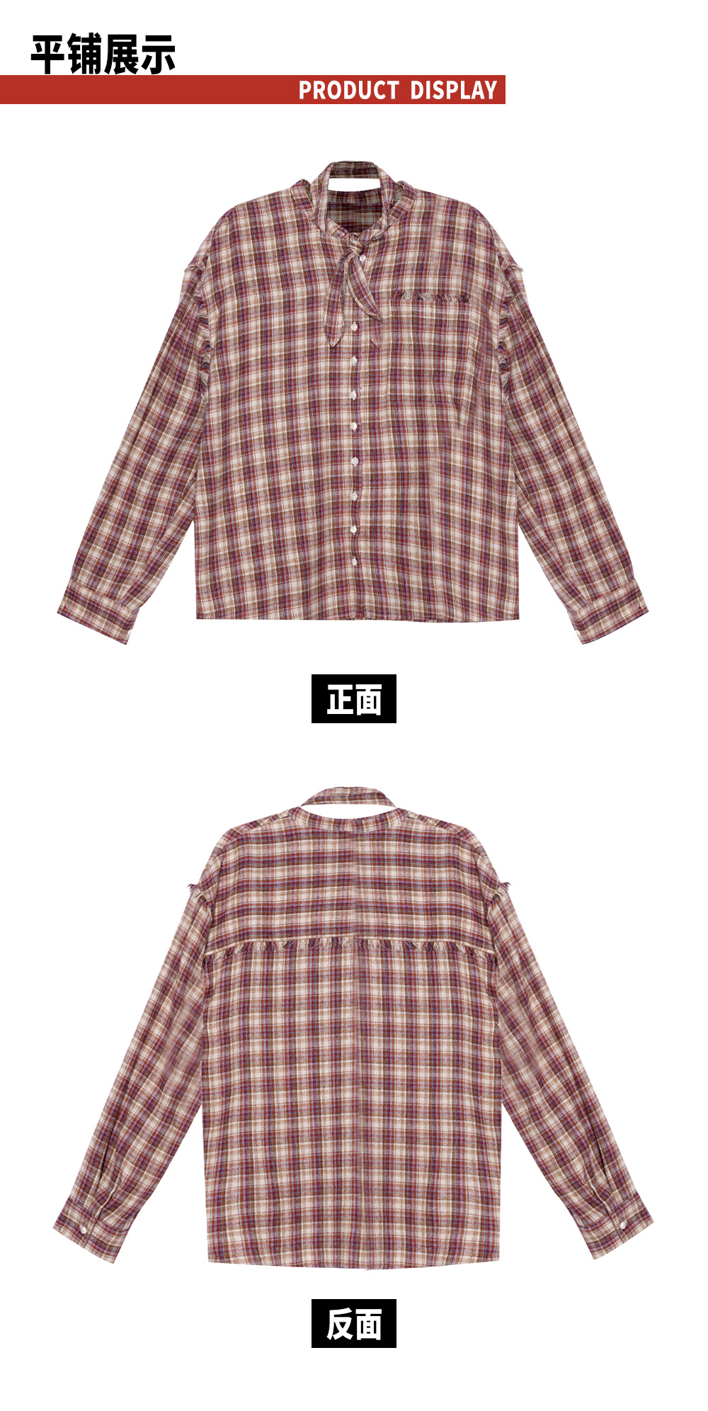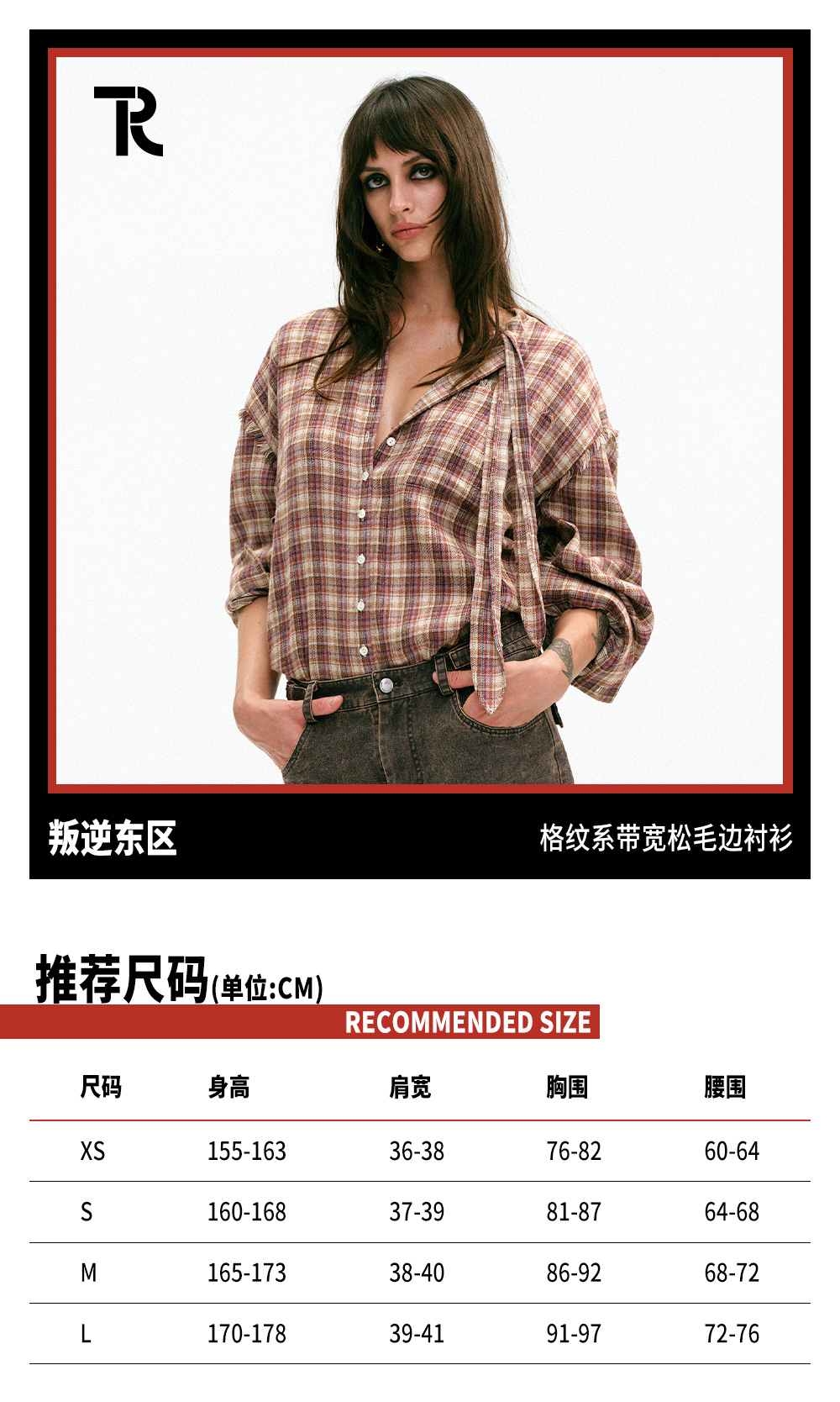 TR她热 叛逆东区 红棕格纹系带宽松百搭设计感毛边衬衫