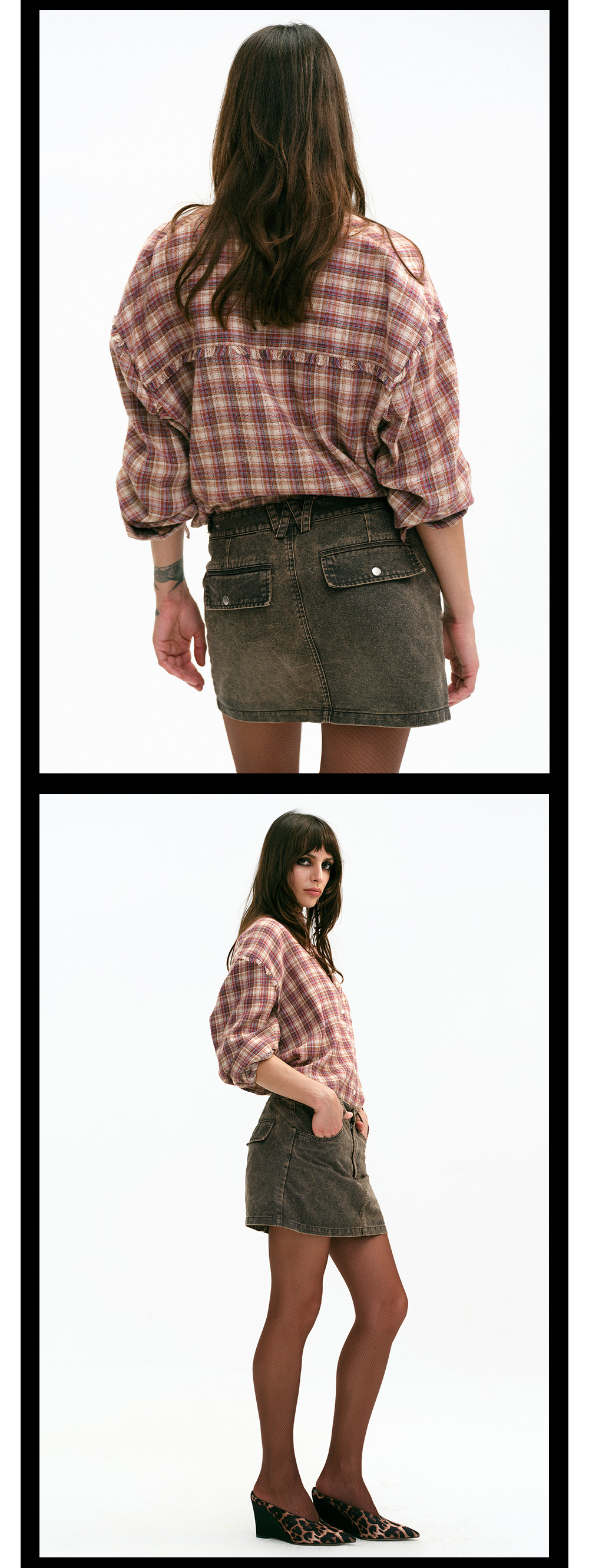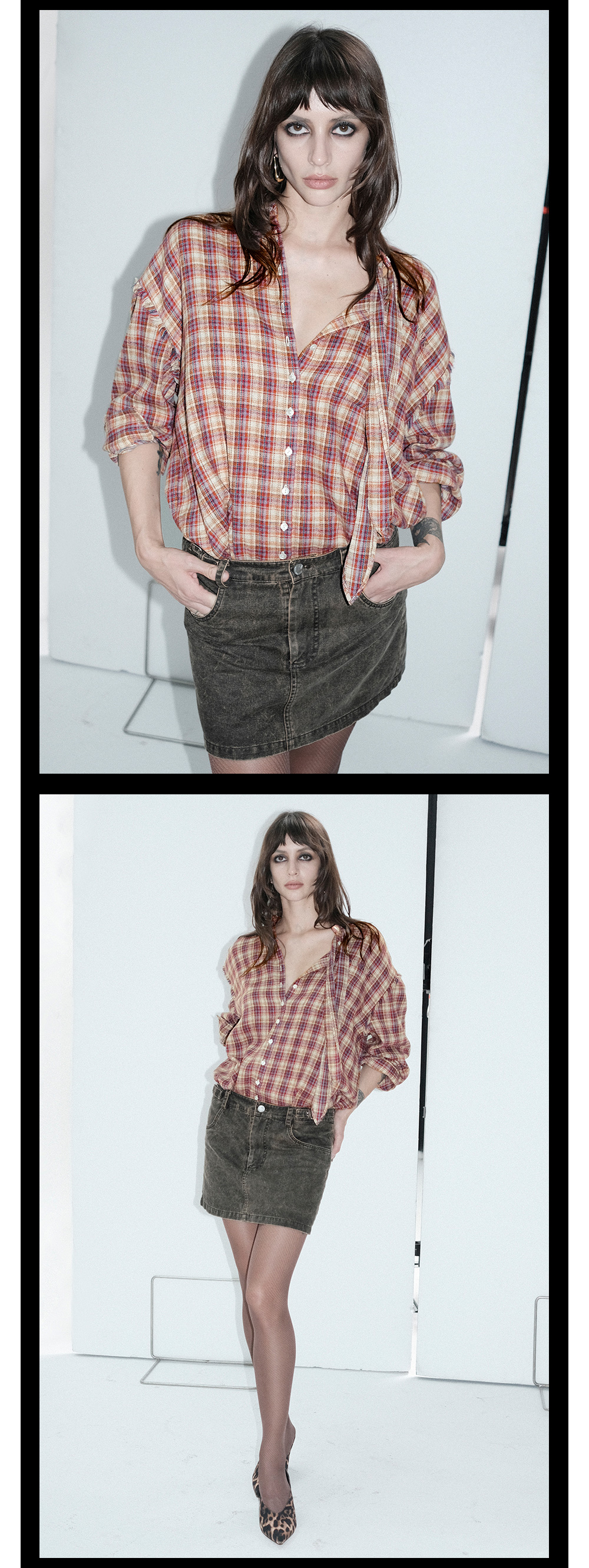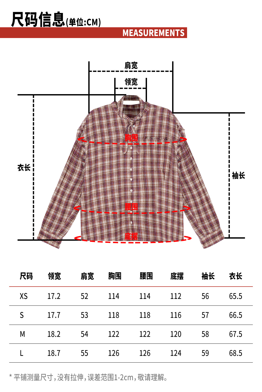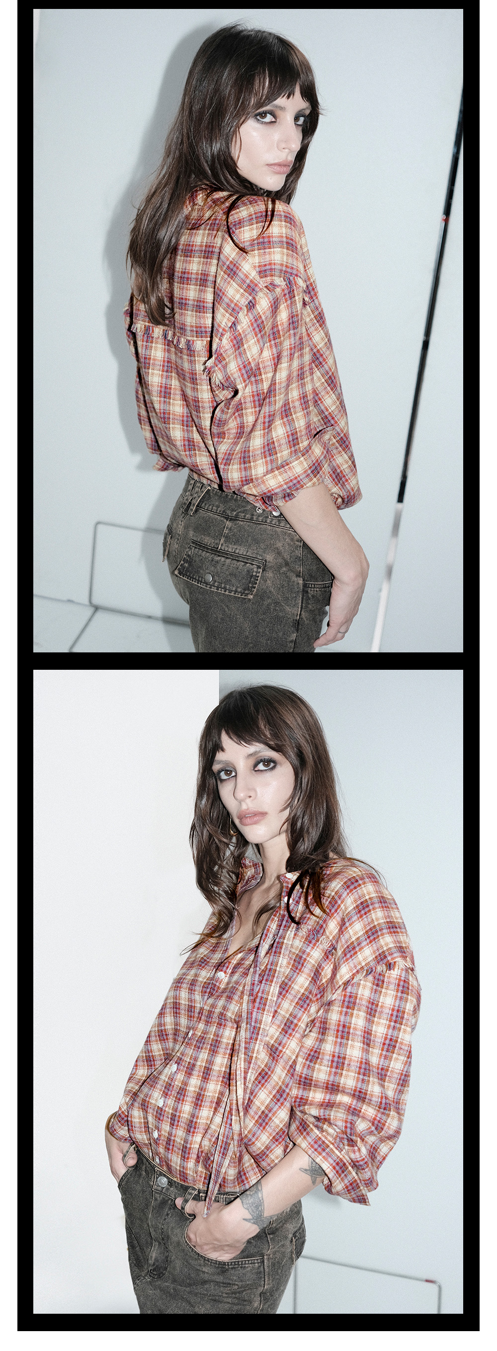 TR她热 叛逆东区 红棕格纹系带宽松百搭设计感毛边衬衫
