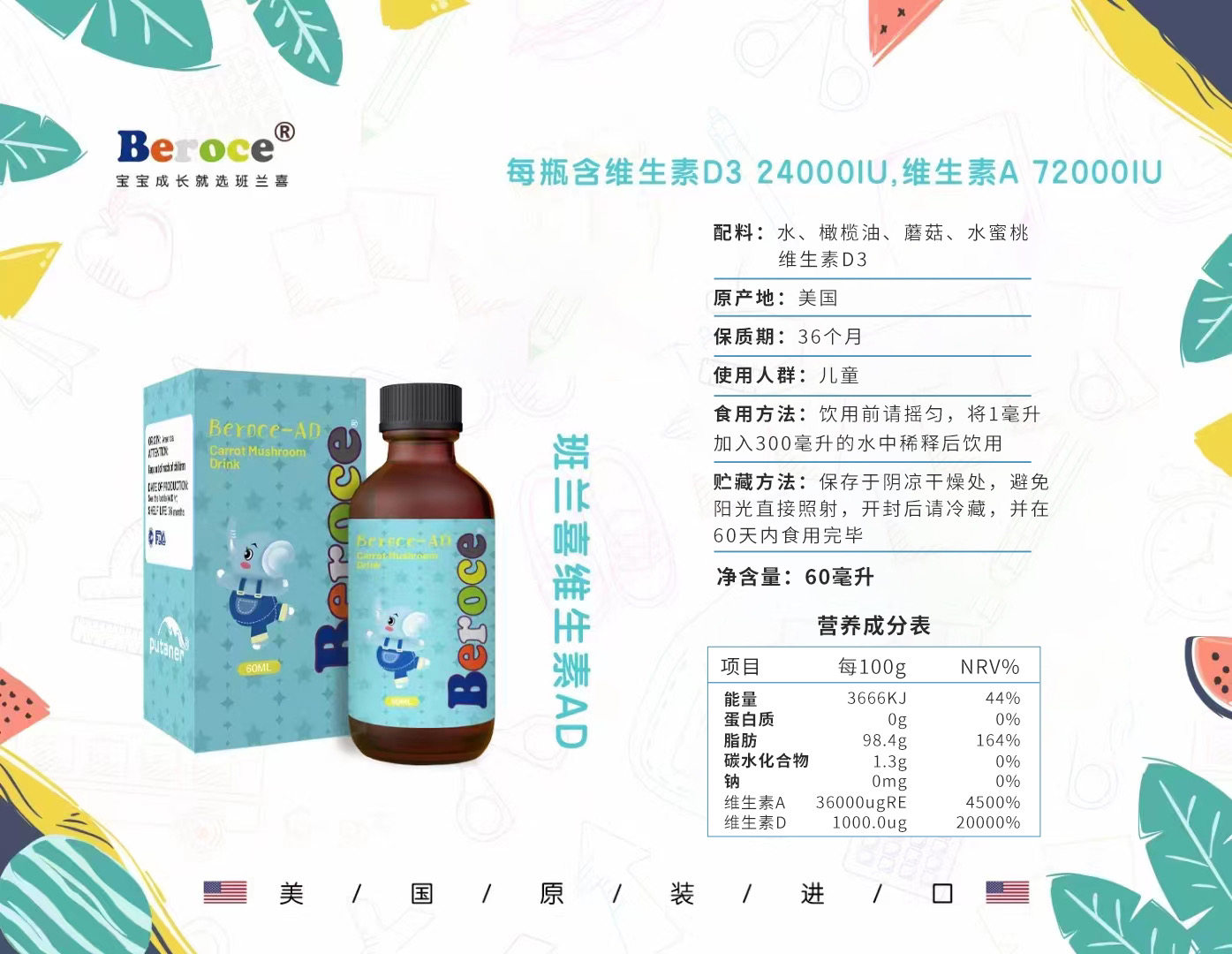 班兰喜 beroce维生素AD儿童胡萝卜滴液饮品60毫升美国进口