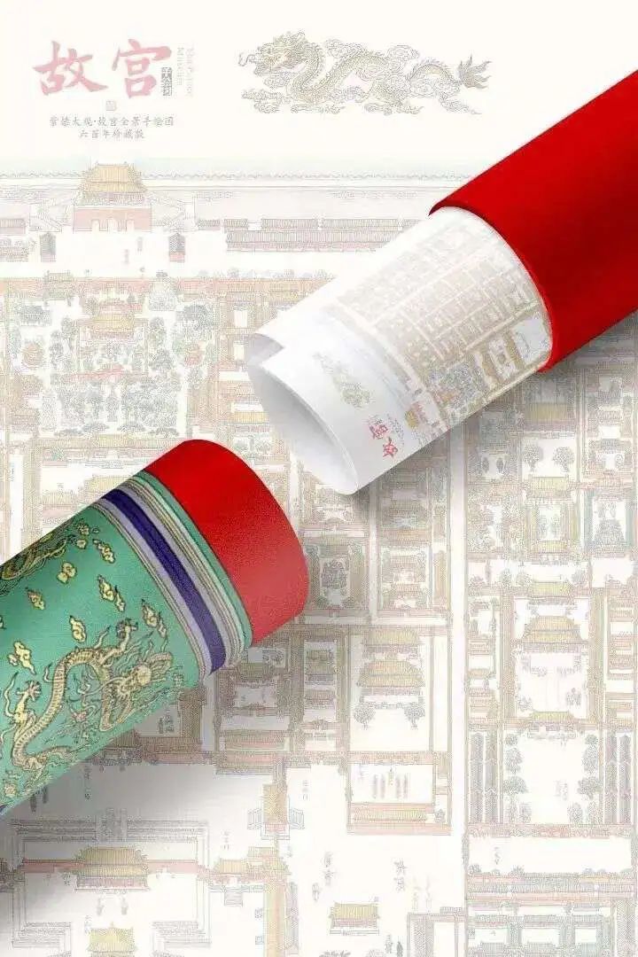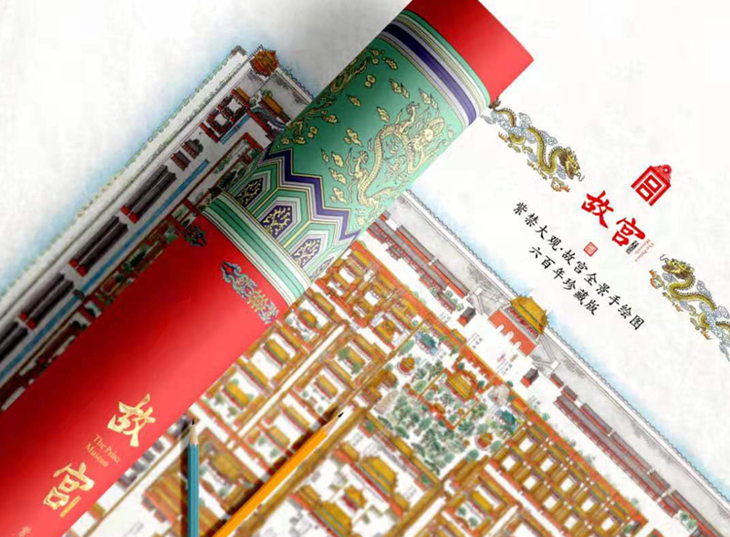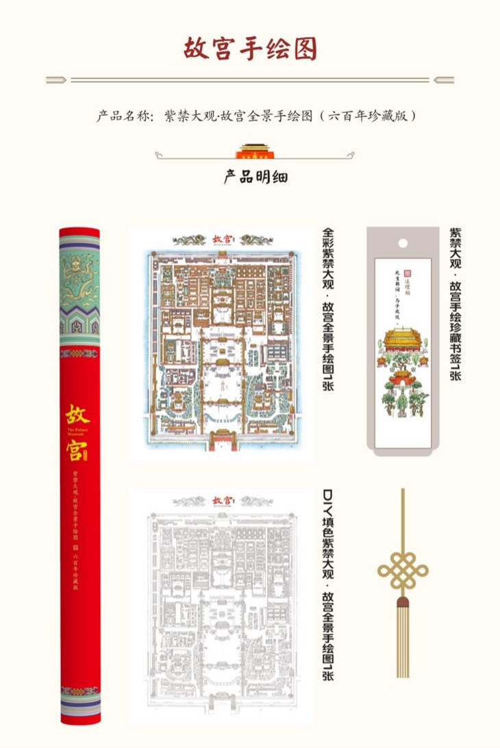 特别要说明的是《紫禁大观·故宫全景手绘图》的外包装,其设计灵感来源于紫禁城太和殿的金丝楠木柱。