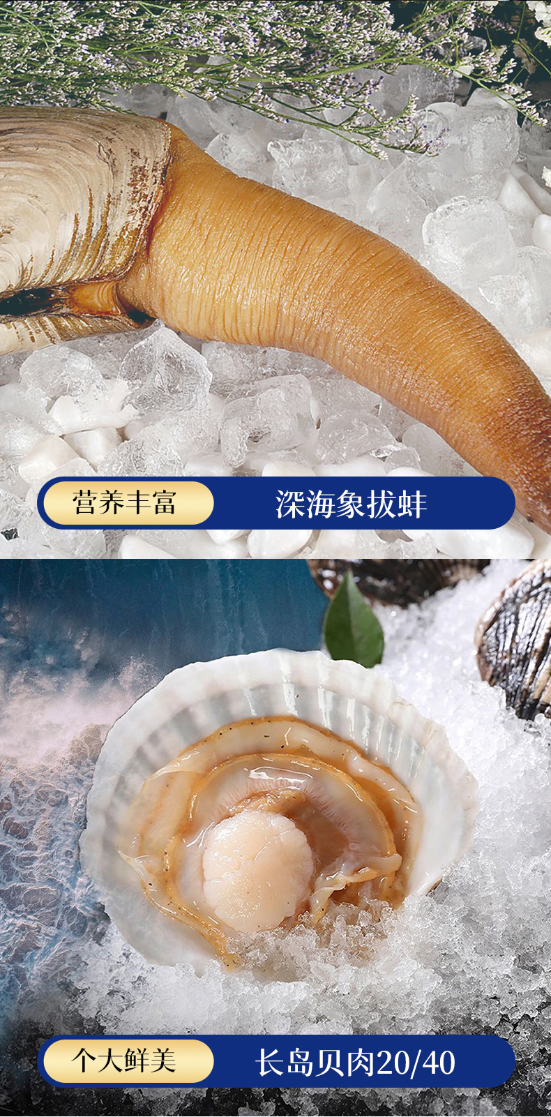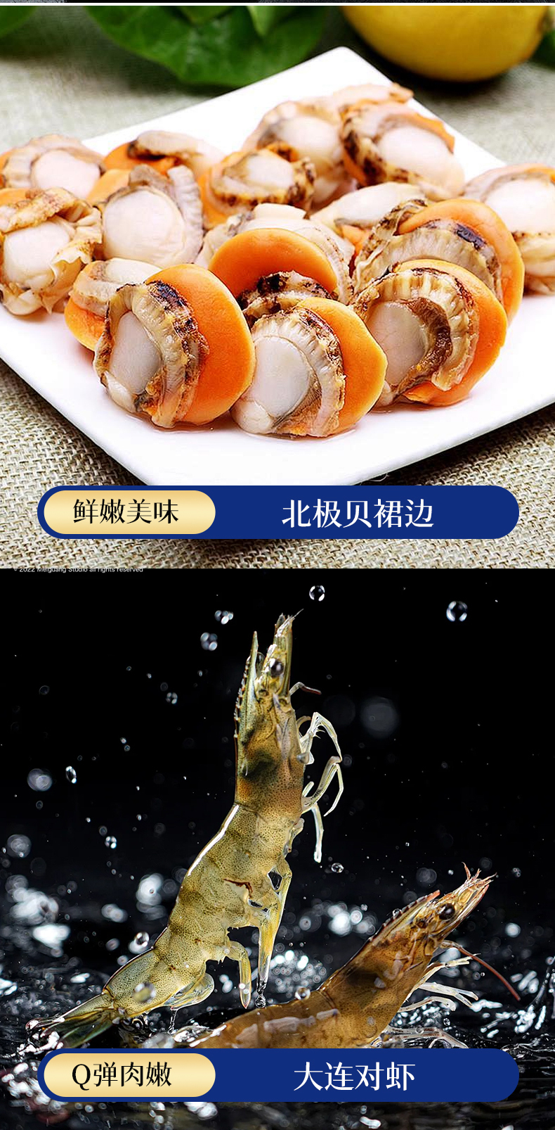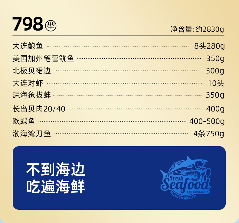 | 吉星高照798型 | 大连鲍鱼 8头280g 美国加州笔管鱿鱼 350g 北极贝裙边 300g 大连对虾 10头 深海象拔蚌 350g 长岛贝肉20/40 400g 欧蝶鱼 400-500g 渤海湾刀鱼 4条750g |
