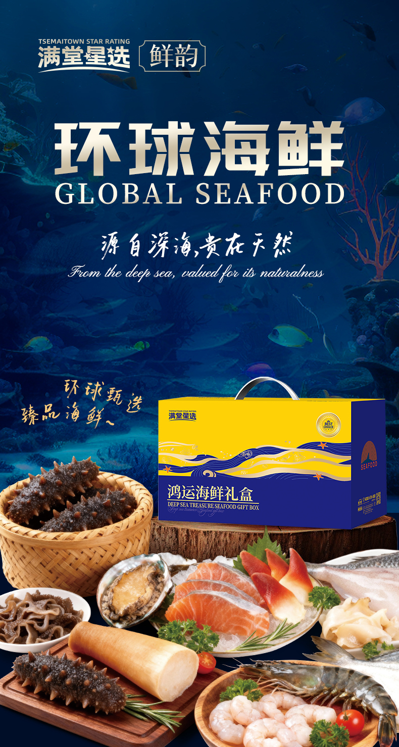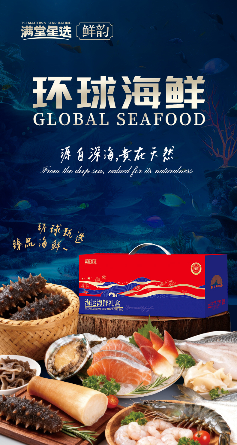 | 喜气盈门1098型 | 大连海参 6头250g 刺身三文鱼 250g 大连鲍鱼 12头 8个 海参斑鱼 1500g 美国加州笔管鱿鱼350g 深海象拔蚌 350g 北极贝裙边 300g 黑虎对虾 10只 大连青虾仁 250g 欧鲽鱼 450-500g |