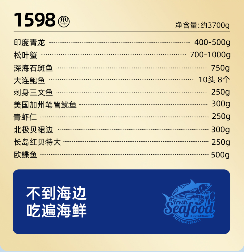 | 龙凤呈祥1598型 | 印度青龙 400-500g 松叶蟹 700-1000g 深海石斑鱼 750g 大连鲍鱼 10头 8个 刺身三文鱼 250g 美国加州笔管鱿鱼 300g 青虾仁 250g 北极贝裙边 300g 长岛红贝特大 250g 欧鲽鱼 500g |