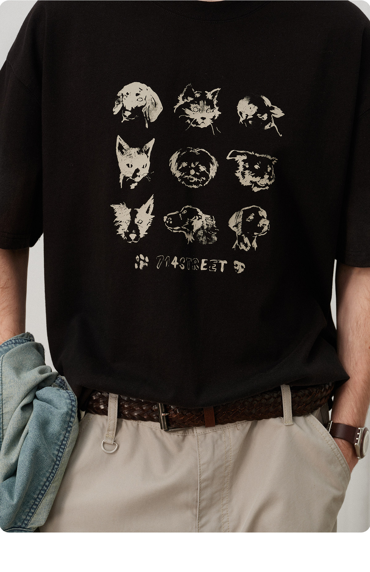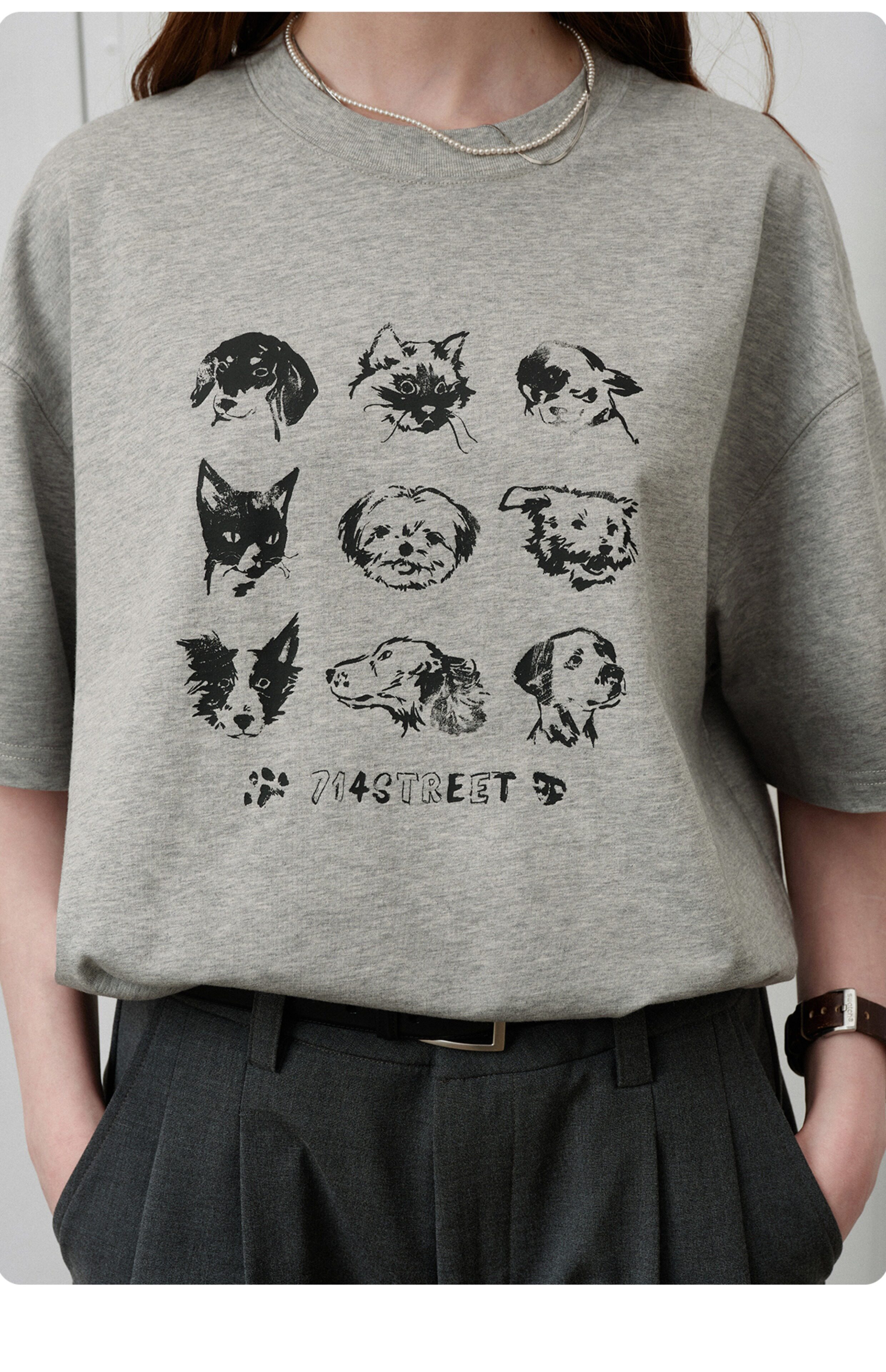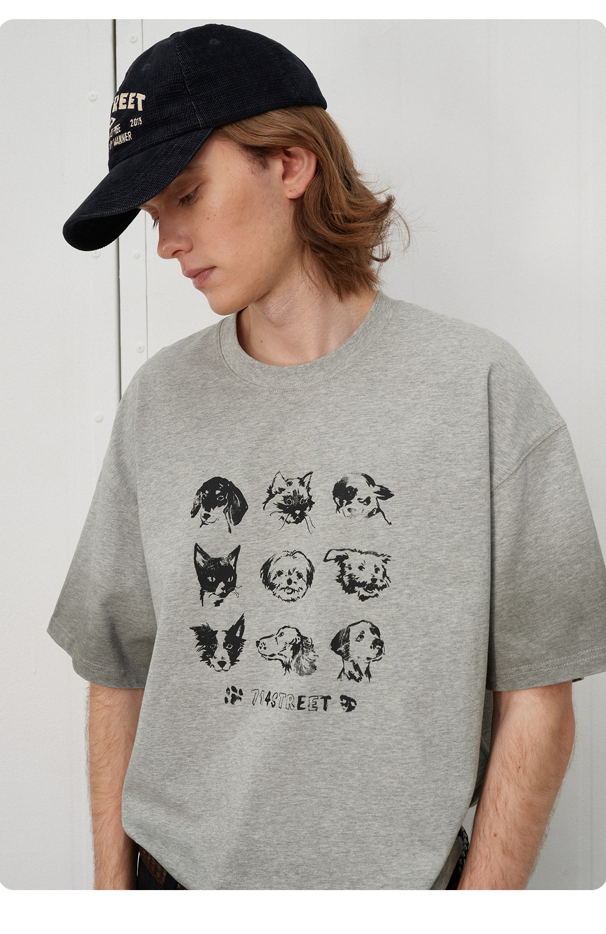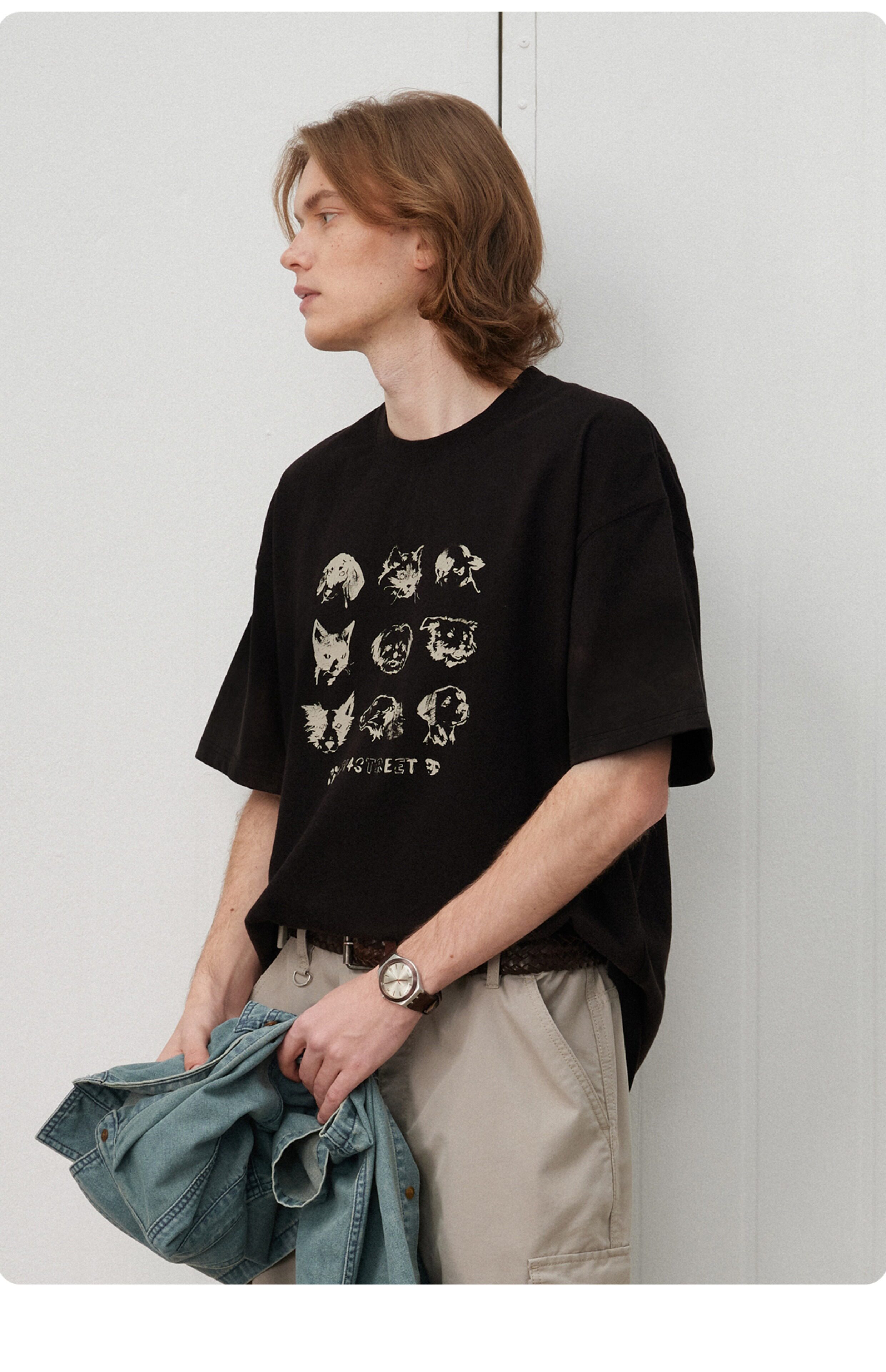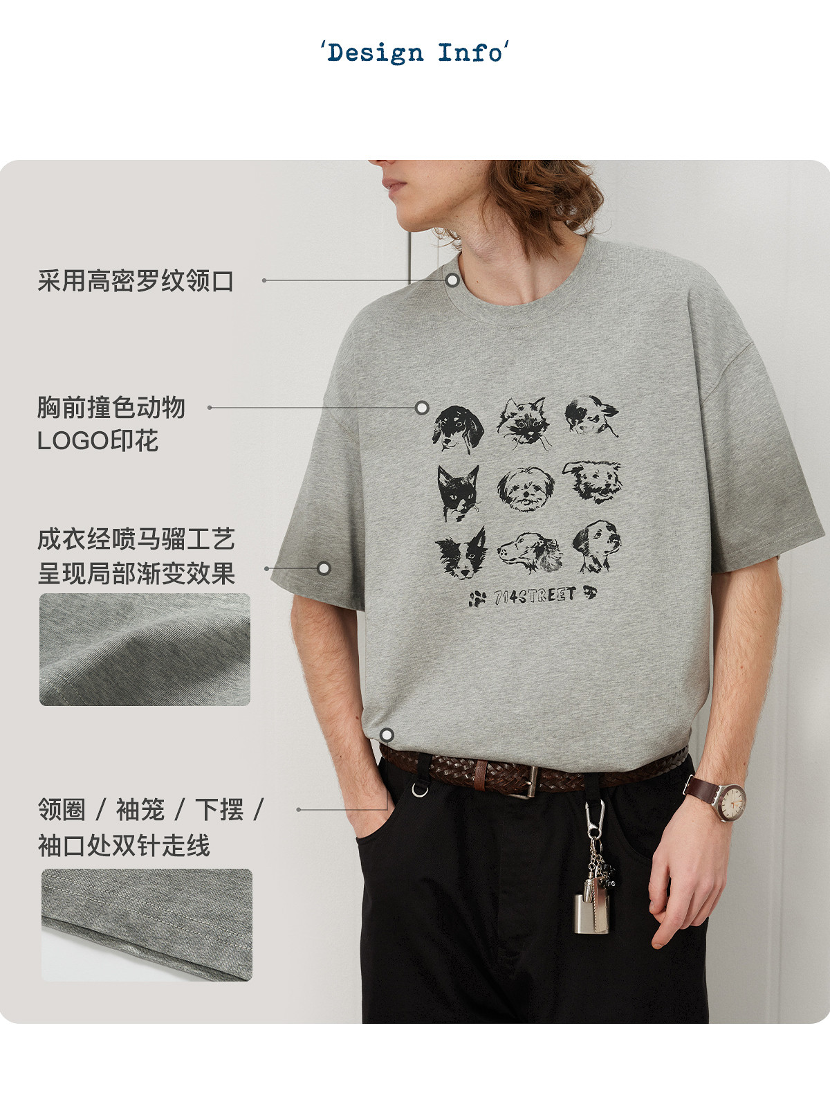 714street夏季美式复古水洗做旧动物印花插肩短袖T恤男情侣款上衣