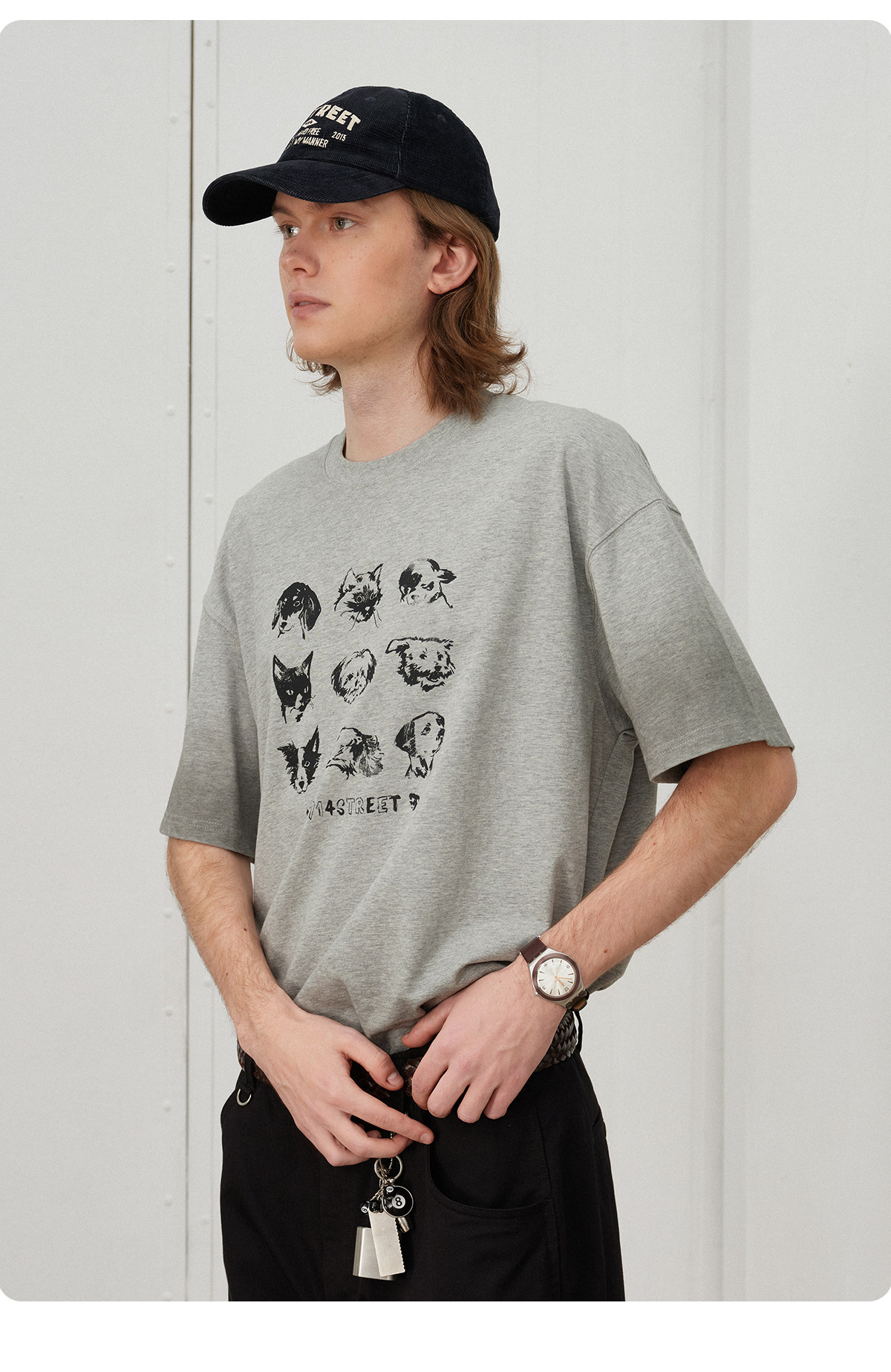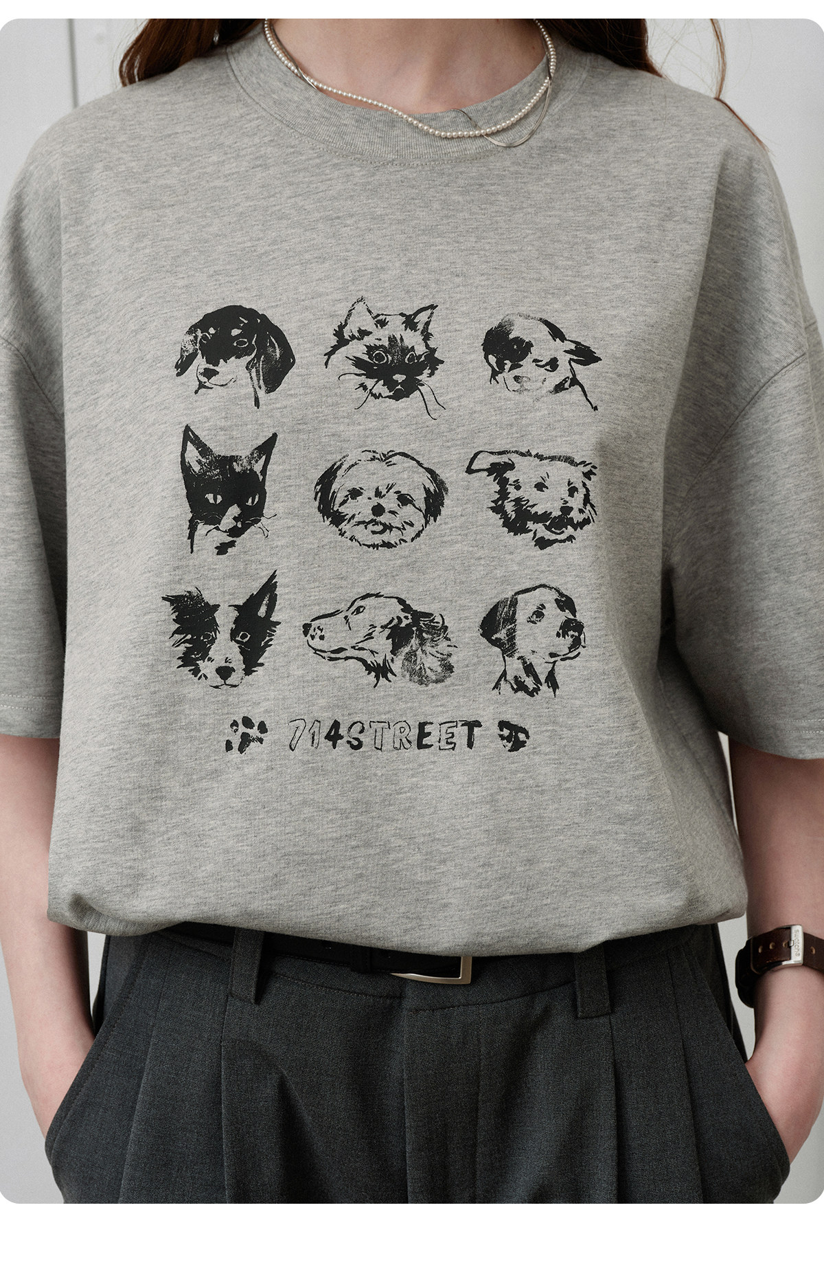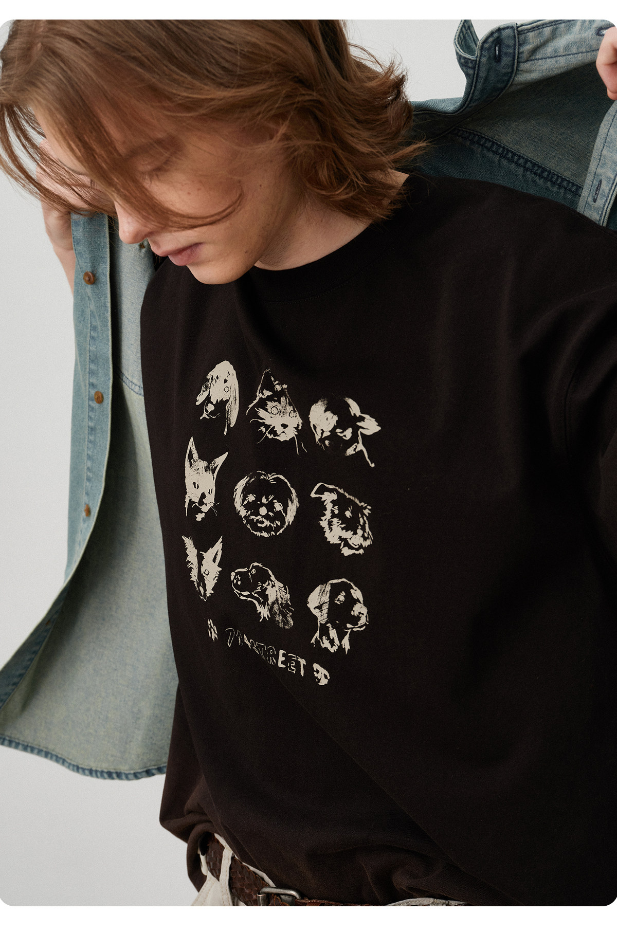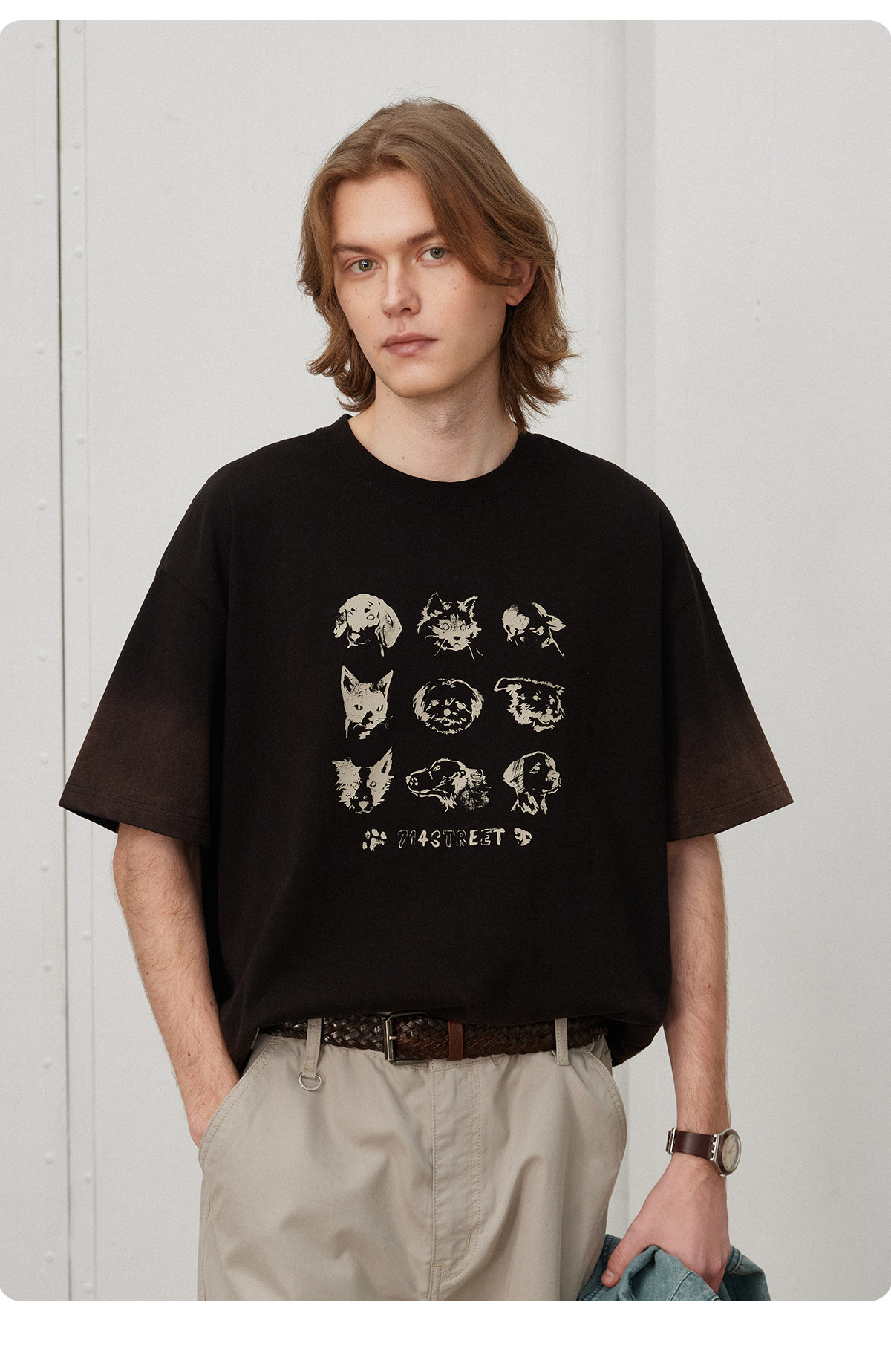 714street夏季美式复古水洗做旧动物印花插肩短袖T恤男情侣款上衣