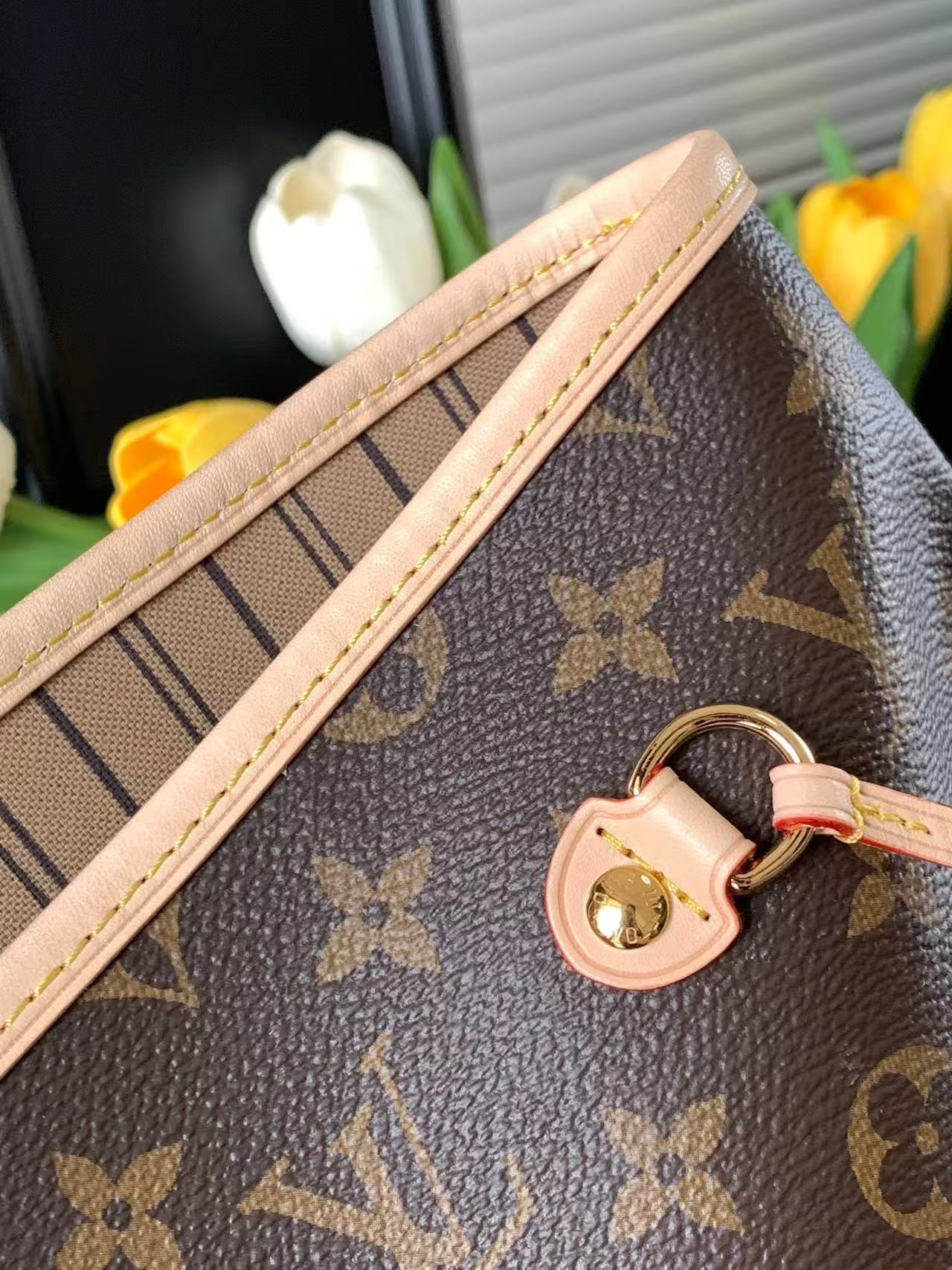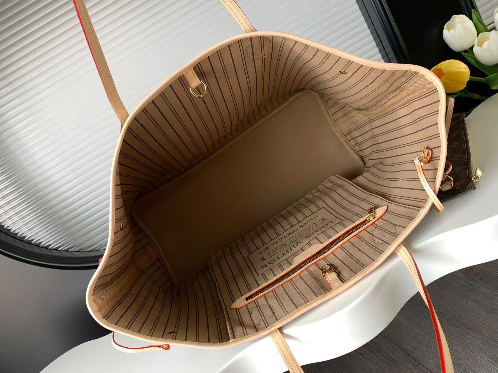 Neverfull手袋,重新设计的内袋采用了清新的织物内衬和灵感源自路易威登档案馆的复古细节,最值得称道的莫过于可脱卸式拉链手包,它既可单独作为一只精致手拿包使用,亦可作为额外的口袋。 明快的内衬色调为 Monogram 经典帆布增加了更多活泼生动之感。尺寸:大号39.0 x 32.0 x 19.0cm
