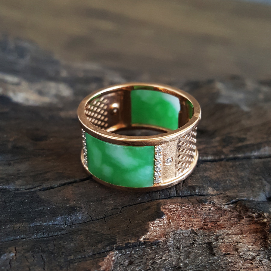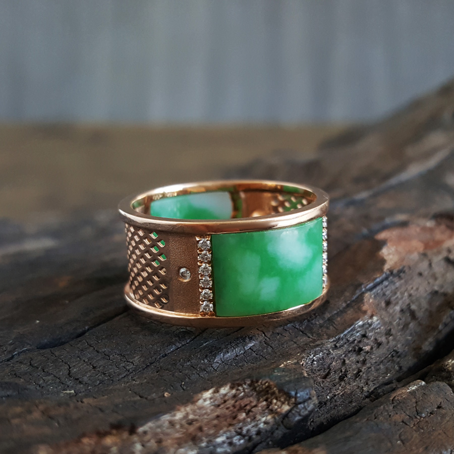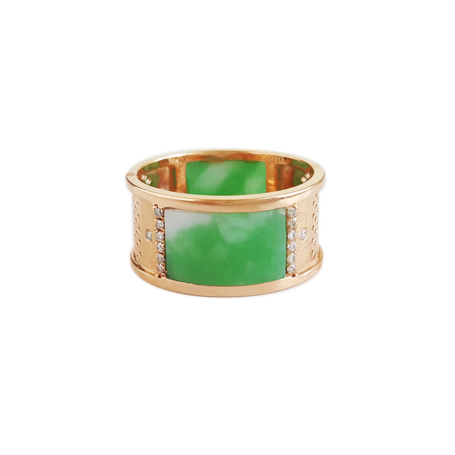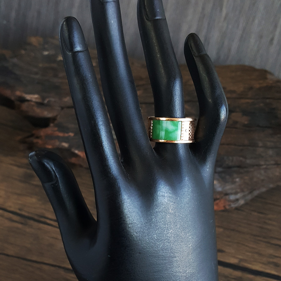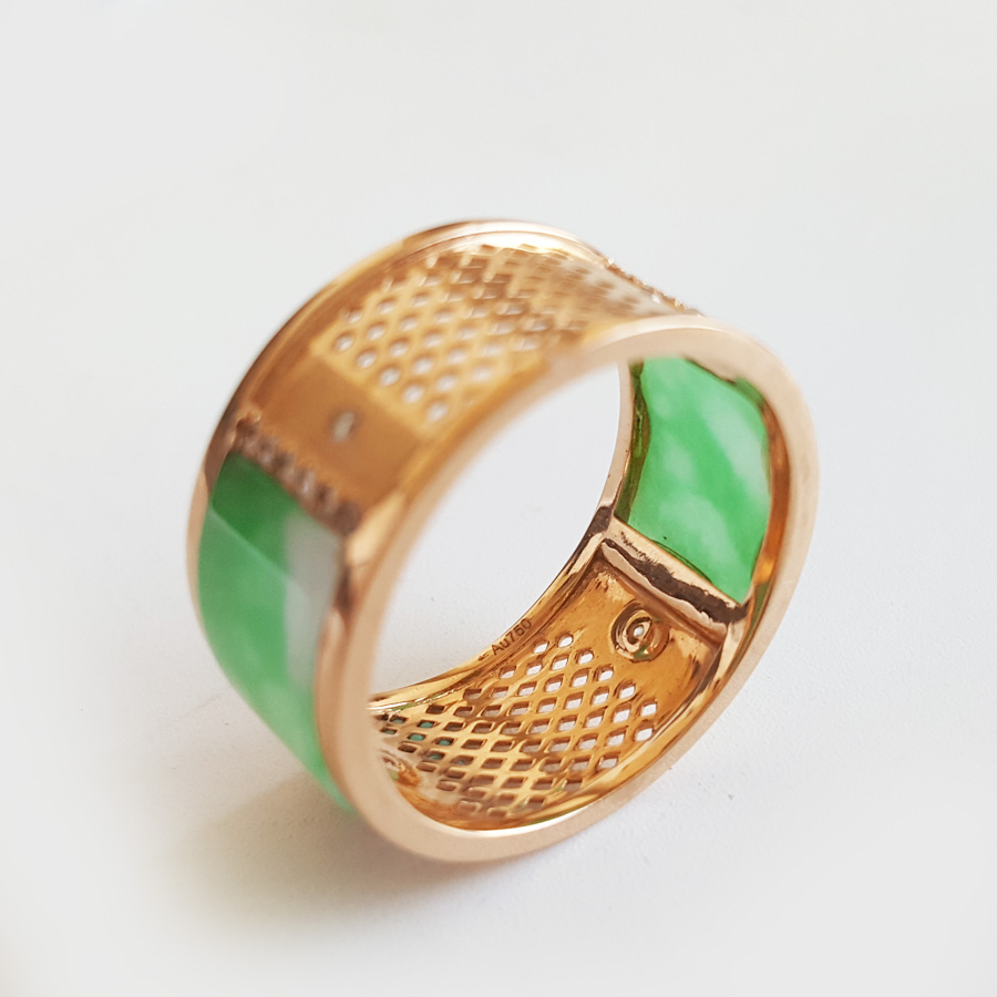 【二手正品】AU750玫瑰金镶钻镶糯种绿色翡翠宫廷风镂空宽版戒指指环20号130324NJM12