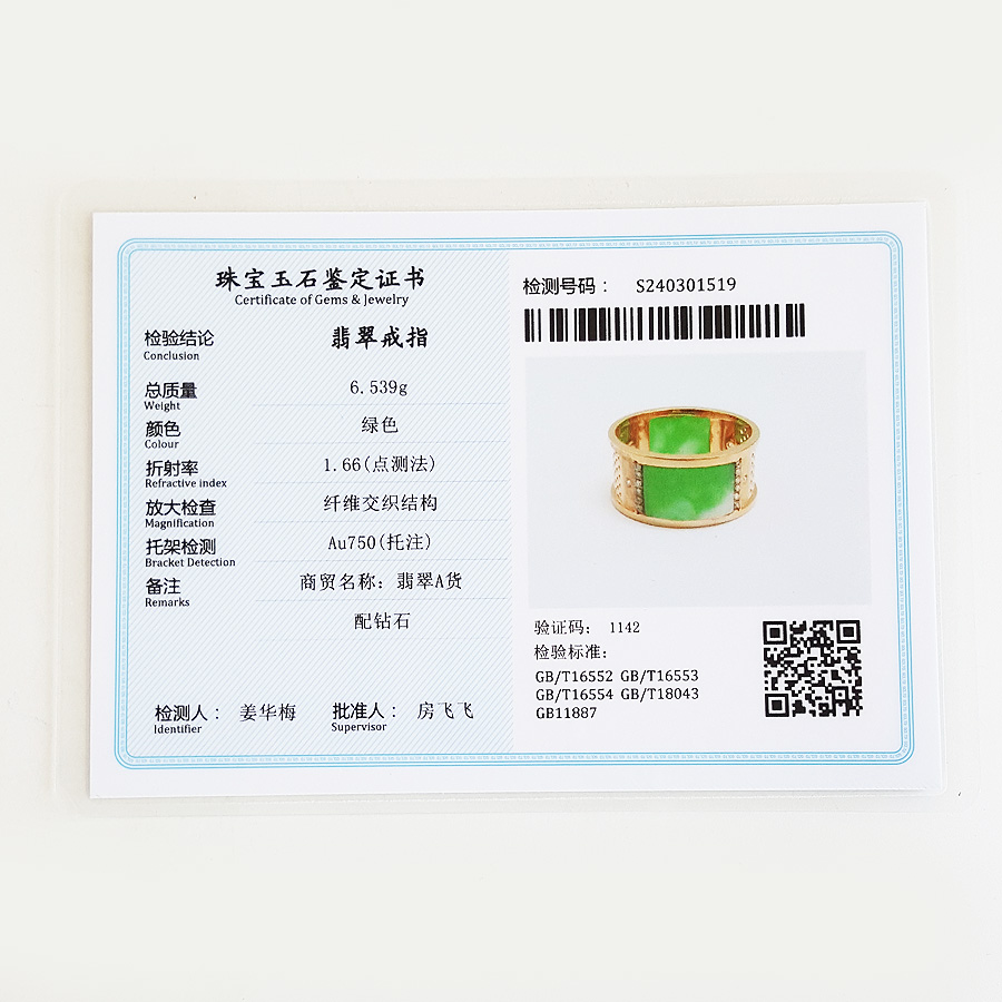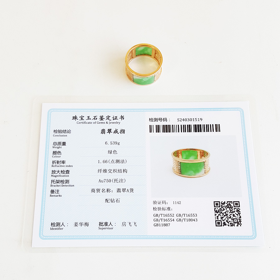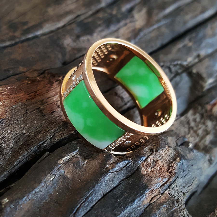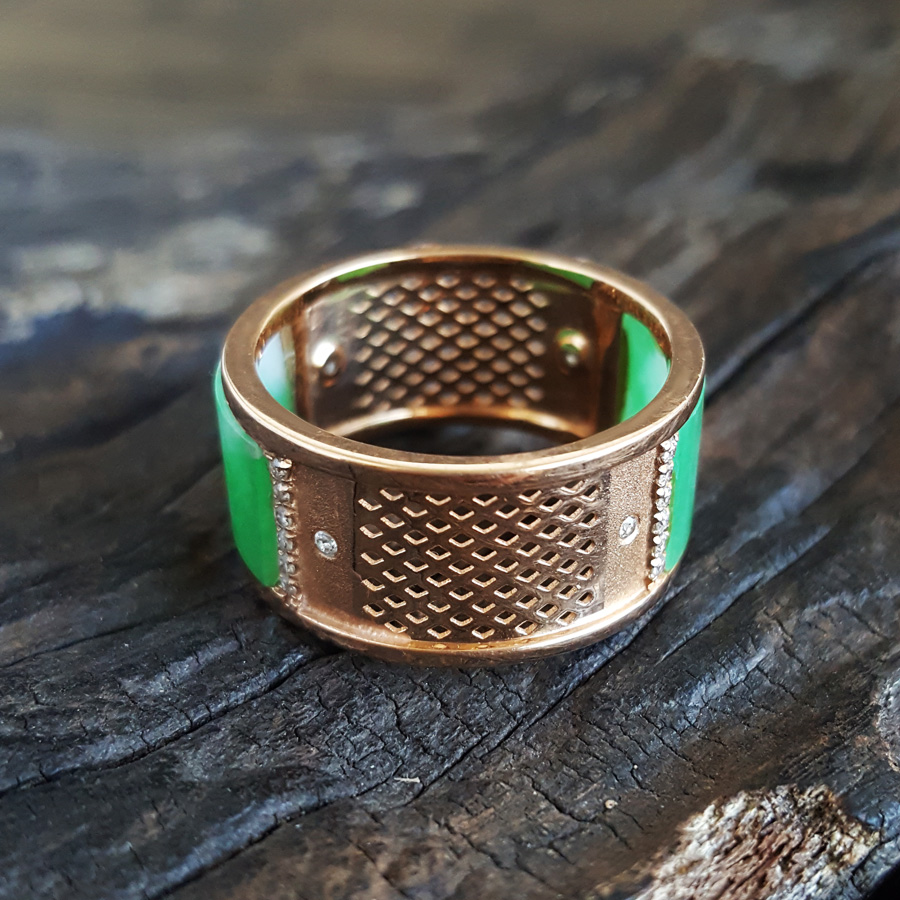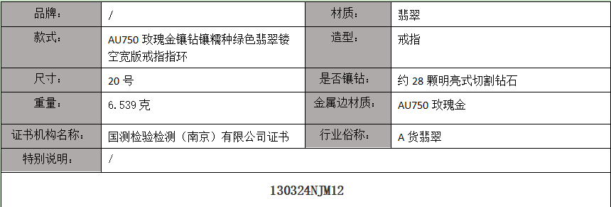 【二手正品】AU750玫瑰金镶钻镶糯种绿色翡翠宫廷风镂空宽版戒指指环20号130324NJM12