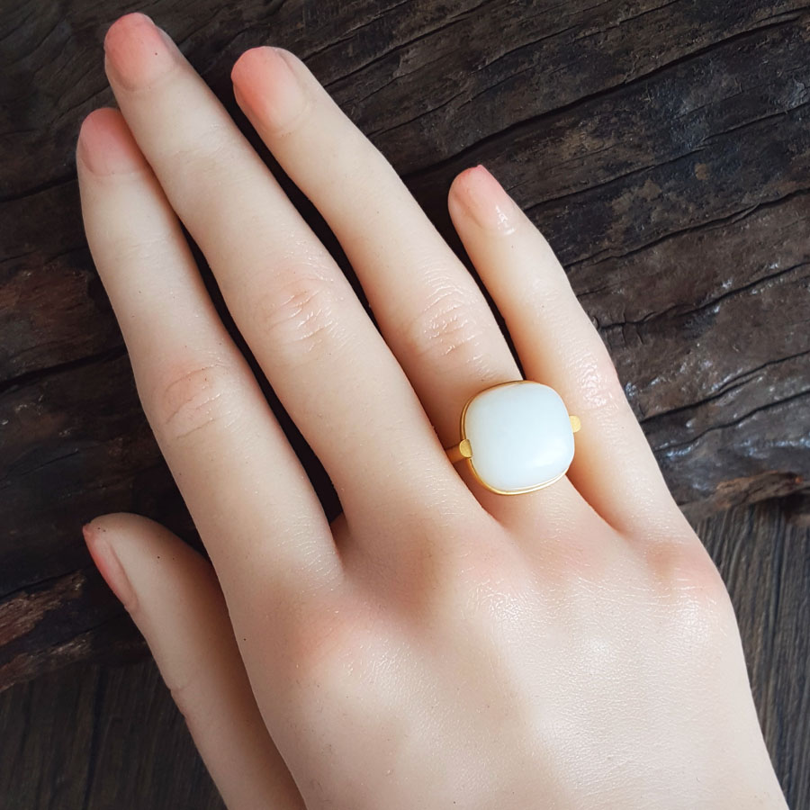 【天然正品】AU750黄金镶天然细腻新疆籽料一级白油润度佳蛋面和田玉戒指14.8*14.6MM(皆取最大值)16号(戒圈可改)060126NJ36
