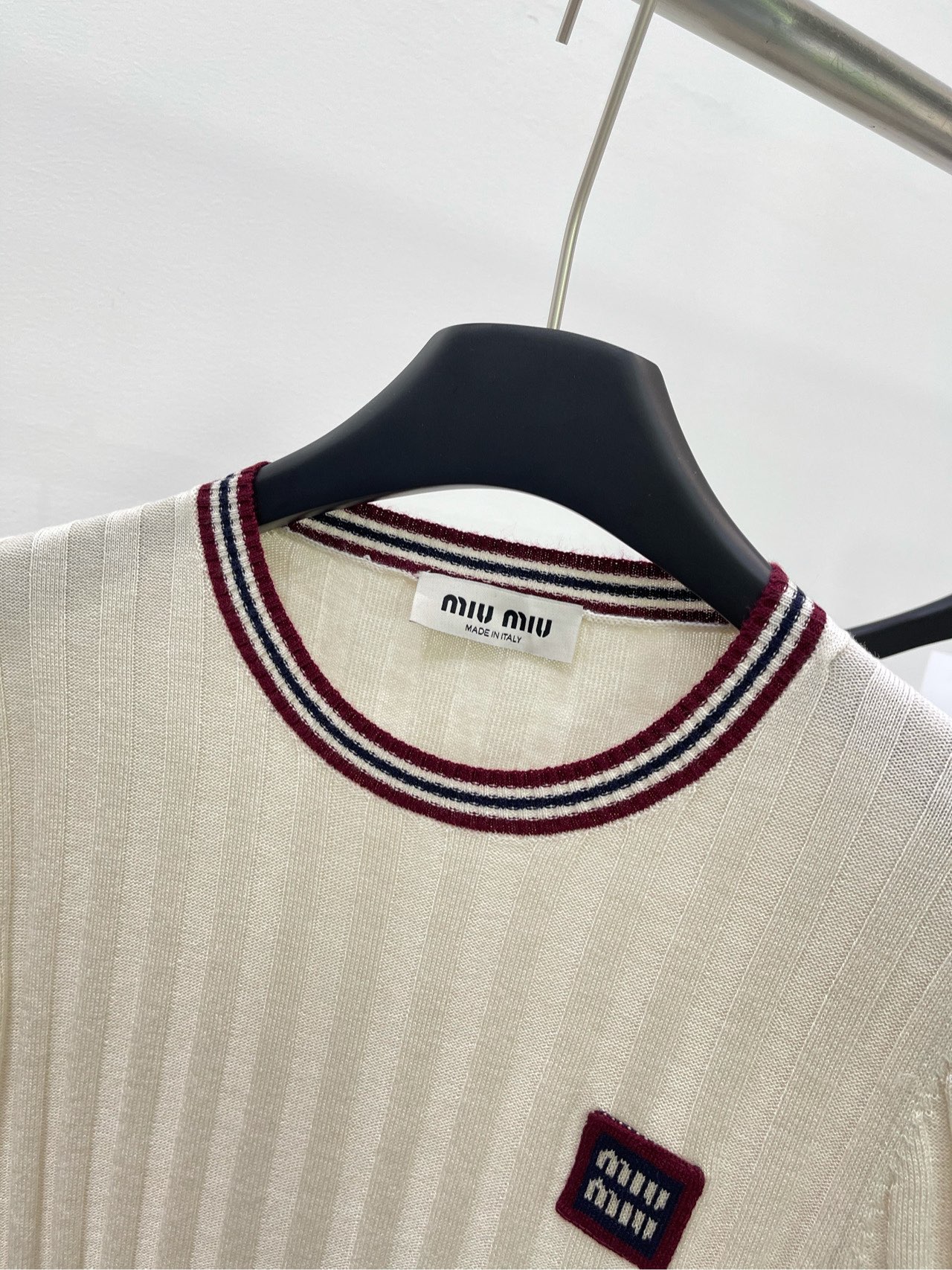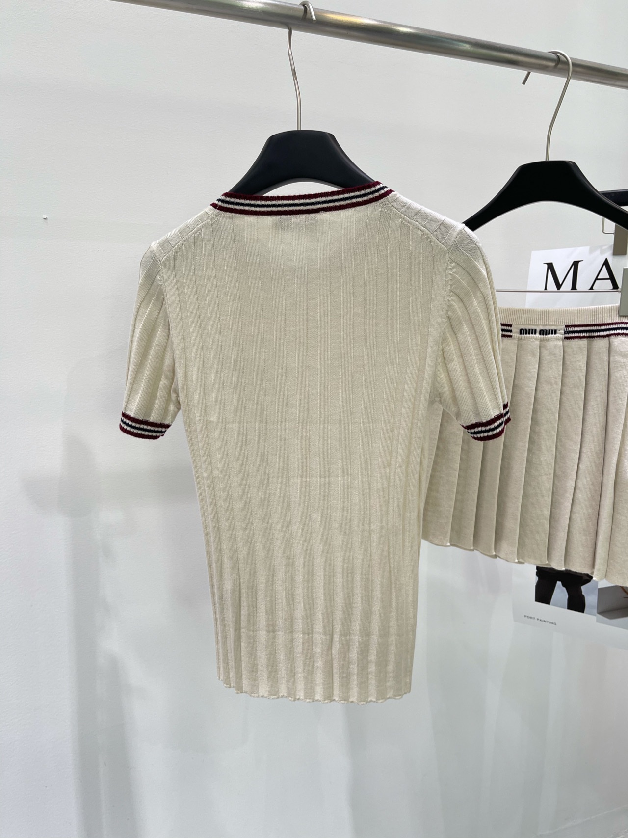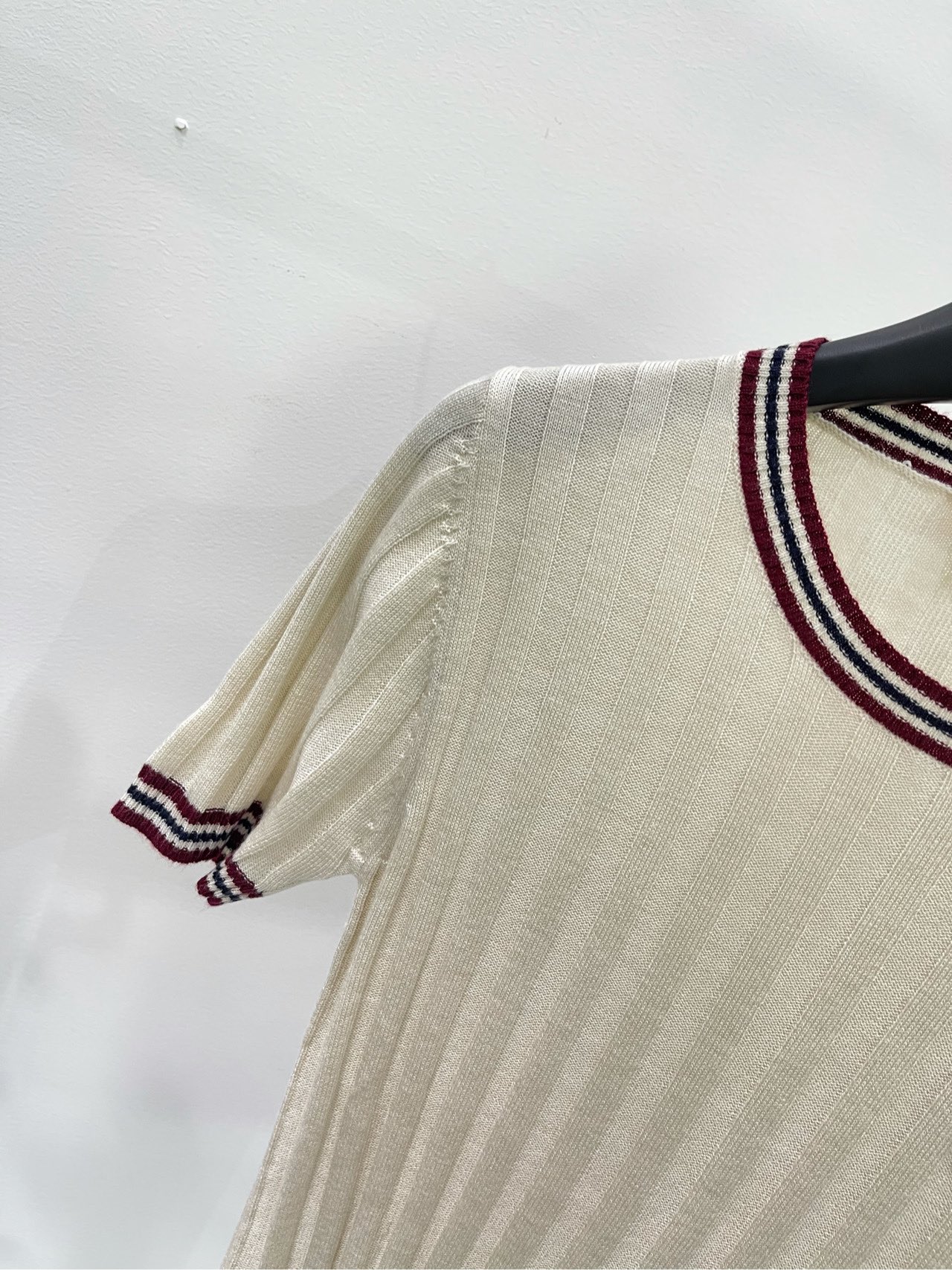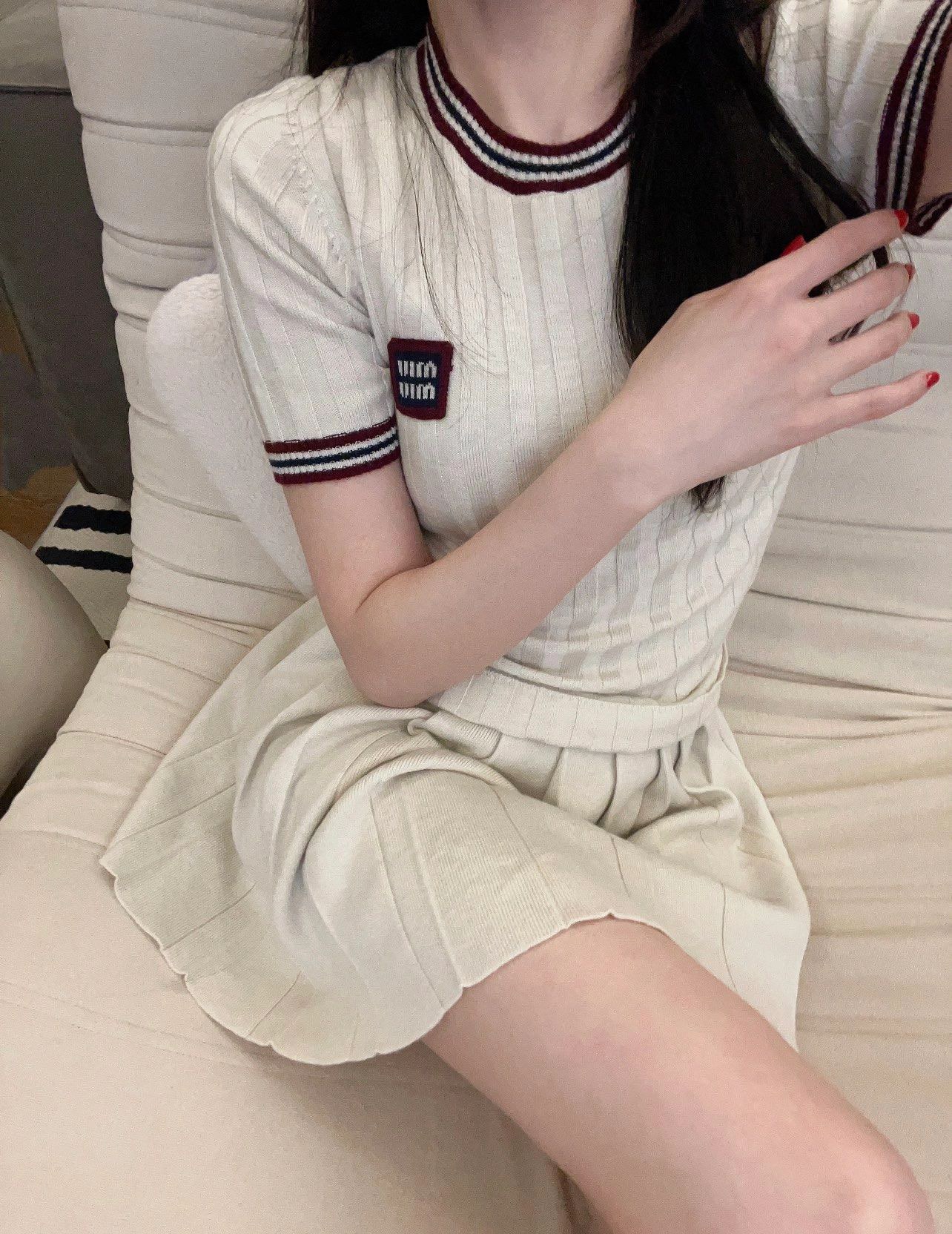 缪家杏色红边圆领针织短袖