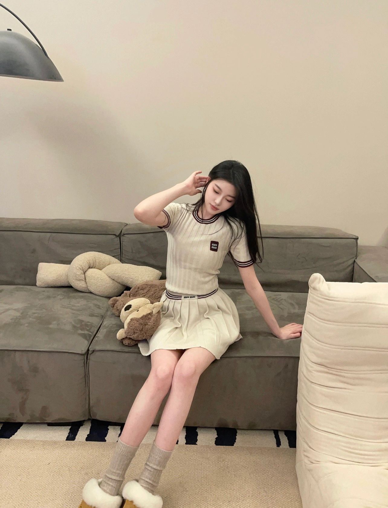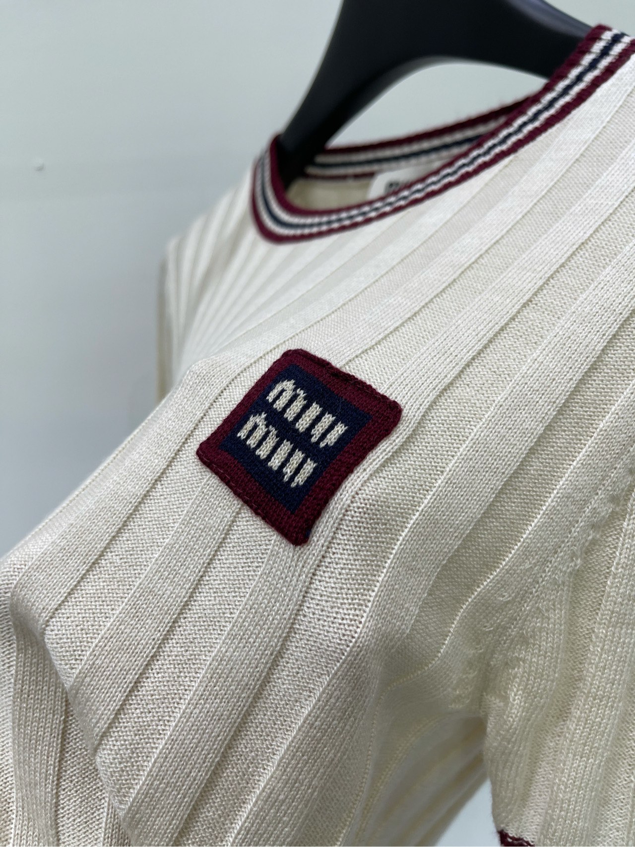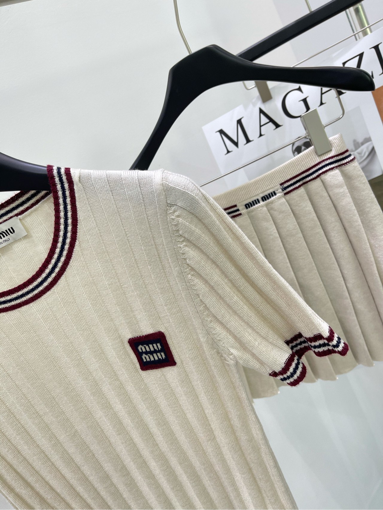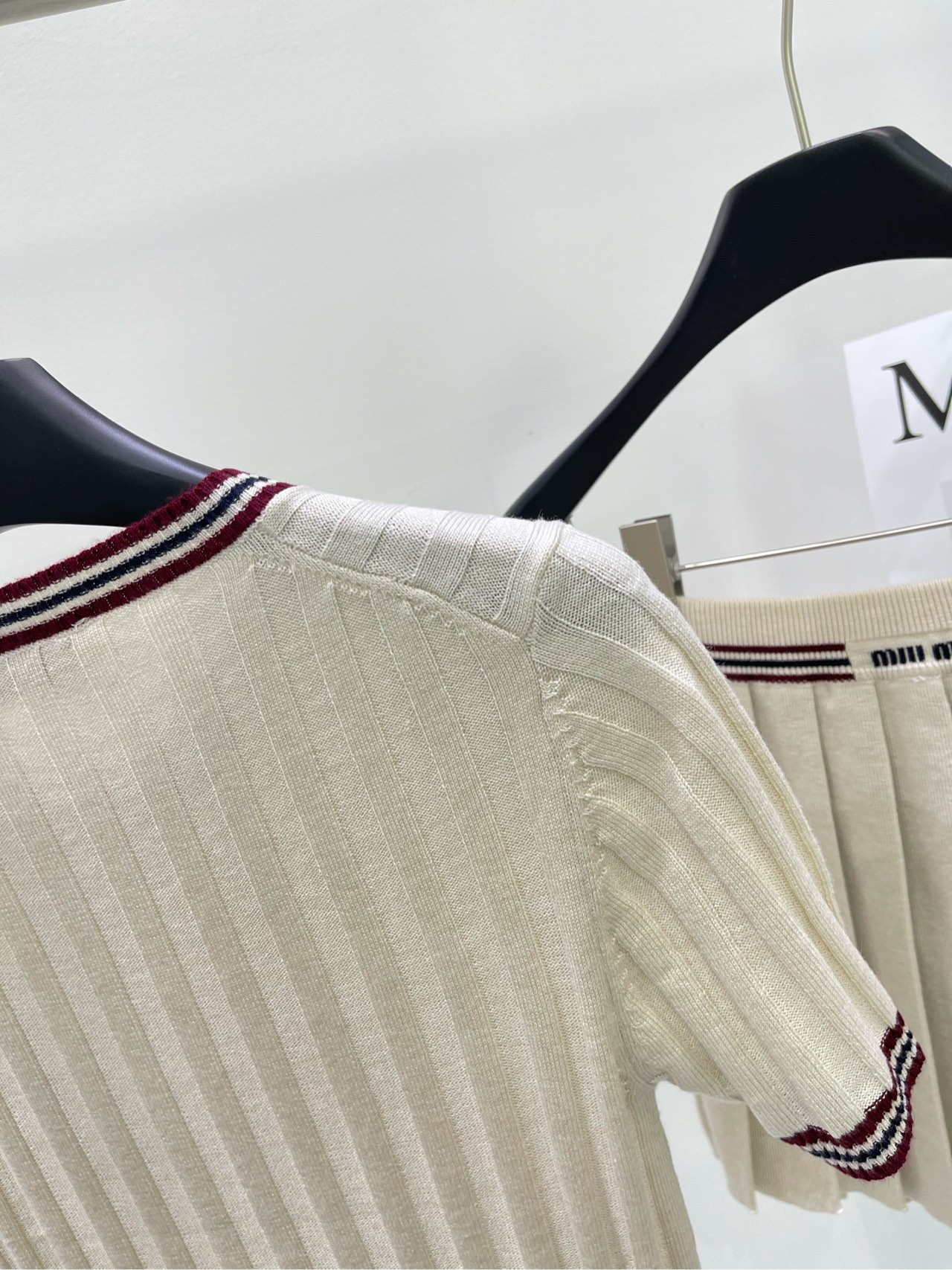 缪家杏色红边圆领针织短袖