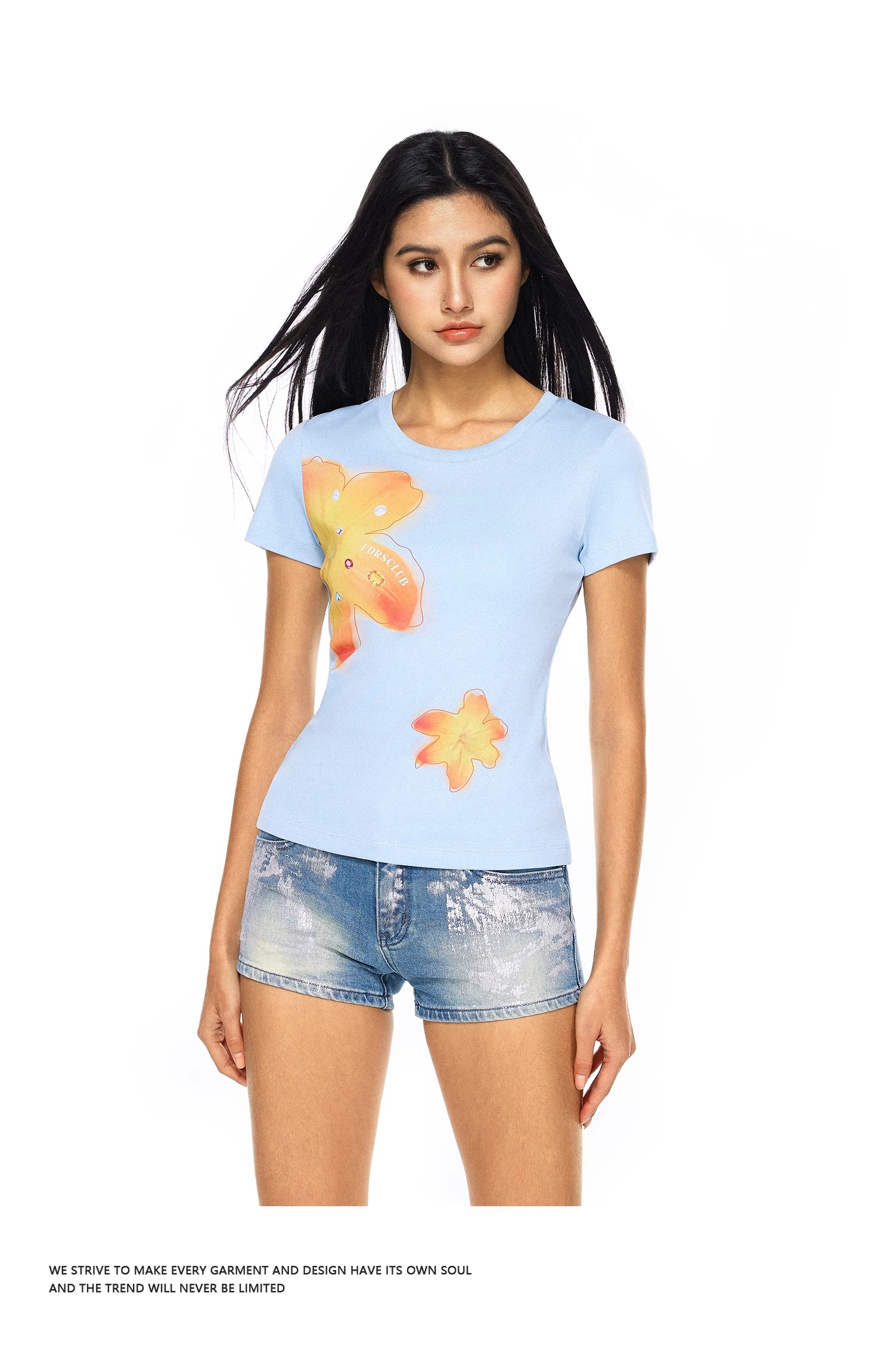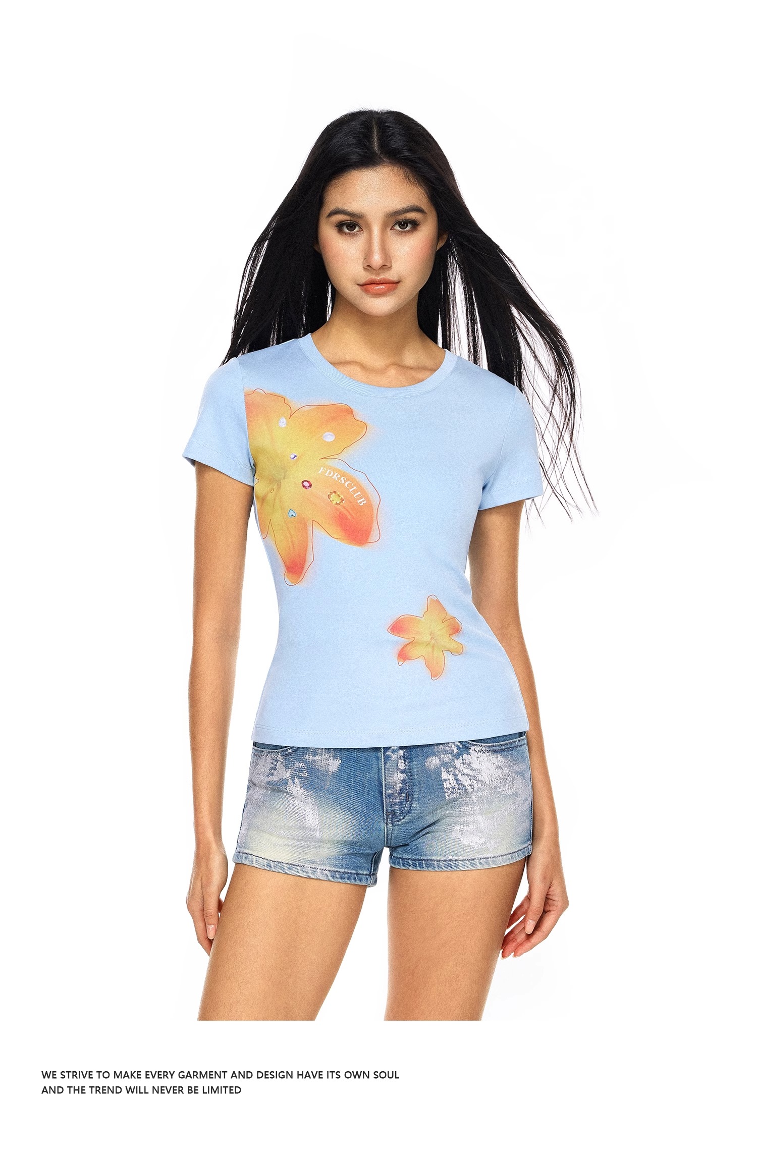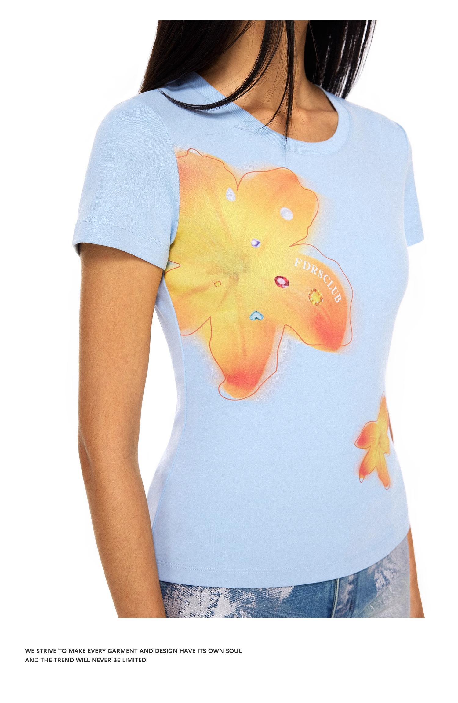 FDR官方店 美式辣妹宝石花卉印花短袖t恤女夏季修身显瘦体恤上衣