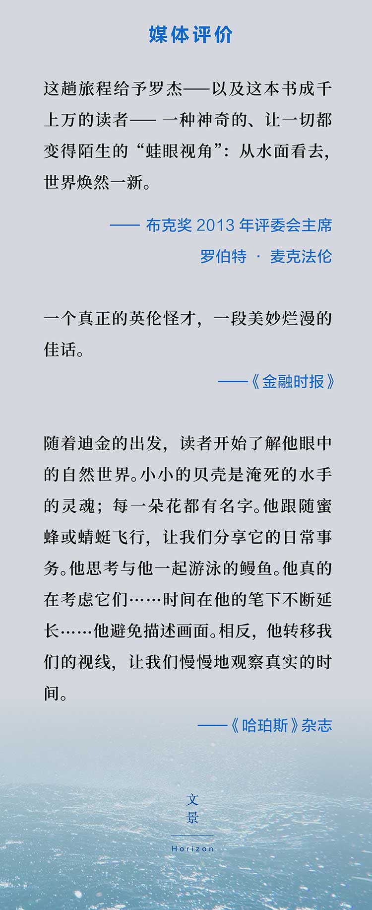 在水面,他以山楂树、梣树树梢的高度,与狐狸对视、看着豆娘与蜻蜓在眼前翻飞、老鹰盘旋而来、红尾鸲在树枝间跳跃;