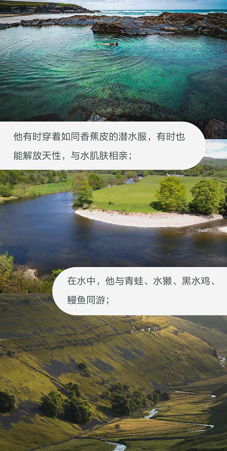 他有时穿着如同香蕉皮的潜水服,有时也能解放天性,与水肌肤相亲;