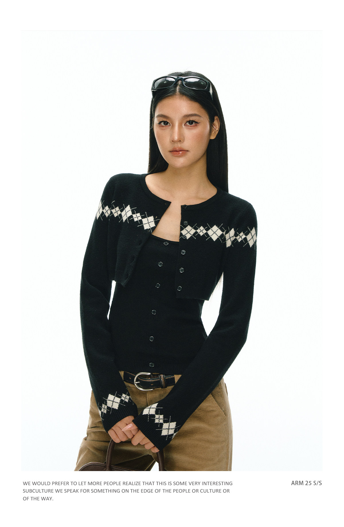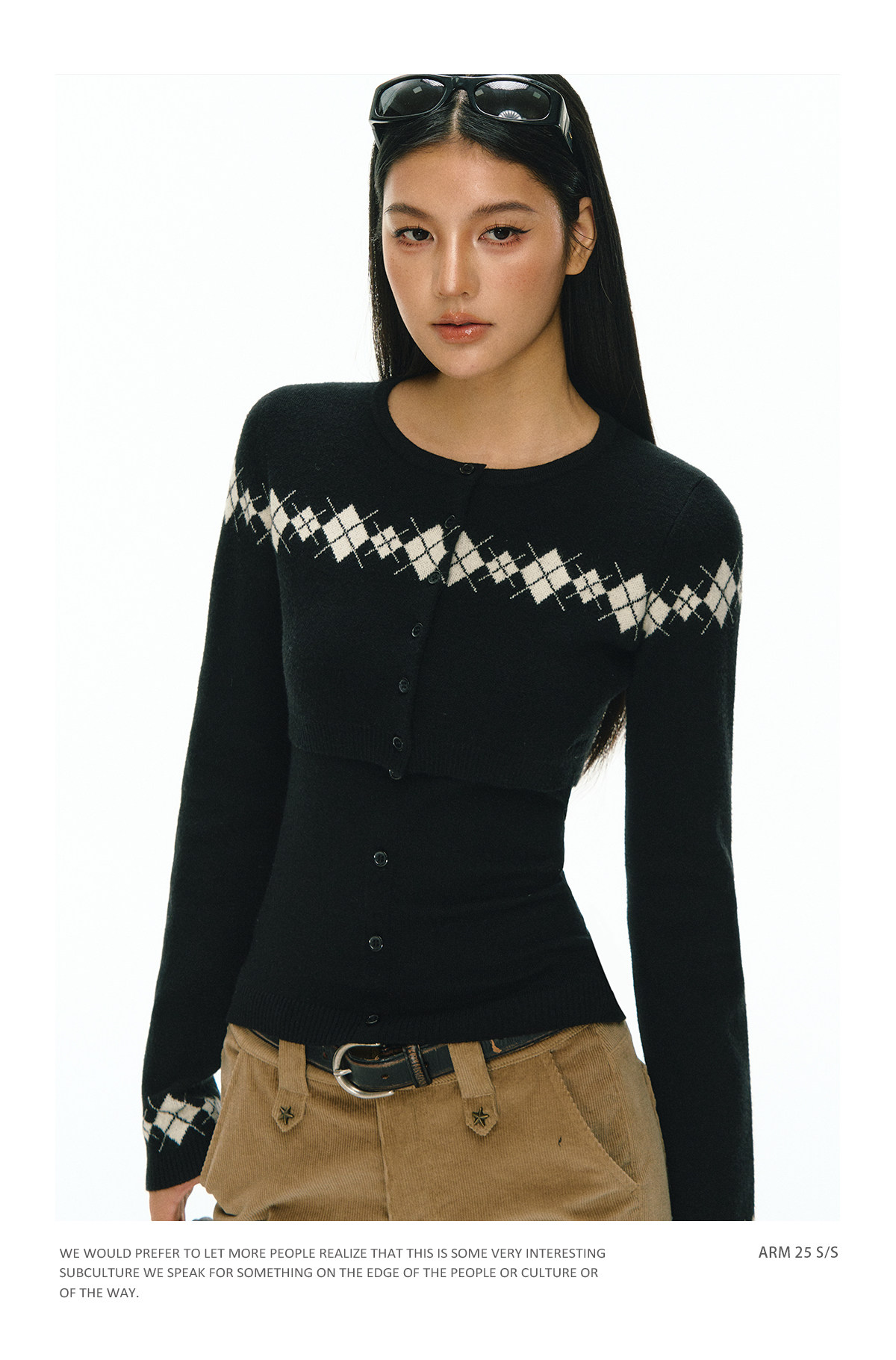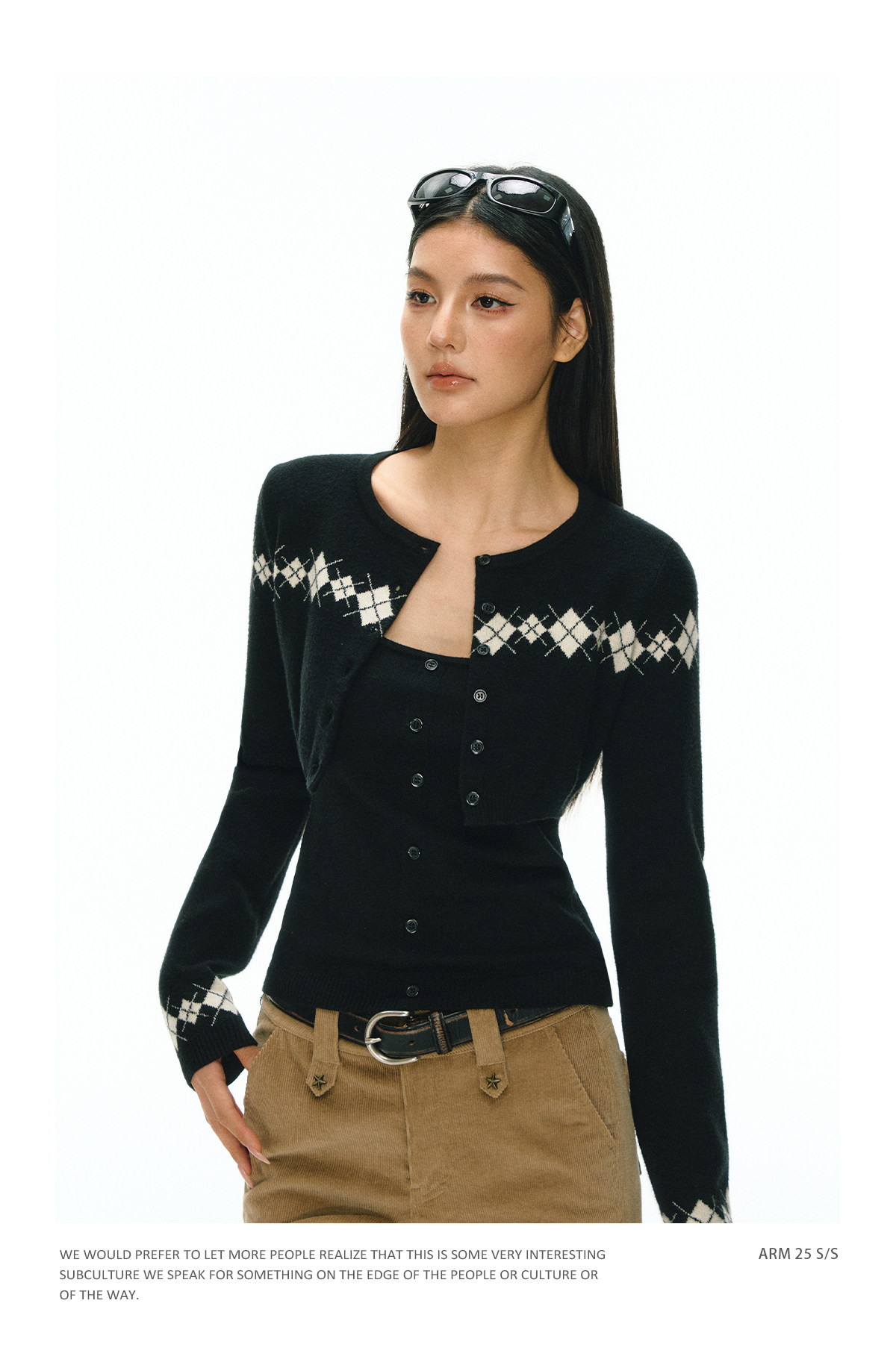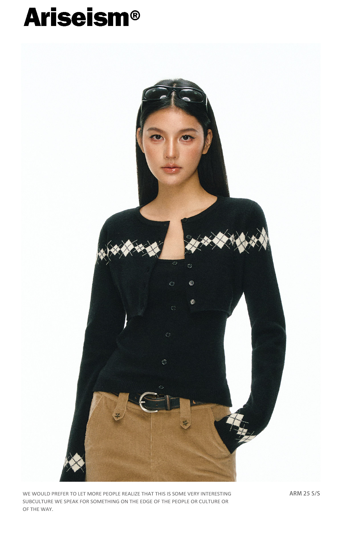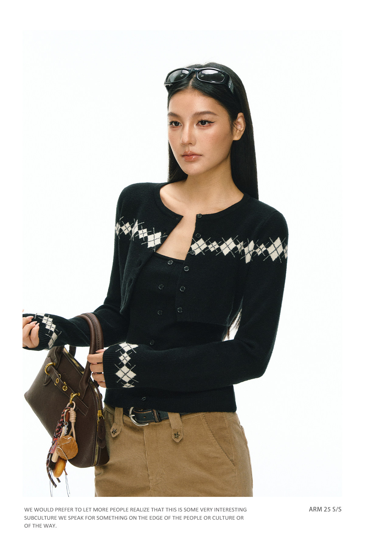 Ariseism 美式复古设计感两件套菱格开衫毛衣女秋冬新款修身上衣