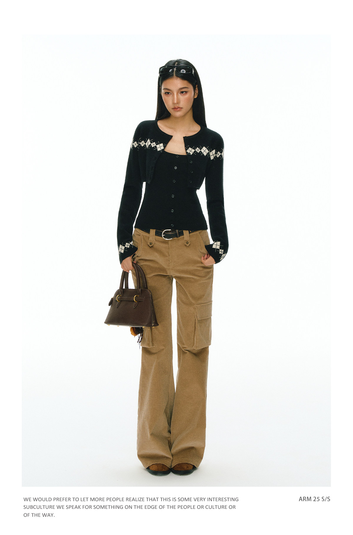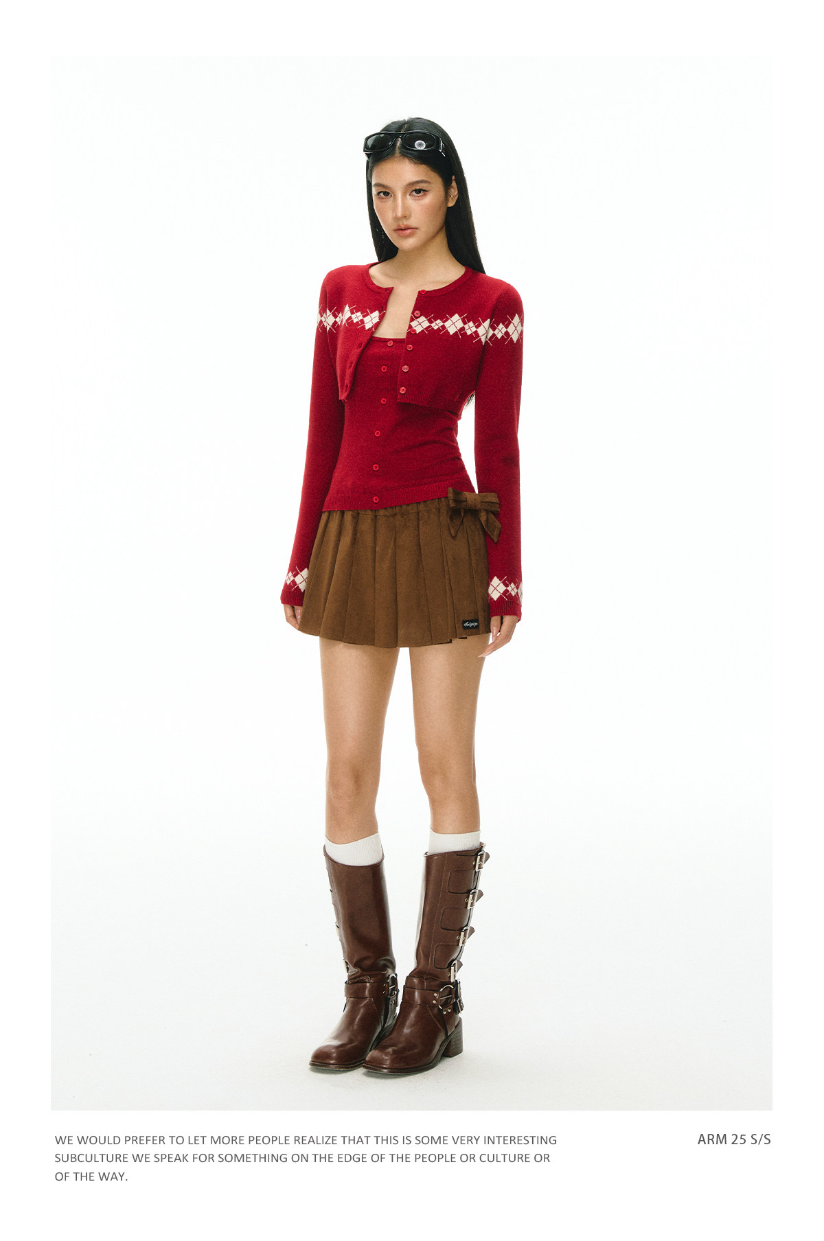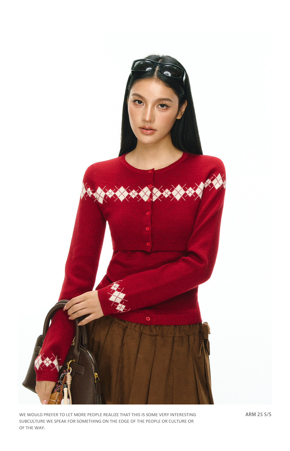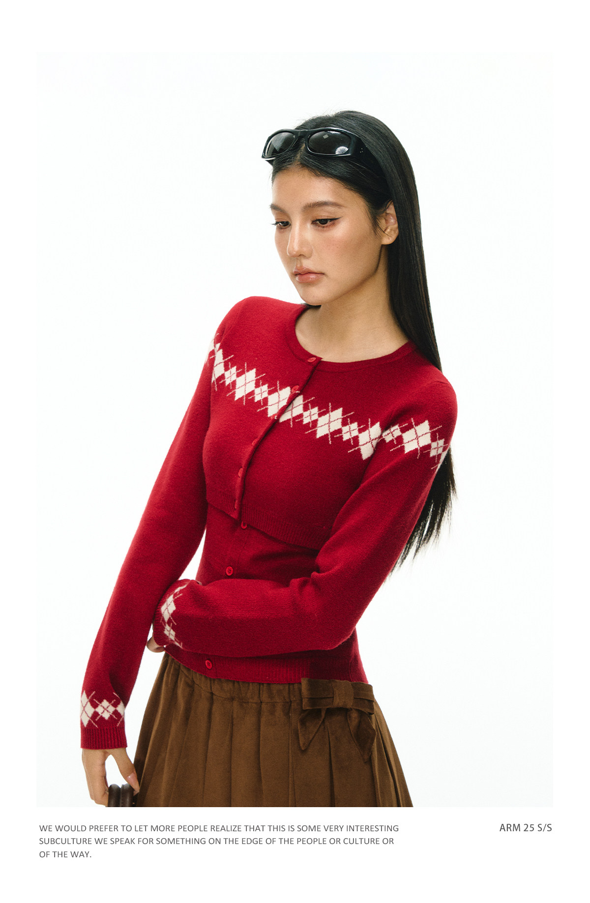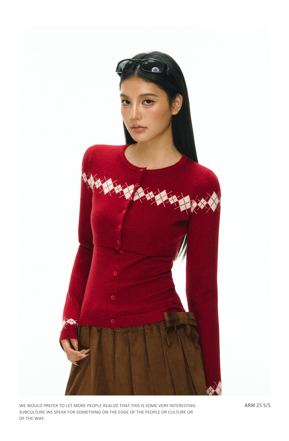 Ariseism 美式复古设计感两件套菱格开衫毛衣女秋冬新款修身上衣