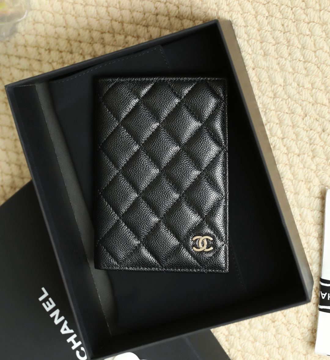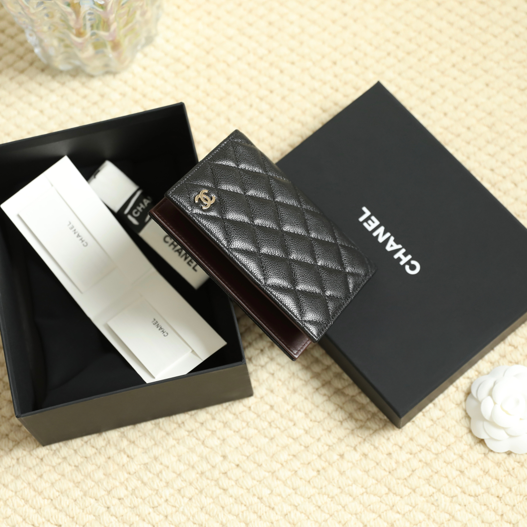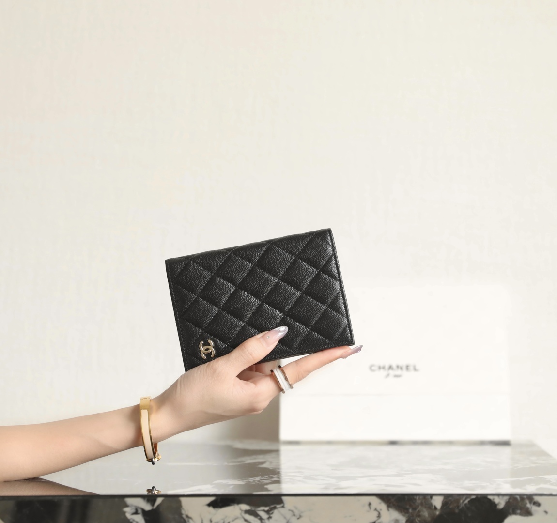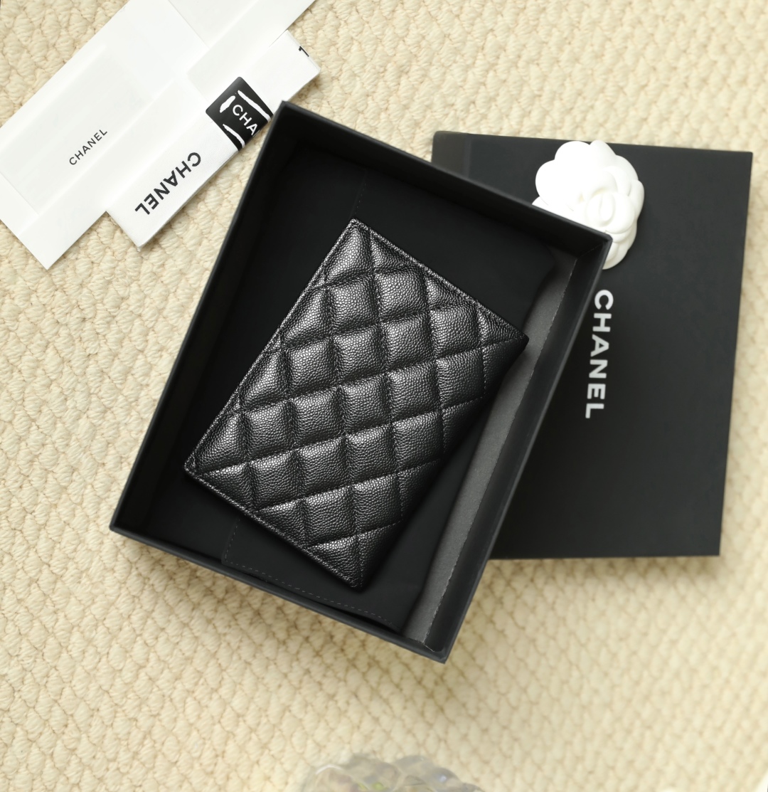 到货🆒𝗖𝗵𝗮𝗻𝗲𝟭经典护照夹 鱼子酱牛皮黑色淡金