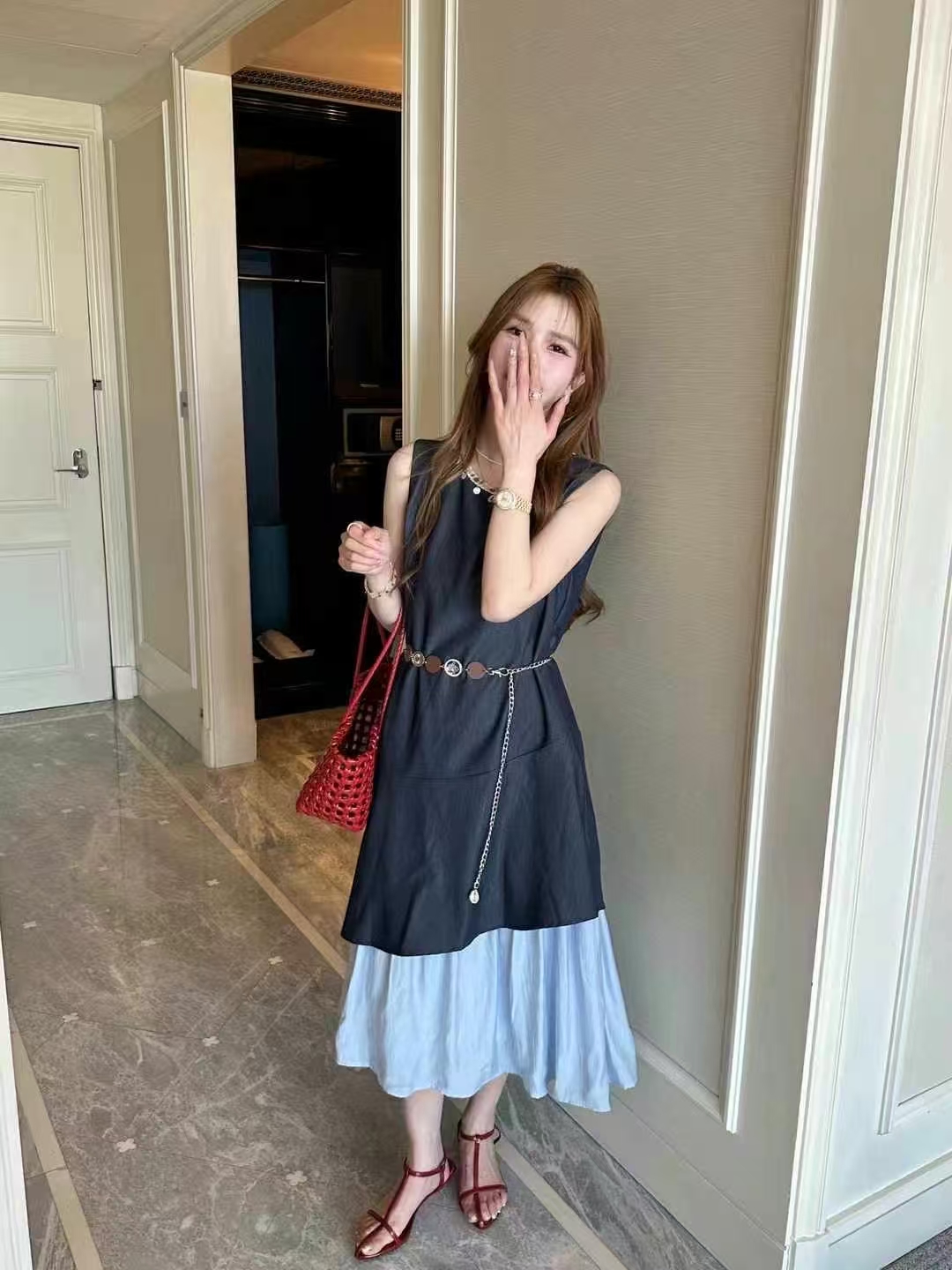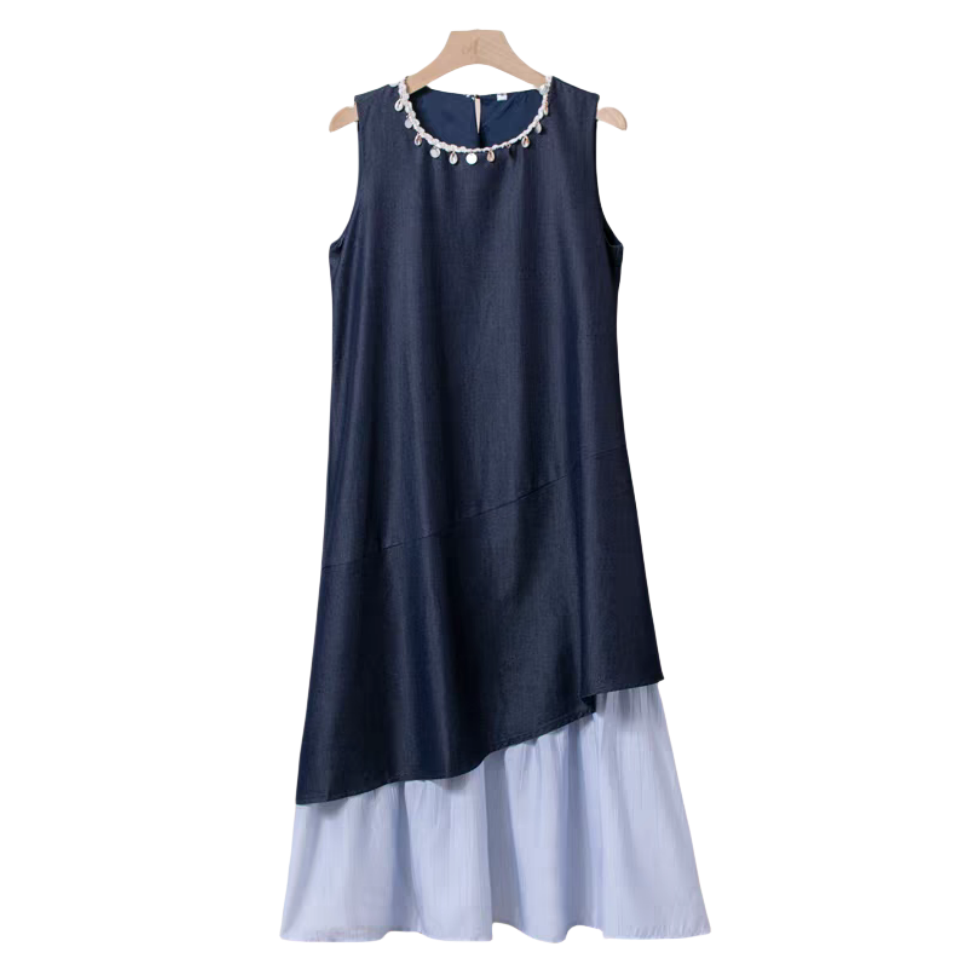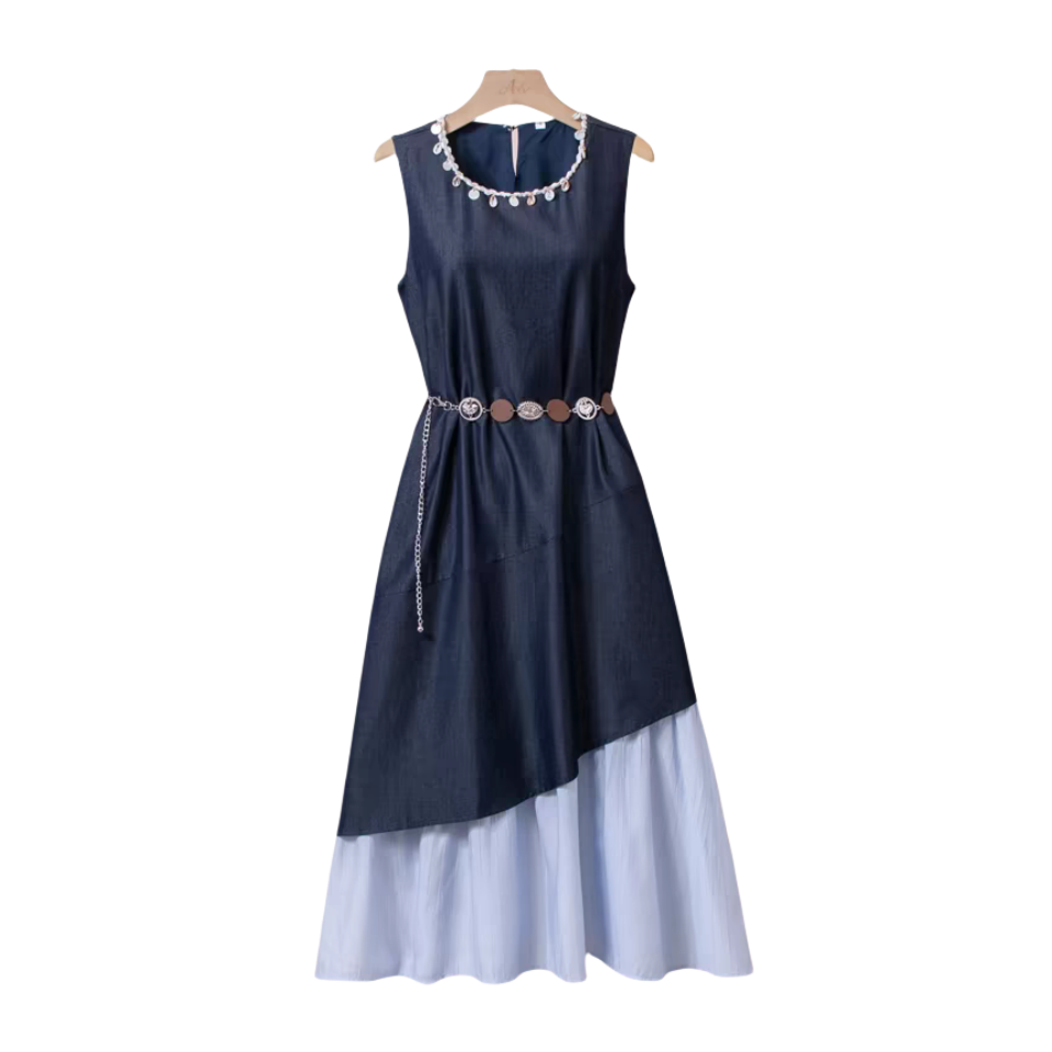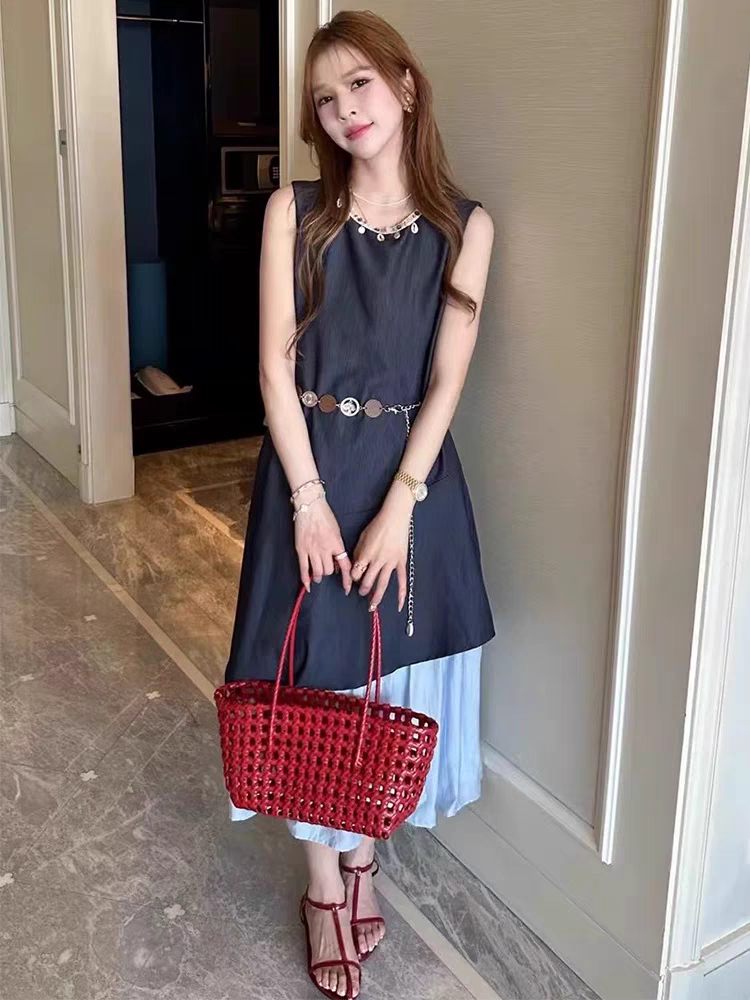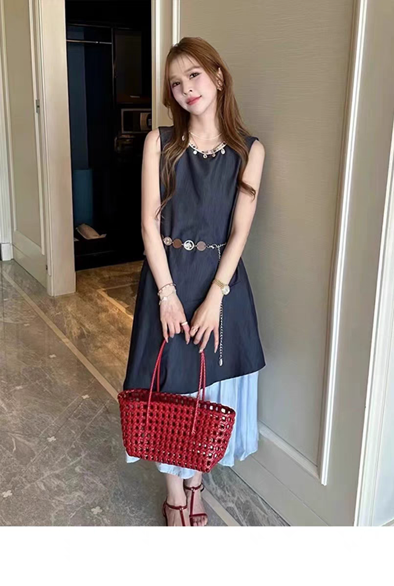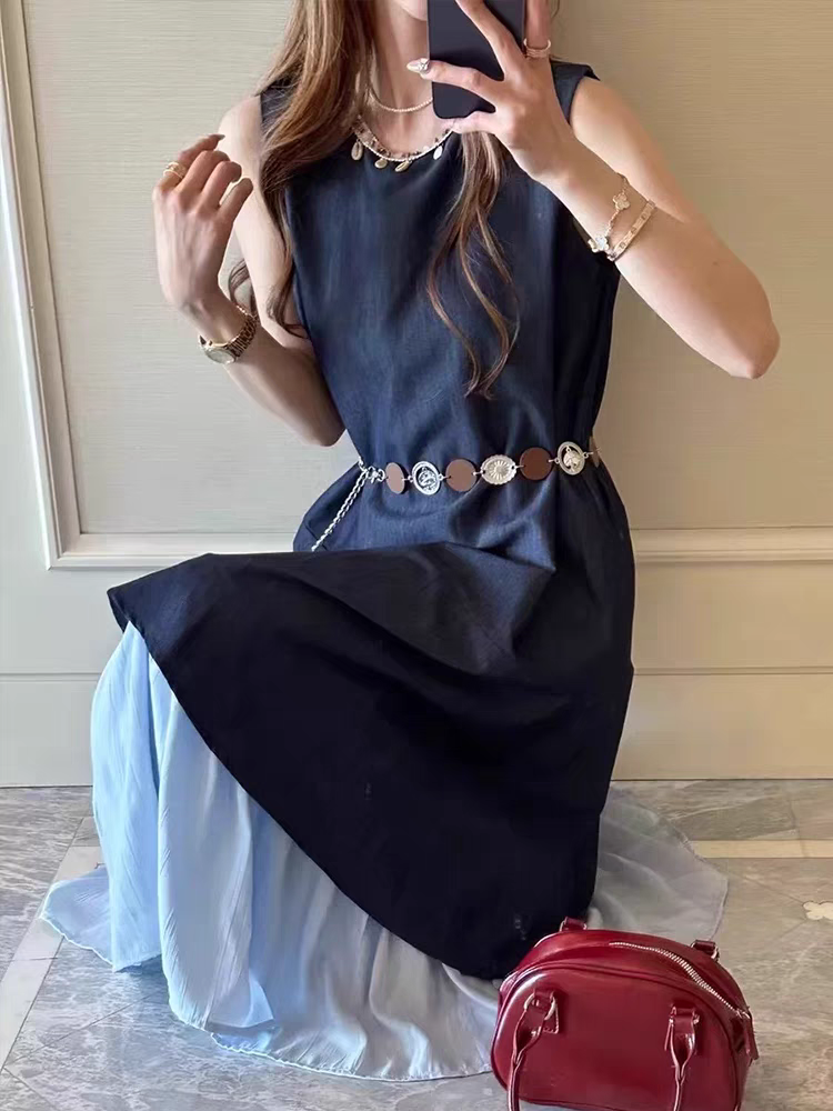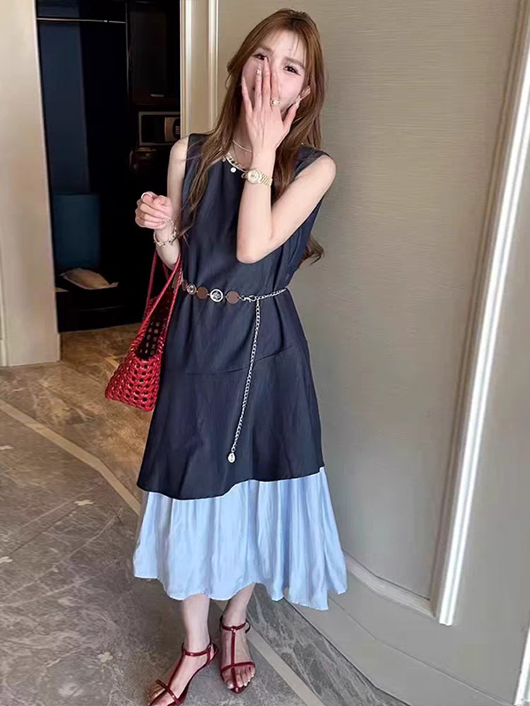 NORNS LADY诺恩 2025法式气质拼接连衣裙优雅设计显瘦长裙无袖背心裙夏季假两件裙子【赠腰带】QMYLMS2795