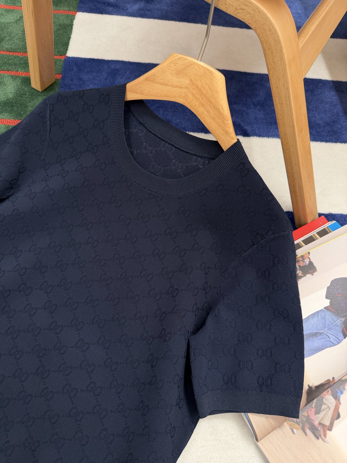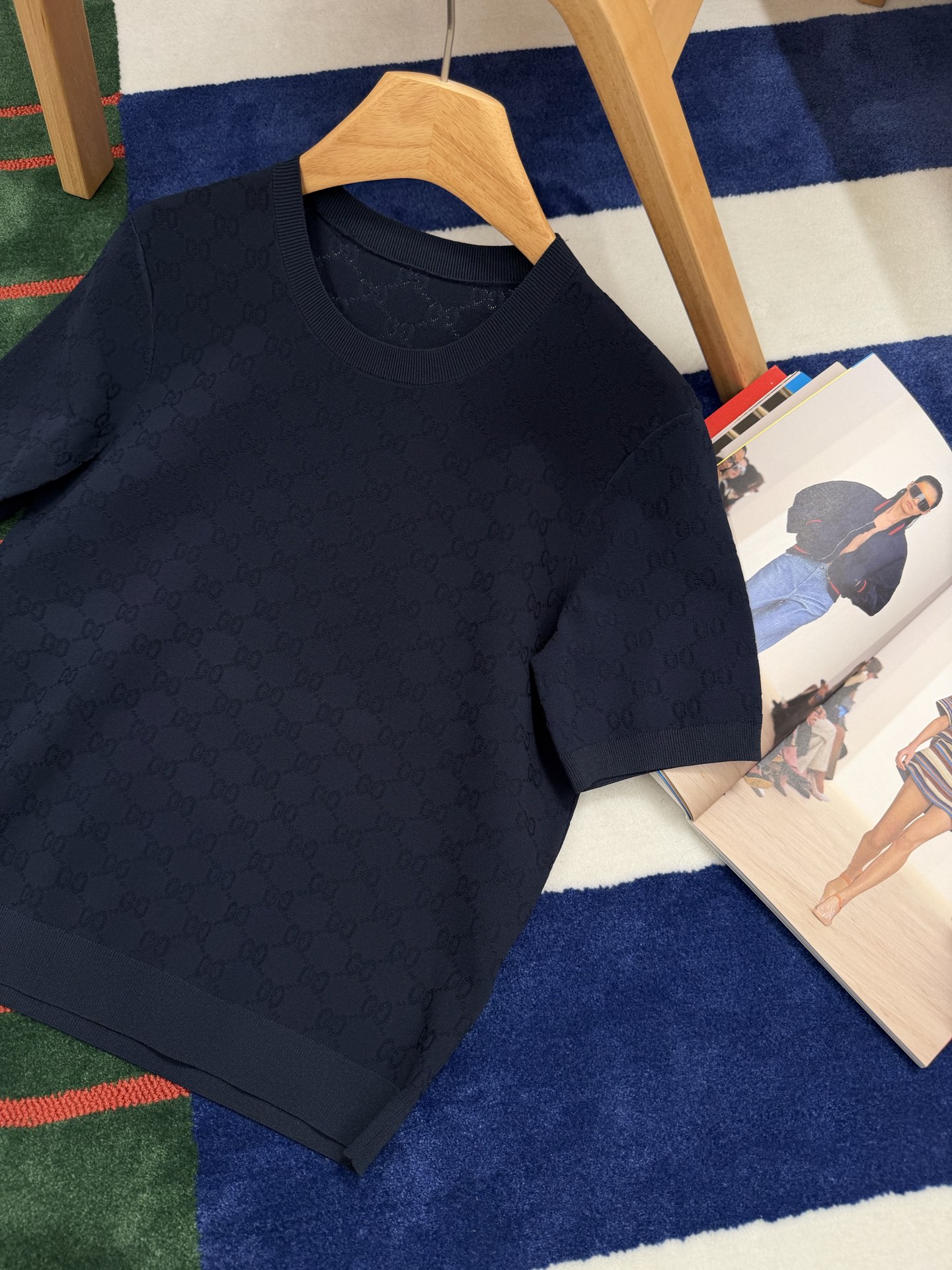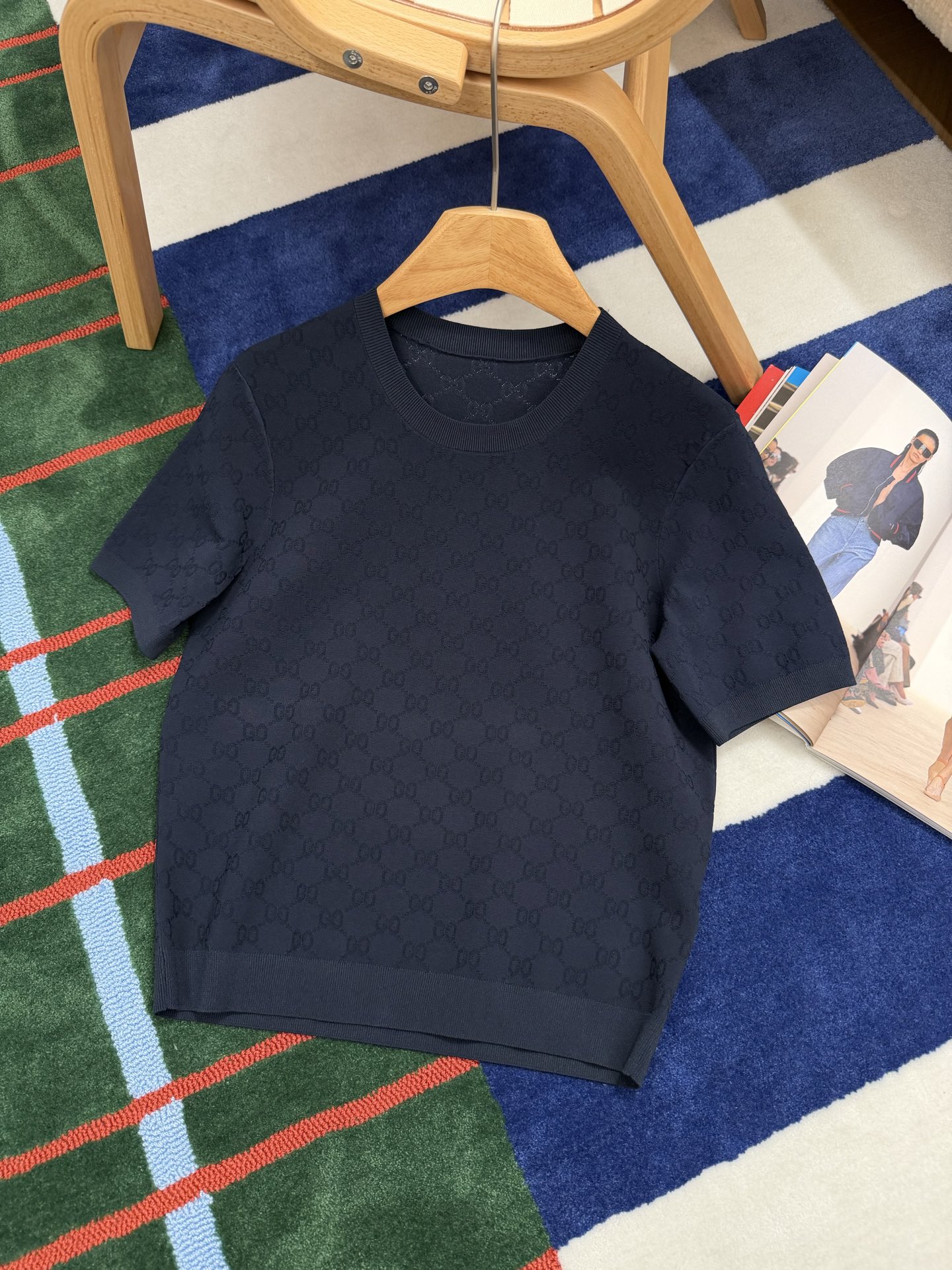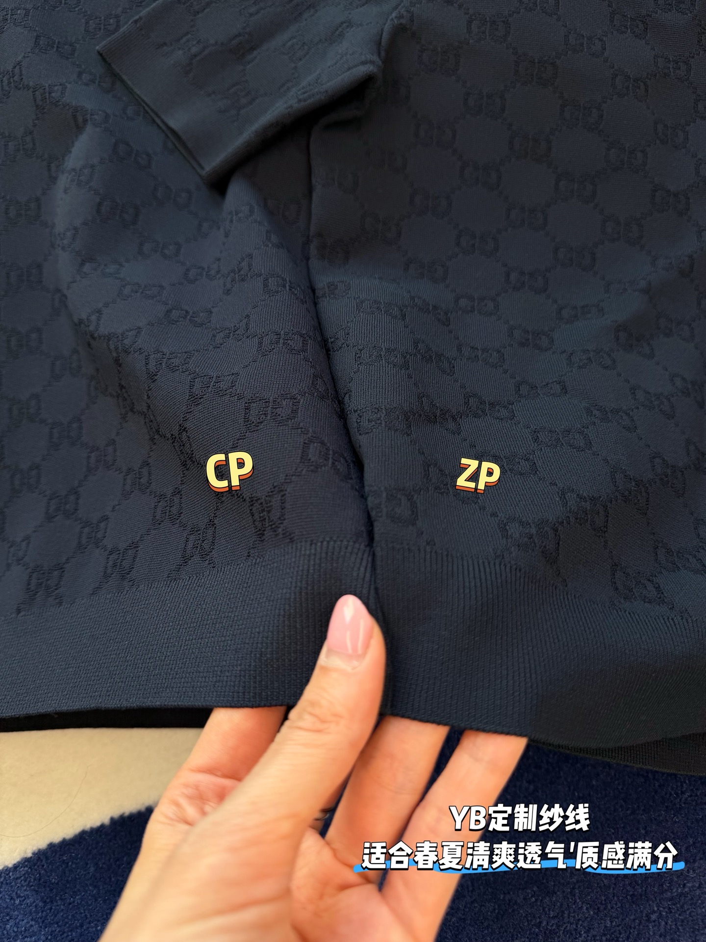【新款现货发售】26春夏重磅上线🆕 藏蓝色字母提花针织短袖,自带优雅贵气滤镜☑️YB定制纱线🧵如丝垂坠又透气亲肤🫧 同时兼顾利落挺括与抗皱属性,罗纹细节弹性十足,贴合身形不紧绷〰️进口织机精密织就的满版字母肌理,低调又有辨识度😜胸口暗藏品牌标识💫 不张扬却自带高级感,完美诠释“老钱气质”😉质感党闭眼冲,不用刻意打扮也能穿出贵气感,买到就是赚到的气质单品✨码数SML