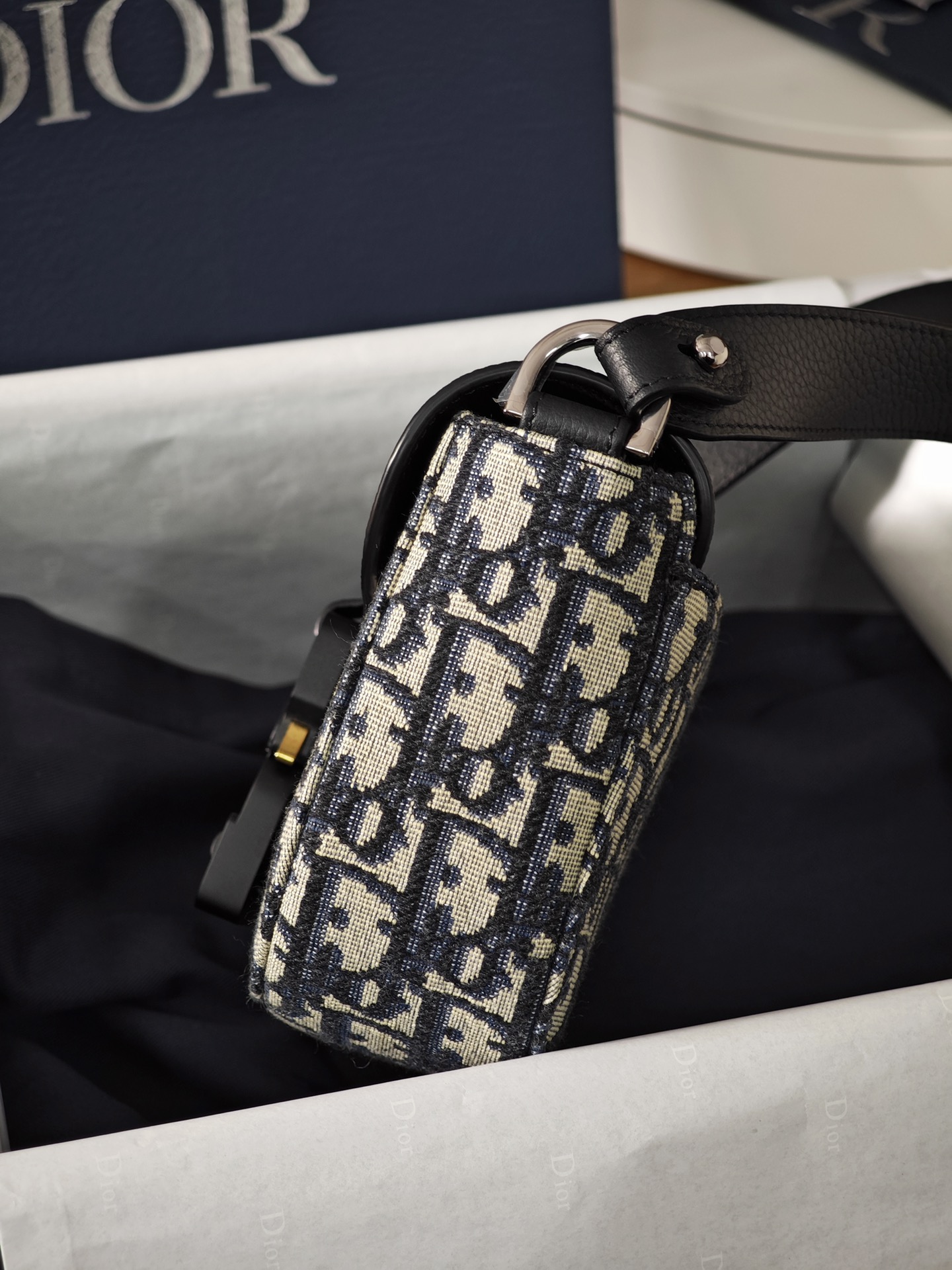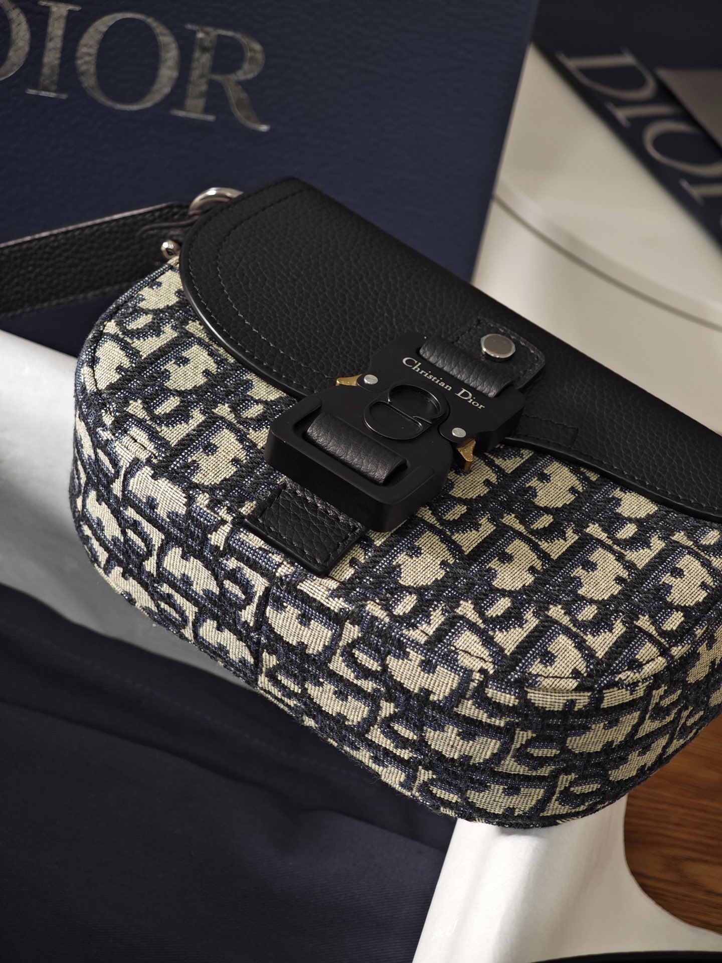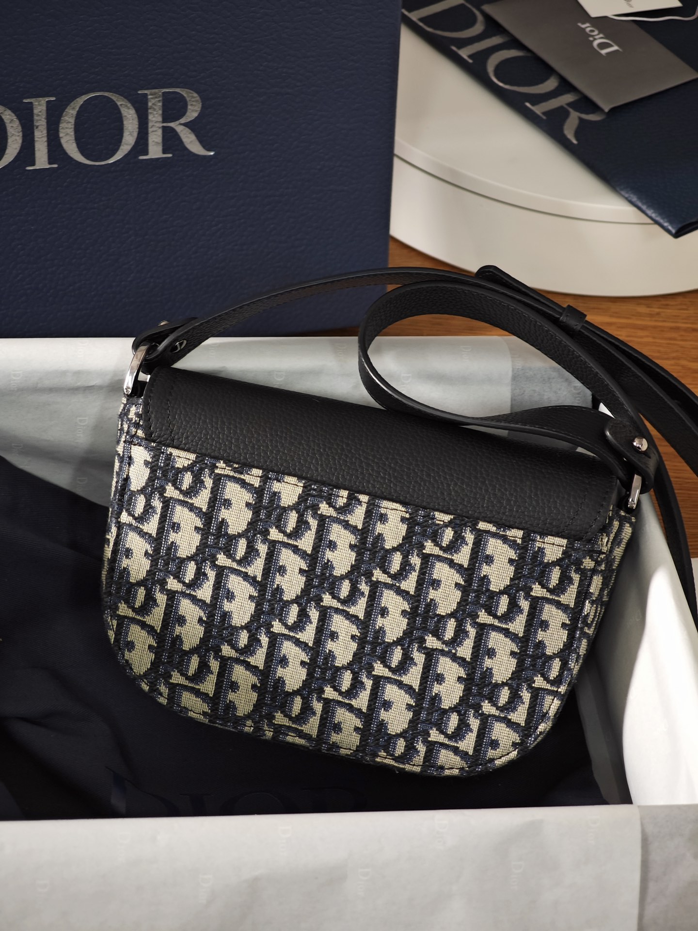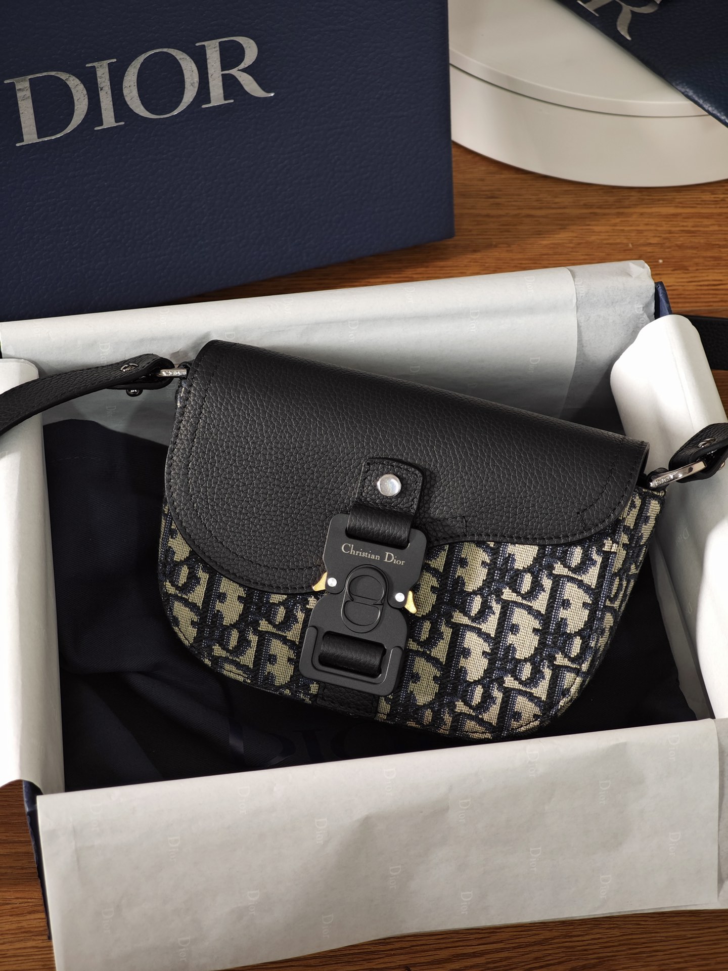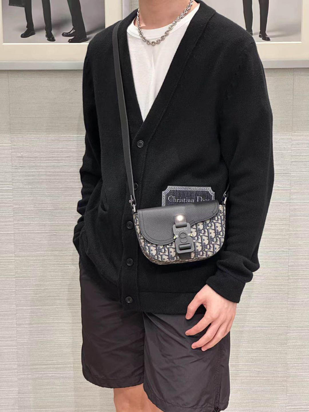 采用米色和黑色, Obique 印花面料精心制作,搭配黑色粒面牛皮革马鞍翻盖和 Christian Dior 标志铝扣。