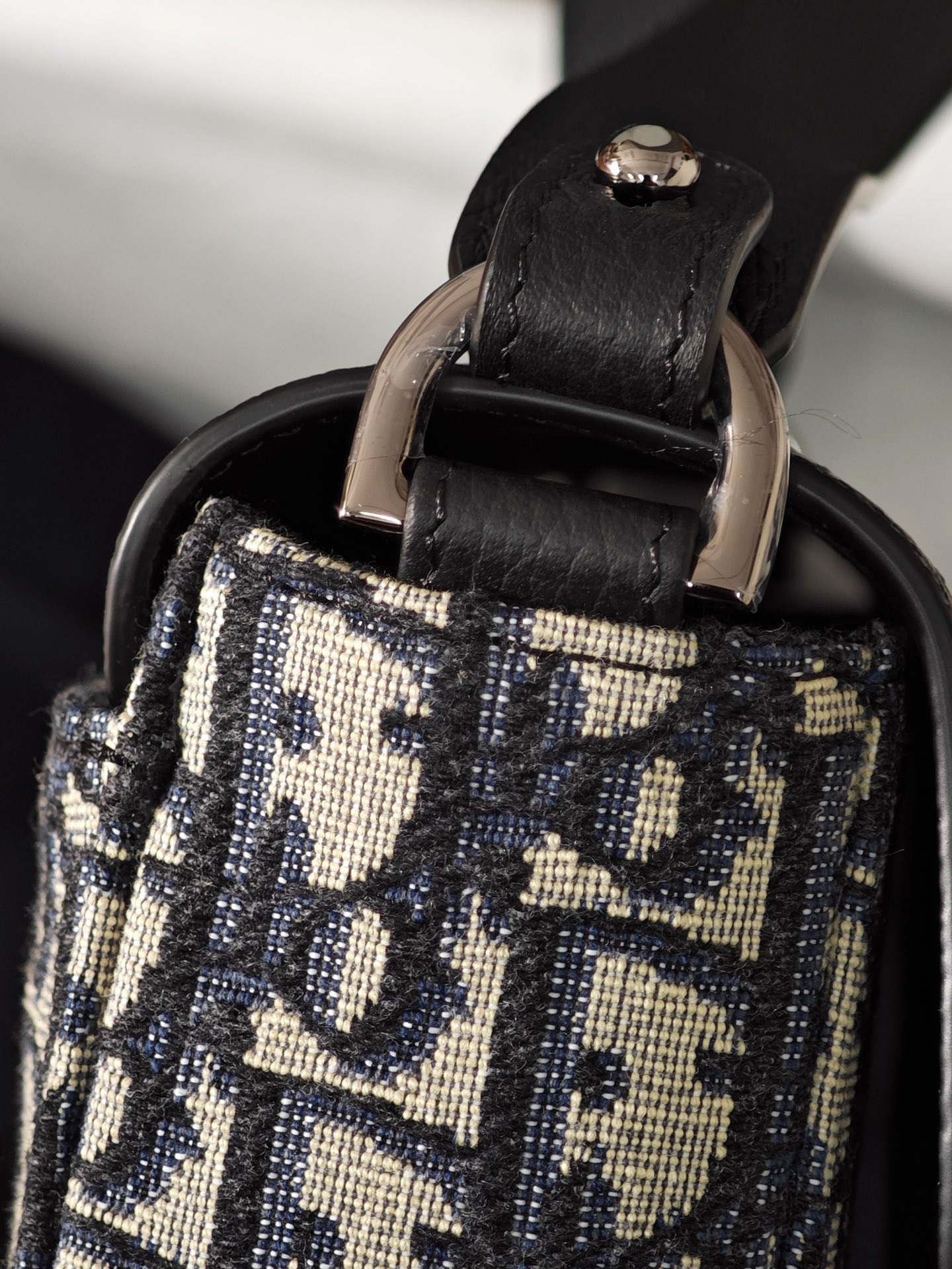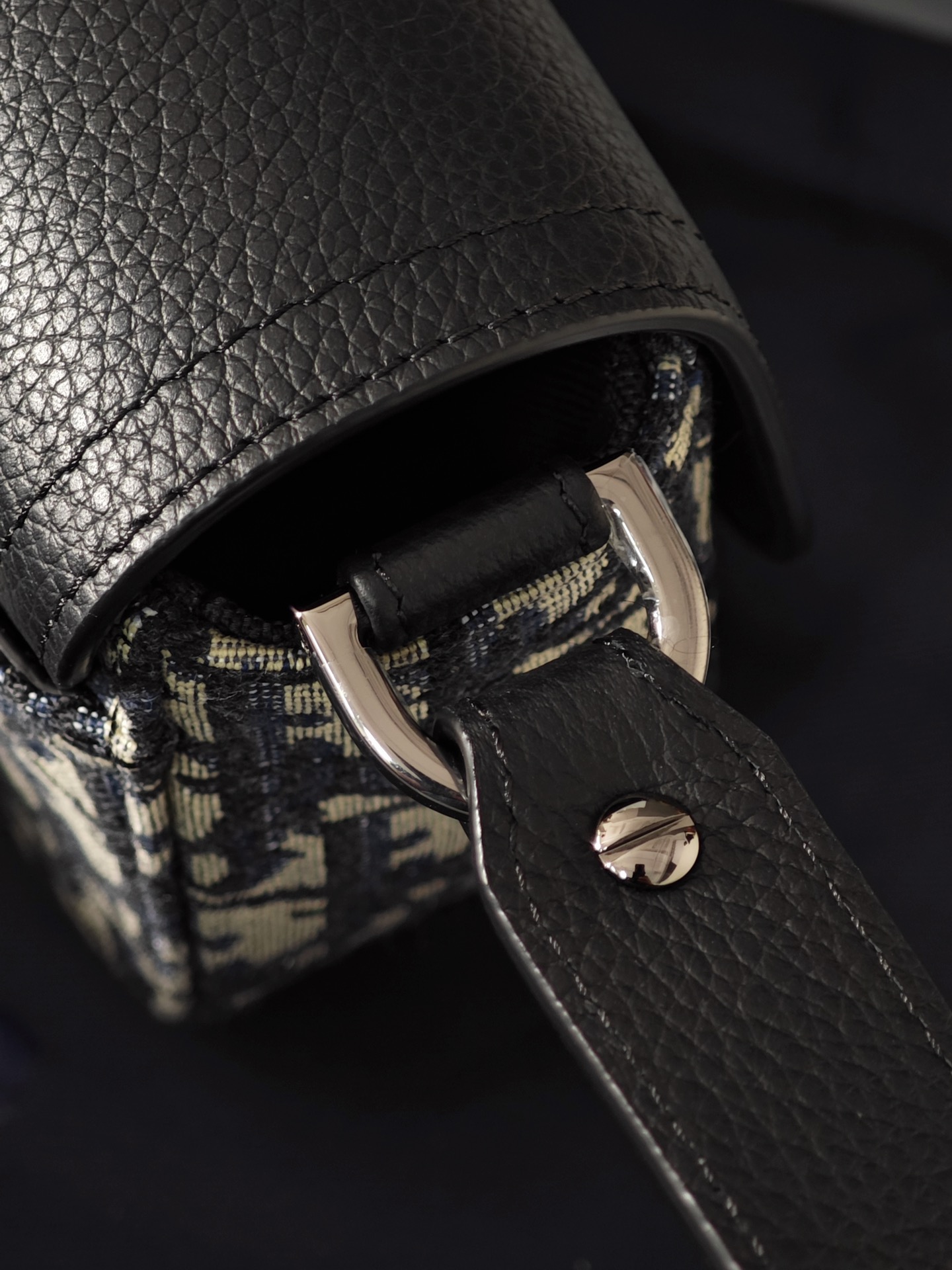 米色和黑色 Obique 印花面料和黑色粒面牛皮革搭配翻盖