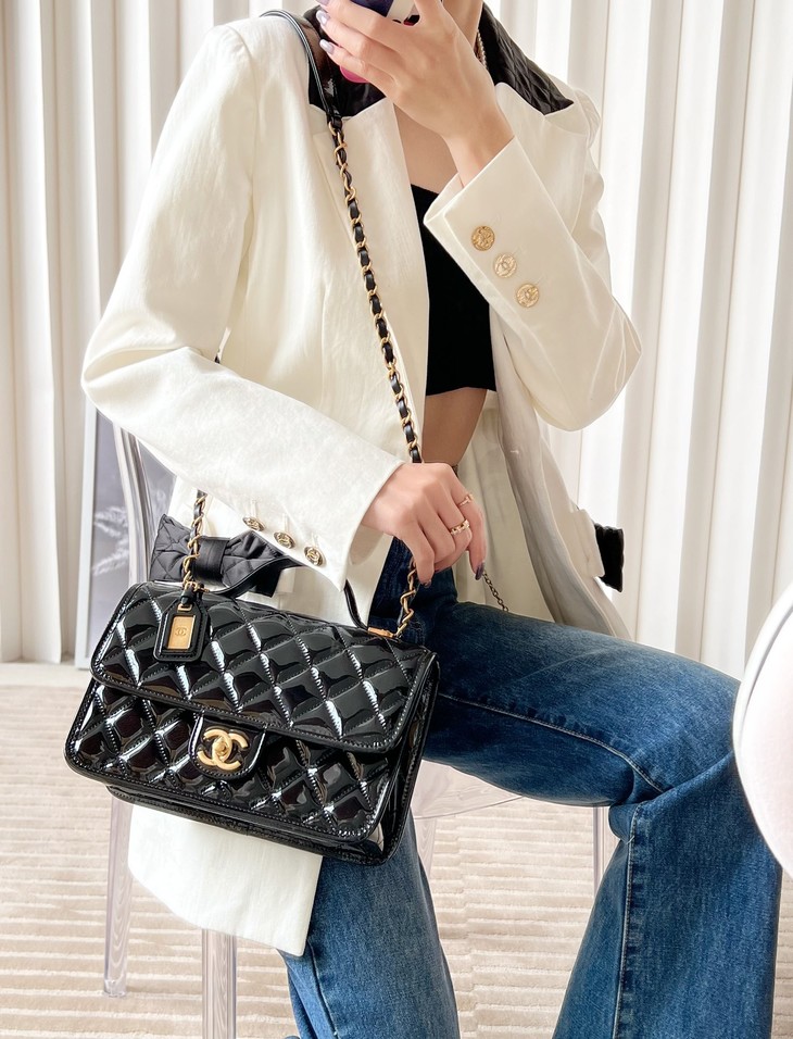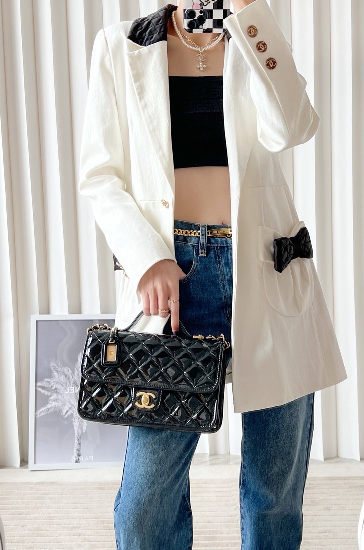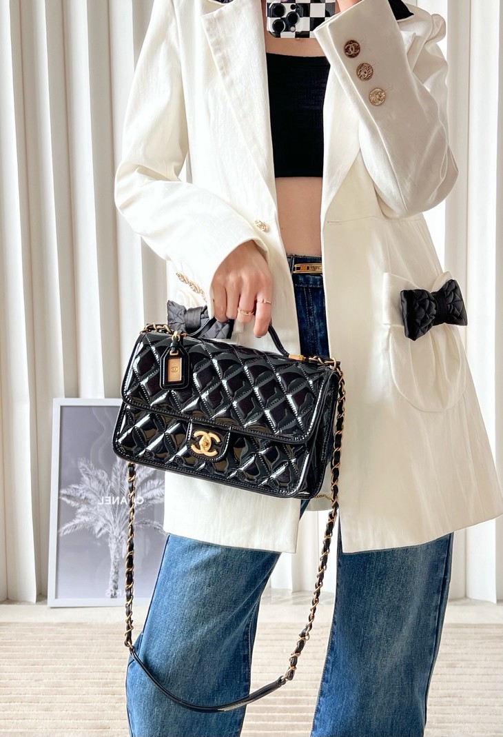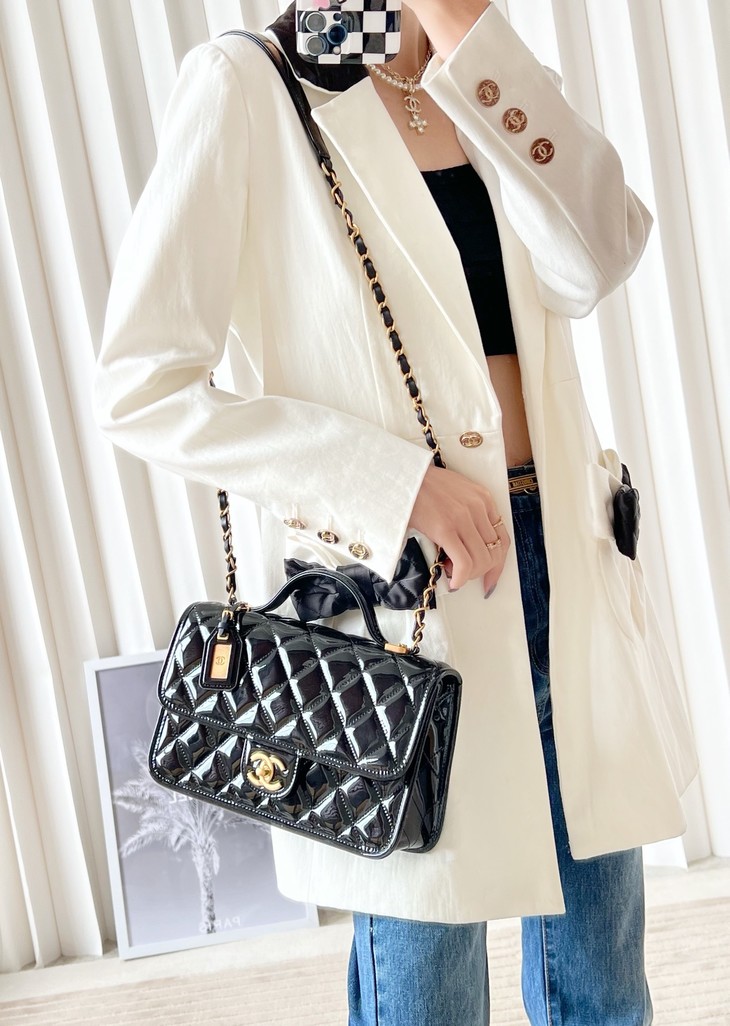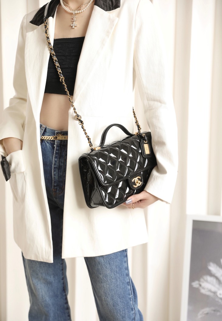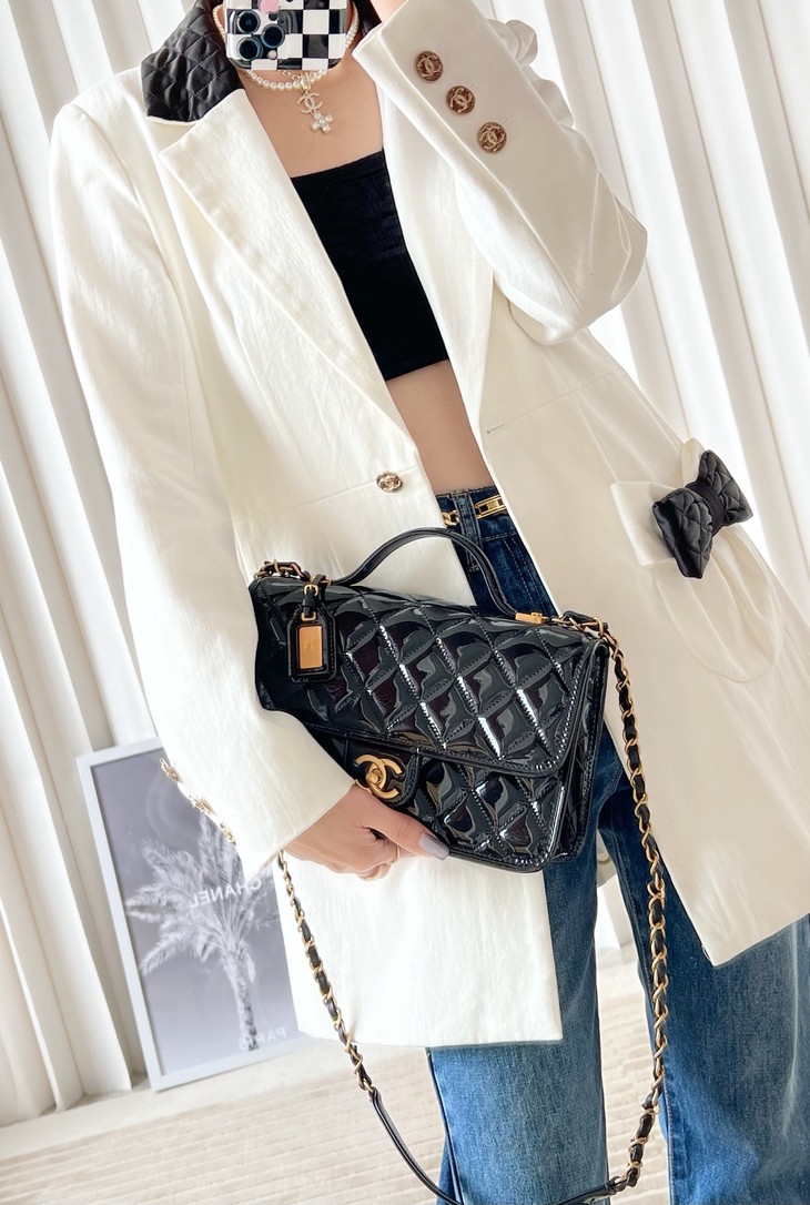 容量妥妥 手机口红车钥匙都可以塞 拎着很时髦 斜背也可 长度刚好 五金:全铜24𝑘复古金 皮料:独家开料部𝑧𝑝漆皮小牛 尺寸: 25*21.5*7 𝑐𝑚