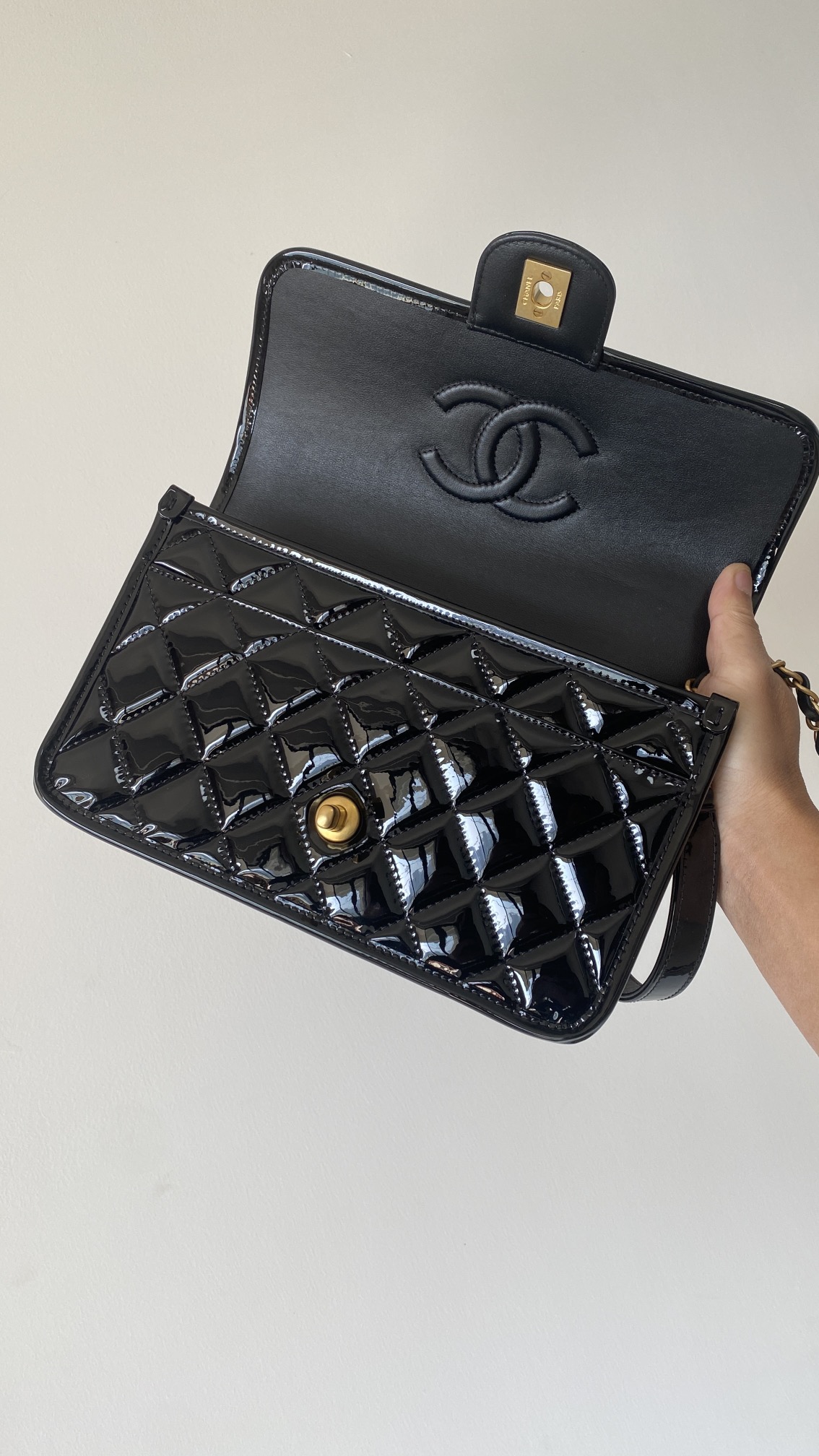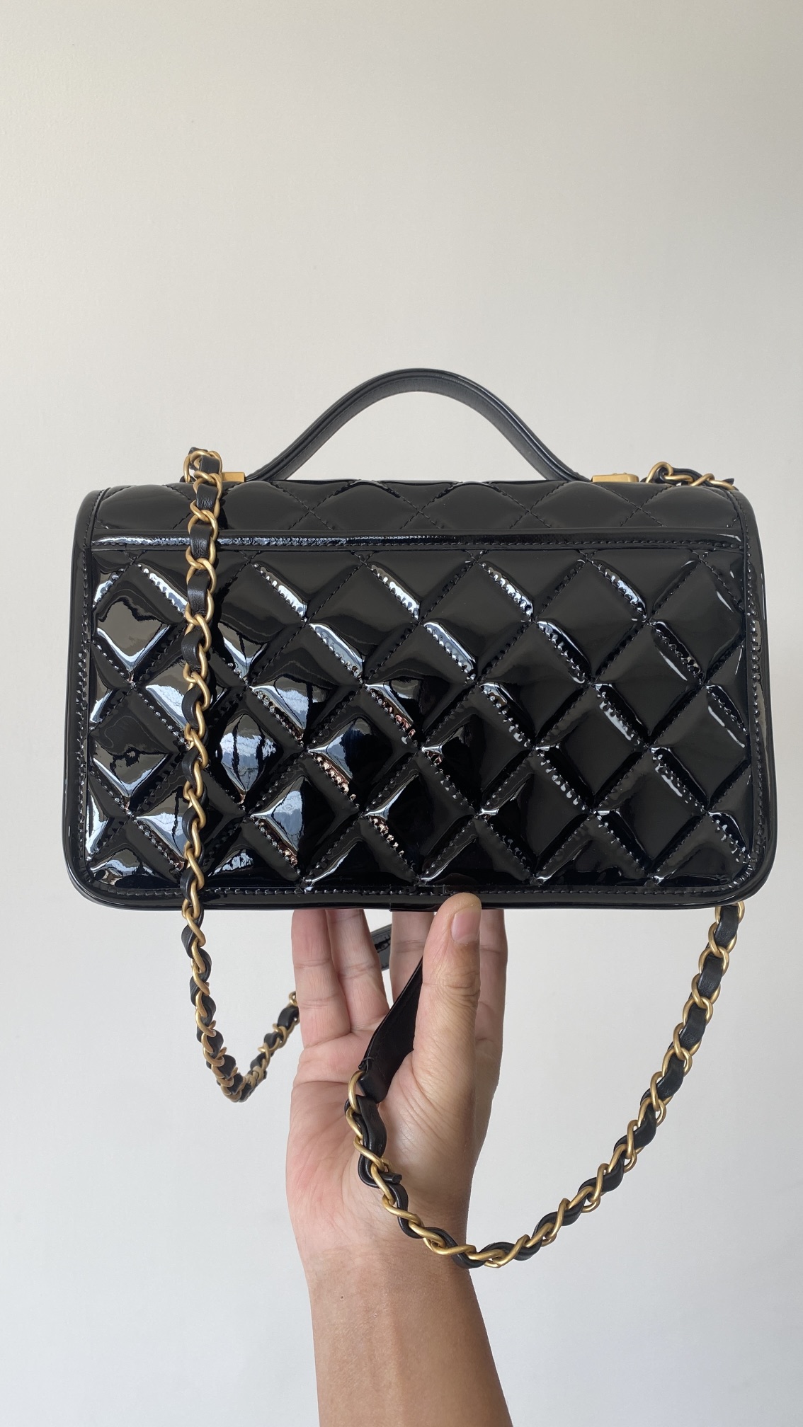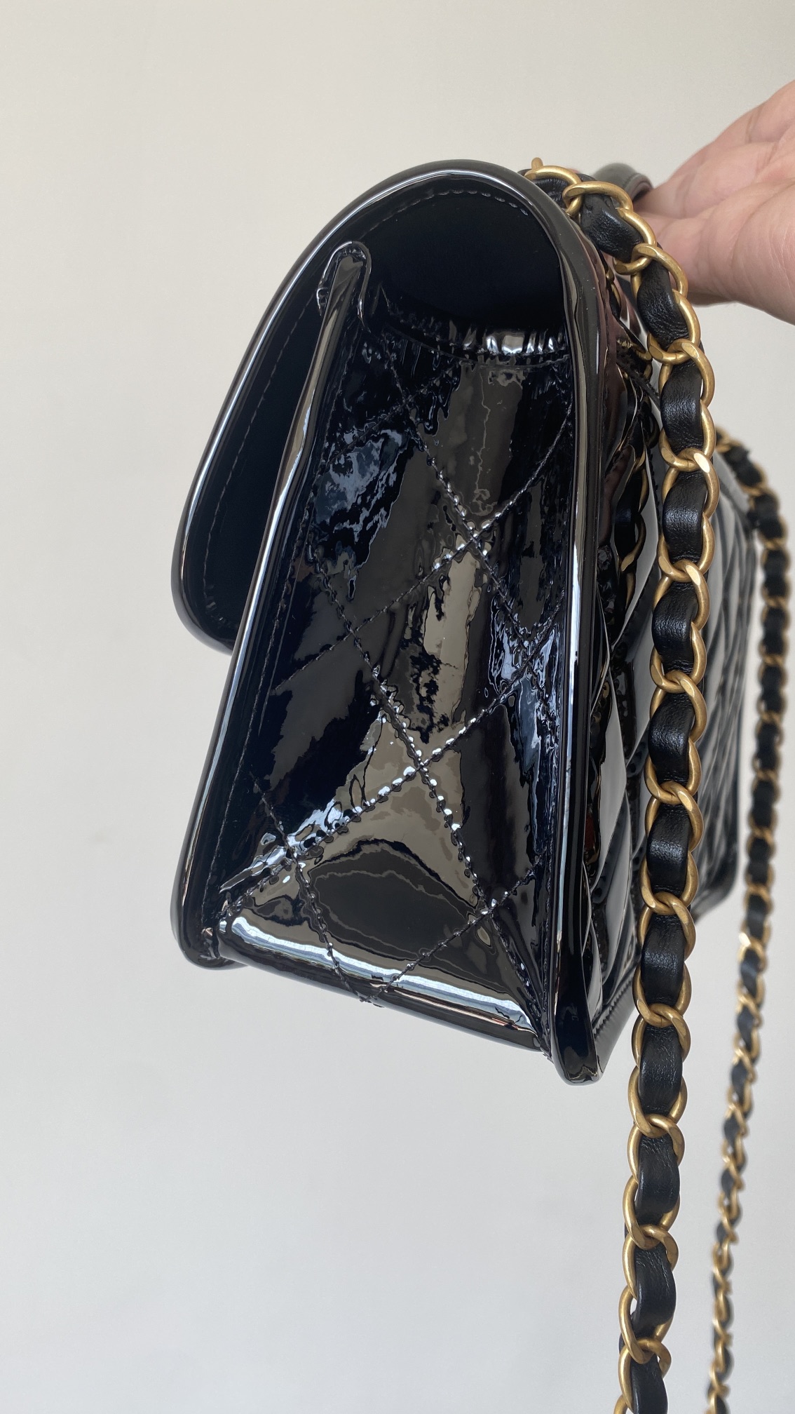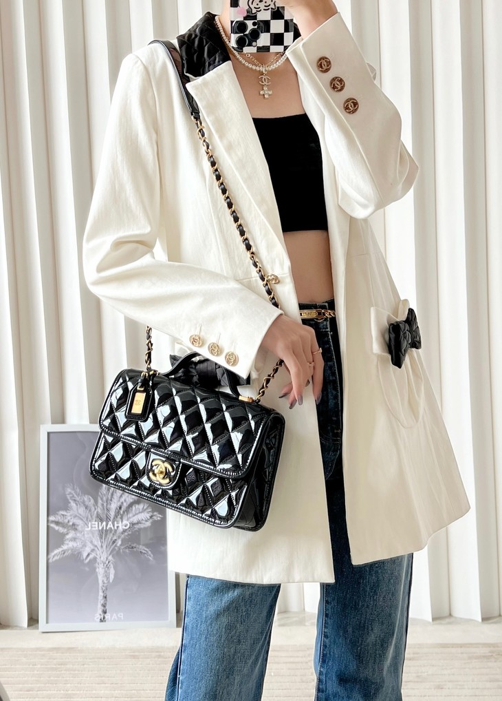 容量妥妥 手机口红车钥匙都可以塞 拎着很时髦 斜背也可 长度刚好 五金:全铜24𝑘复古金 皮料:独家开料部𝑧𝑝漆皮小牛 尺寸: 25*21.5*7 𝑐𝑚