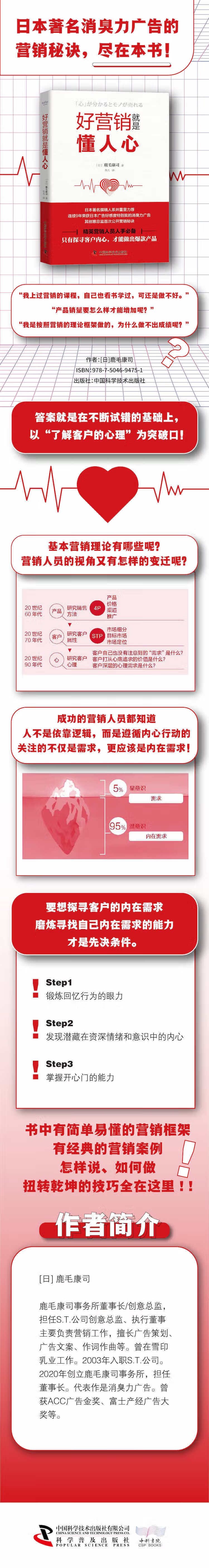前言 “我上过营销的课程,自己也看书学过,可还是做不好。” “产品销量要怎么样才能增加呢?” “我是按照营销的理论框架做的,为什么做不出成绩呢?” 这些问题我遇到过很多次。前来咨询的人有在实体店销售商品和服务的,也有专门从事网购行业的。公司的销售人员自不必说,就连市场、广告、宣传和产品开发等部门的人,以及以税务人员、律师为首的专业领域服务人员,无论哪个领域和行业以及不同年龄层的人,有不少人有着同样的烦恼,即“无法顺利增加销量”。 从这些问题可以看出,尽管他们拼命努力掌握实践营销手段,却总是距离成功有一步之遥。如果遵照营销思路行动,确实能够取得一定的成果,然而实际情况是,这样很难做出爆款产品。 如何才能脱离这种状况呢?答案就是在不断试错的基础上,以“了解客户的心理”为突破口。只有在了解客户心理之后,营销理论和手段才能成为派得上用场的工具。于是我组织召开了以产品营销为主题的学习会。实际上,通过学习会的学习,有不少人找到了新的视角,学会了理解客户心理,实现了商业上的成功。 那么,如何做才能了解客户心理呢? 人的行动并非总是符合逻辑的。就算我们自己认为是按照逻辑行事的,我们的内心依然会对行为施加一定程度的影响,而就连我们自己都无法认识到这一点。遗憾的是,就算利用众所周知的营销手段和工具,也没办法看透人心。现有的营销理论体系所擅长处理的只有客户自己也能注意到的“情绪”和“意识”。人的行动有 95% 是在潜意识的支配下完成的,这是学界的结论,而自己都没有注意到的想法是本人都无法解释的。运用传统的营销理论框架去理解客户的潜在心理时,往往会遇到瓶颈。 在营销领域,影响行动的“内心真正的需求”被称为“消费者洞察”(insight)。Z近,企业越来越重视客户视角,消费者洞察成为企业格外注意的关键词,不过现实情况是,能够掌握消费者真正需求的手段尚未确立。 我做过很长时间的销售工作,并且也从事过创造性的工作。2020 年之前,我一直是日本S.T.股份有限公司(S. T. Corporation)的宣传负责人,我们这家日用品厂商的广告费远不及竞争企业。用较低的广告费将企业的宣传做到日本的顶级水平,需要创造性的能力。确切地说,作为创作者的我确实感受到了力有不逮之处。 我周围很少听说过有人兼任销售人员和创作者的情况,所以这对我来说是一段比较珍贵的经历。创作者的工作是将“能打动人心的东西”具象化,所以一定要探寻人心,掌握消费者真正的需求。这是一份需要踏踏实实去做的工作,不过托这份工作的福,我练就出了能掌握消费者真正需求的“肌肉”。在消费者洞察与营销结合上,我曾经取得过巨大的成功。 解释人心很容易陷入非常抽象的情况,为了避免这样的情况,本书会尽可能列举出众多具体事例,努力让读者掌握思路,用在实际工作中。书中介绍的事例以我在S.T.公司担任宣传部部长时负责的广告制作的幕后工作和企业的对外交流措施为中心,不过掌握客户内心的重要性并不只是体现在广告制作中。希望大家能看透这些事例的本质,感受客户的内心。我相信,如果大家能在阅读本书时联想到自己的工作,一定能得到某些灵感。 我将在第1章中论述影响人们行动的“关键想法”——消费者洞察与产品营销的关系。接下来,我会在第2章根据消费者的真正需求,介绍我作为广告设计者所做出的实际案例和成果。从第3章起,我将根据具体事例解释要如何掌握消费者真正的需求,如何做一个好的创作者。我将论述更有实践性的主题,包括如何突破营销调查的界限(第3章),如何掌握消费者真正的需求(第4章),掌握消费者洞察能够做些什么(第5章),说明企业理念的重要性和运用方式(第6章),说明作为销售人员如何面对创作者(第7章),Z后,向大家传授与客户建立关系的秘诀,主题为“‘心’的交流”。 人不是凭借逻辑,而是遵循内心行动的。如果这本书能让大家的工作有更大的进步,我将感到万分荣幸。