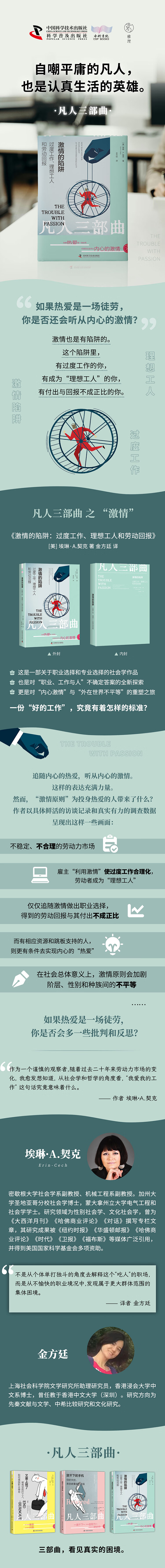 本书作者埃琳·A.契克为了追寻自己的激情,离开学了三年的工科专业,转向社会学研究。作为激情原则的信奉者,她逐渐意识到,“我爱我的工作”也有陷阱:遵循 “内心热爱”做出专业或职业选择的人,可能会因“过度工作”成为“理想工人”。