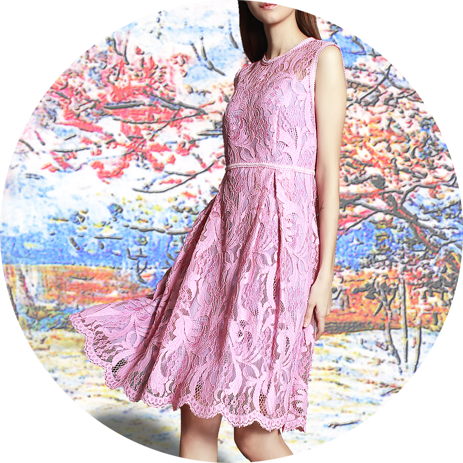 蕾丝作为一种视觉符合的表达,表达出透而不明,雾里看花的美感,它的感情特点 与镂空的半透明特性,将露于半露的的暧昧发挥到一种极致,使之有一种犹抱琵琶半遮面的娇滴感。