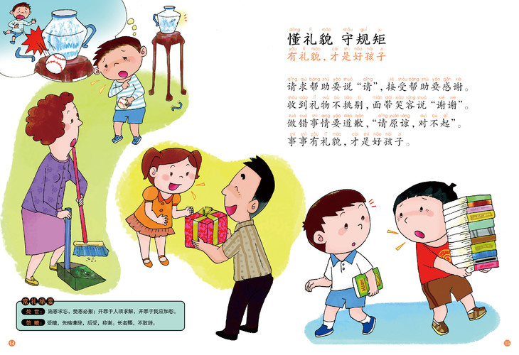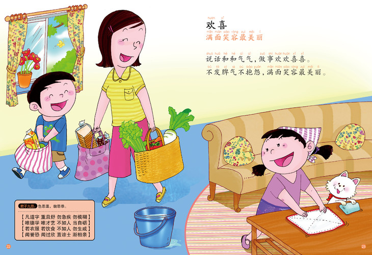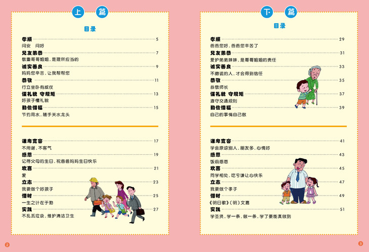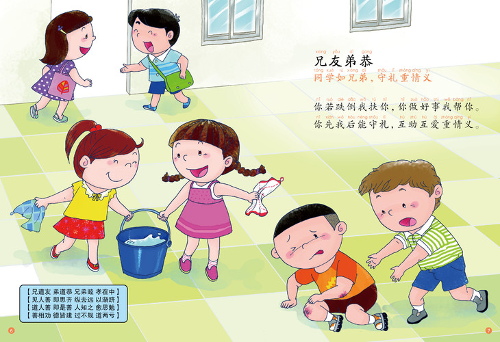 《〈弟子规〉教学读本》依据儿童年龄特点和认知能力,每册均围绕十三个和生活密切相关的主题:孝顺、兄友弟恭、诚实善良、恭敬、懂礼貌守规矩、勤俭惜福、谦卑宽容、感恩、欢喜、立志、惜时、实践,依次第引导儿童在生活中演示和实践,帮助儿童学会日常生活中应对进退应有的礼节,学会如何待人接物,养成基本的品德修养。