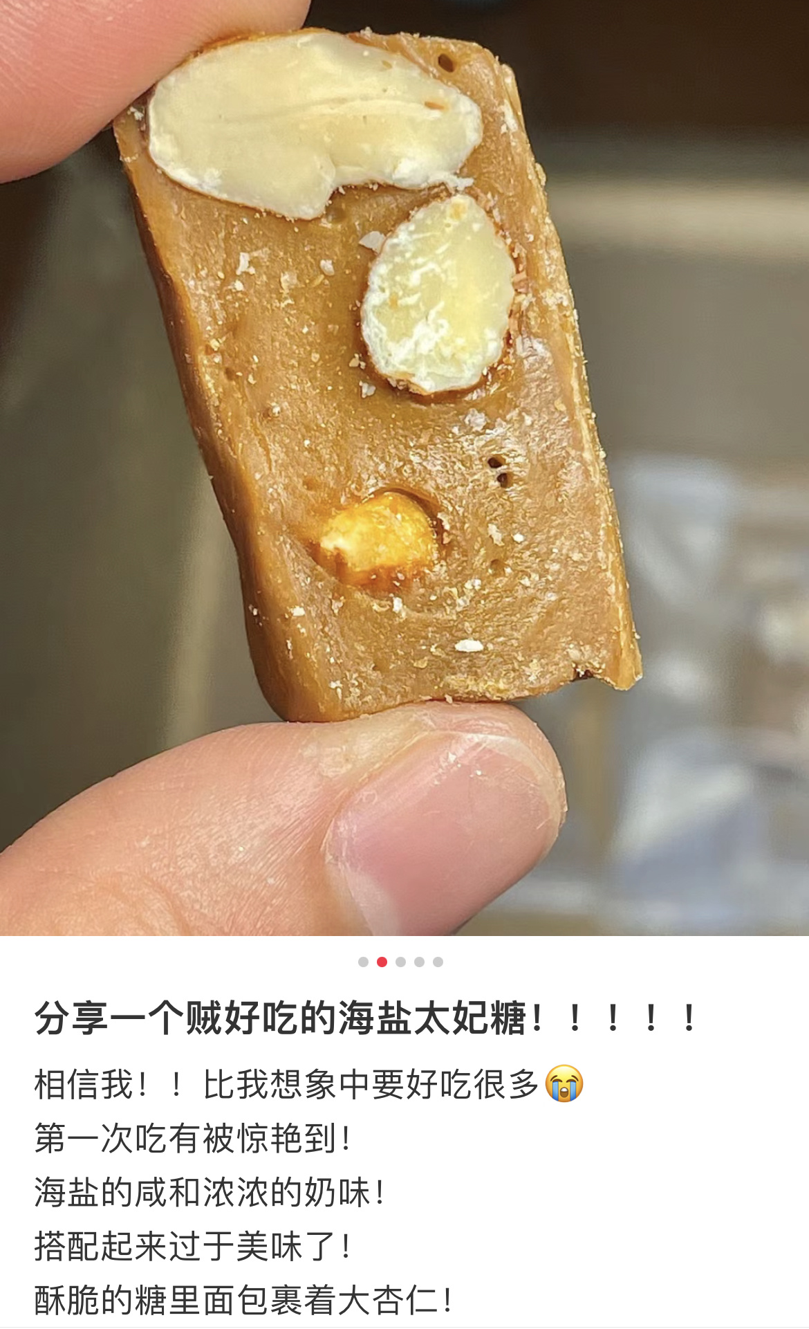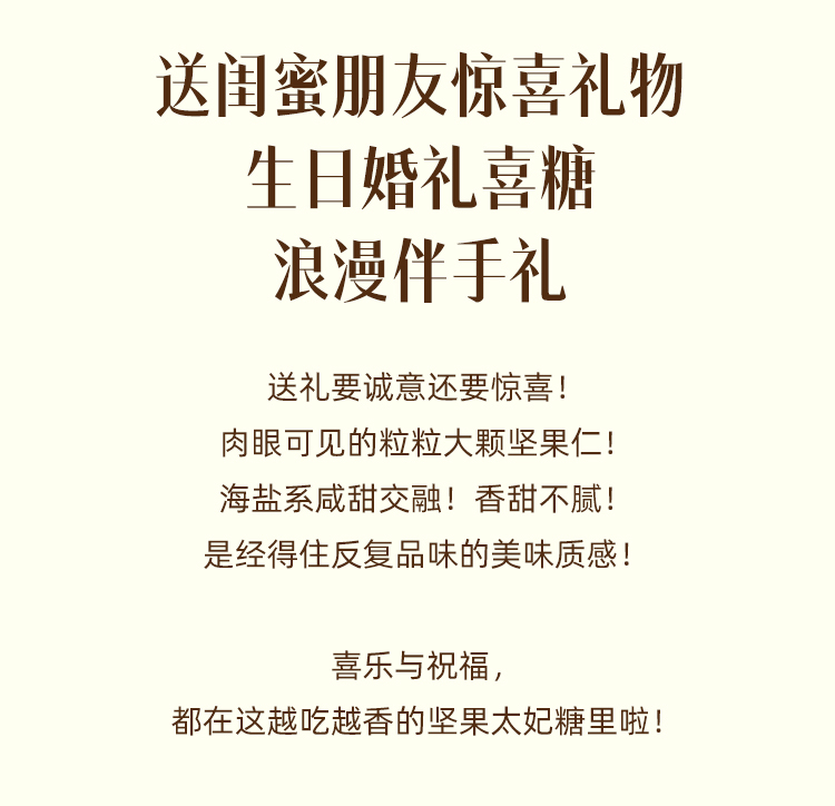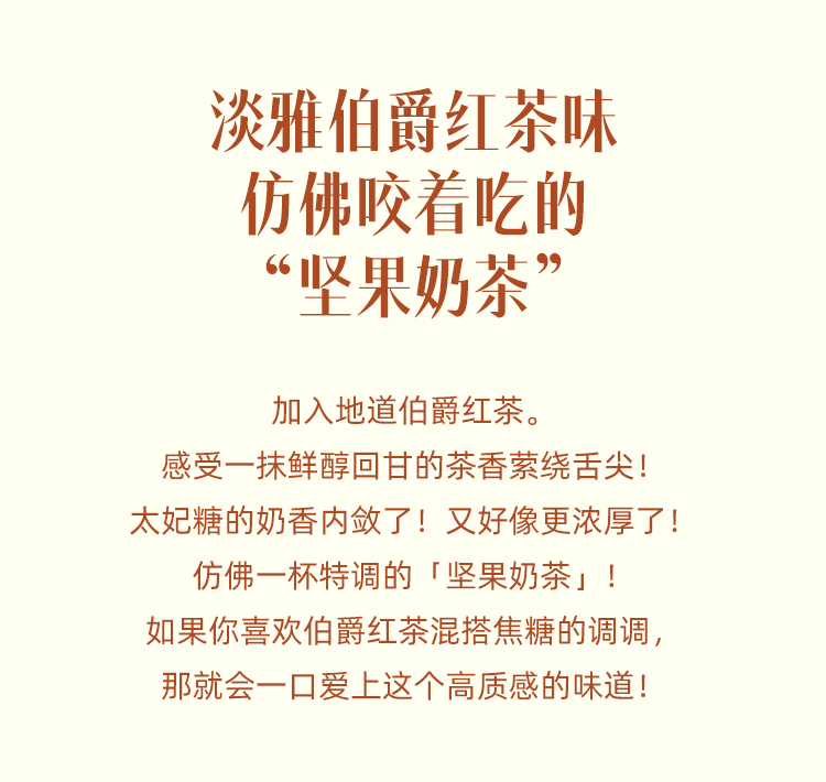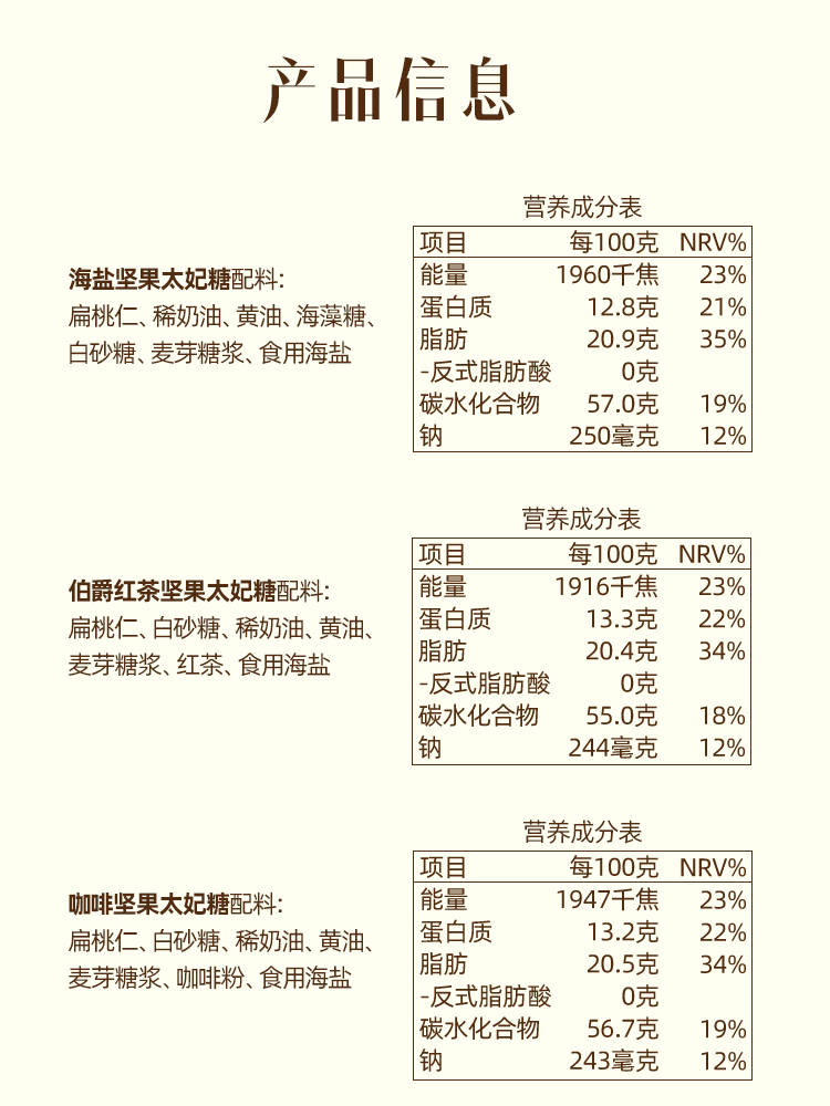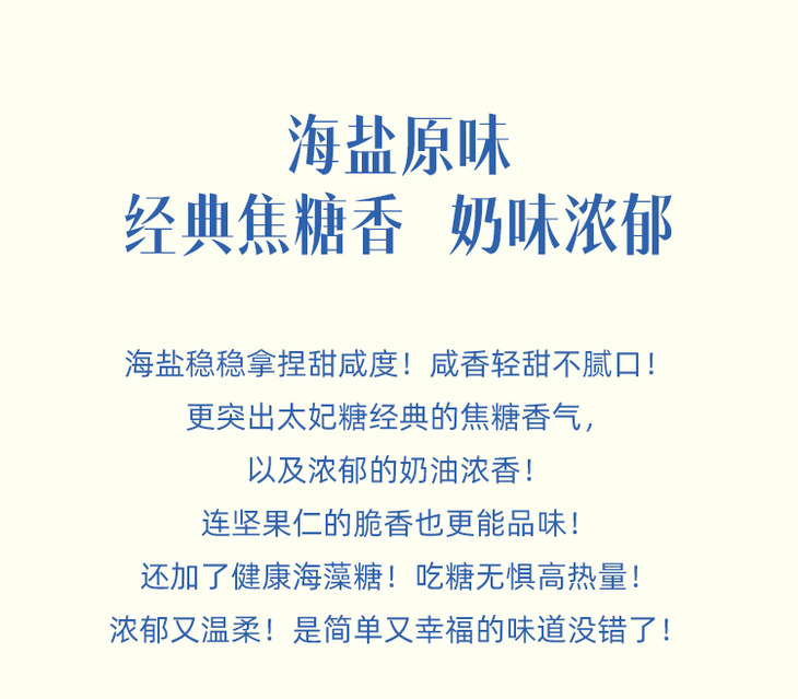 海盐坚果太妃糖有经典焦糖香,奶味浓郁,稳稳拿捏甜咸度,入口微微咸香,随着糖果脆脆地裂开,醇厚的奶香加上烘烤的坚果,形成咸甜交融的复合香气,和清茶或黑咖非常搭!伯爵红茶坚果太妃糖,红茶香、焦糖香、奶香徐徐铺开,口感丝滑,香甜不腻,仿佛咬着吃的坚果奶茶!咖啡坚果太妃糖,则是有着醇香咖啡味,微苦犹甜的滋味,咀嚼开来,像是卡布奇诺,里边包裹的坚果也超级足!三个口味都不错,越嚼越香,一口一个!建议直接每口味2包,换着吃!