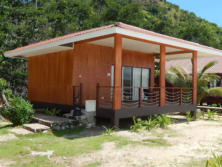 54平米大小,用进口松木建成的独栋木屋,有一张大床,靠近泳池和餐厅。