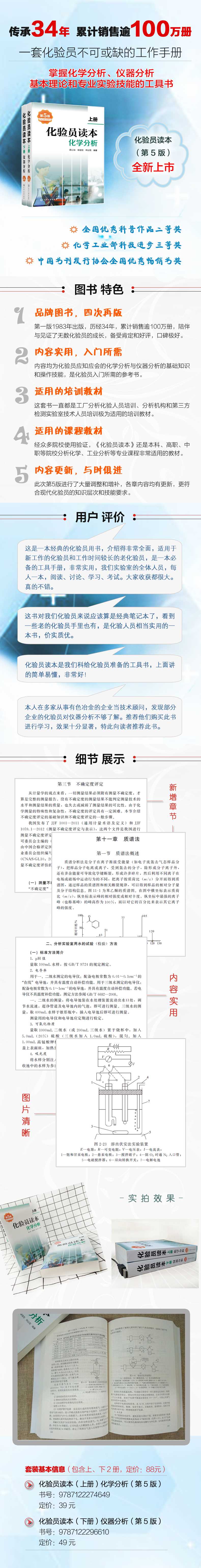 1.品牌图书,畅销百万《化验员读本》是化学工业出版社的品牌图书,前四版畅销百万册,经历了读者的检验,树立了良好的口碑。2.内容实用,入门《化验员读本》内容实用,介绍了化验员应知应会的化学分析基础知识和操作技能,是化验员入门的参考书。3.适用的培训教材《化验员读本》是工厂分析化验人员培训、分析机构和第三方检测实验室技术人员培训非常适用的培训教材。4.适用的课程教材经多所高职高专、中职技校等学校使用验证,《化验员读本》是这些层次院校工业分析专业课程非常适用的教材。
