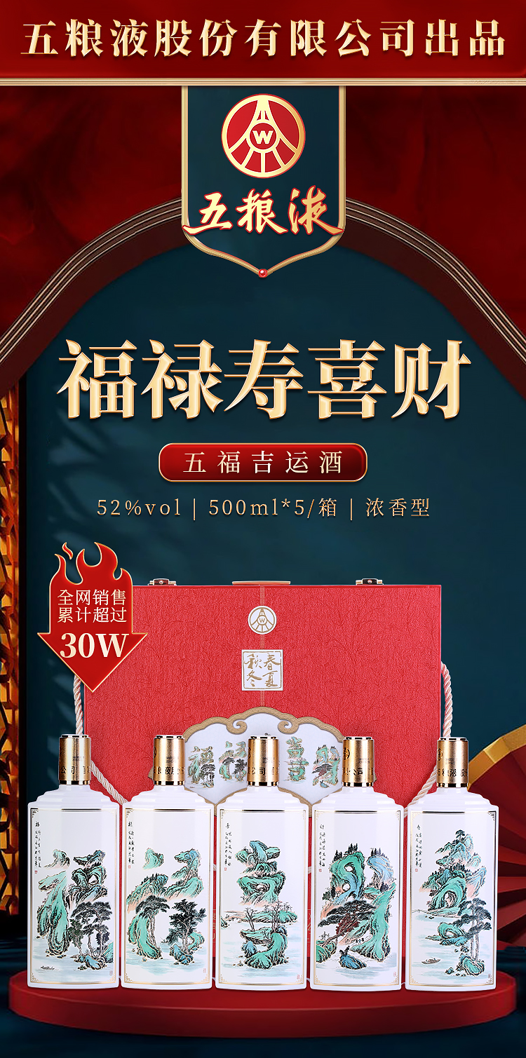氧气专属【主持人亲测严选•把福带回家!】五粮液52度五福吉运酒 福禄寿喜财 经典浓香500ml*5瓶 全网30W+销量 五粮液收藏证书 一证一编号(秒杀:599元一箱5瓶)