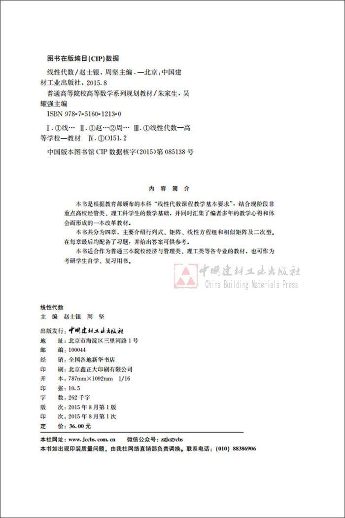 本书共分为四章。第一章主要介绍了行列式的概念和性质。第二章介绍了矩阵的代数运算、可逆矩阵、方块矩阵、矩阵的初等变换、矩阵的秩等概念和相关性质。第三章首先讨论了线性方程组的求解问题,给出了方程组有解的判别定理,接着介绍了向量的线性关系和向量组的秩等知识。最后,研究了齐次和非齐次线性方程组解的结构。第四章研究了矩阵的特征值和特征向量、相似矩阵等内容后,探讨了方阵的对角化问题。在此基础之上,给出了二次型概念,并研究了化二次型为标准形与规范形的一般方法,最后介绍了正定二次型的相关性质。