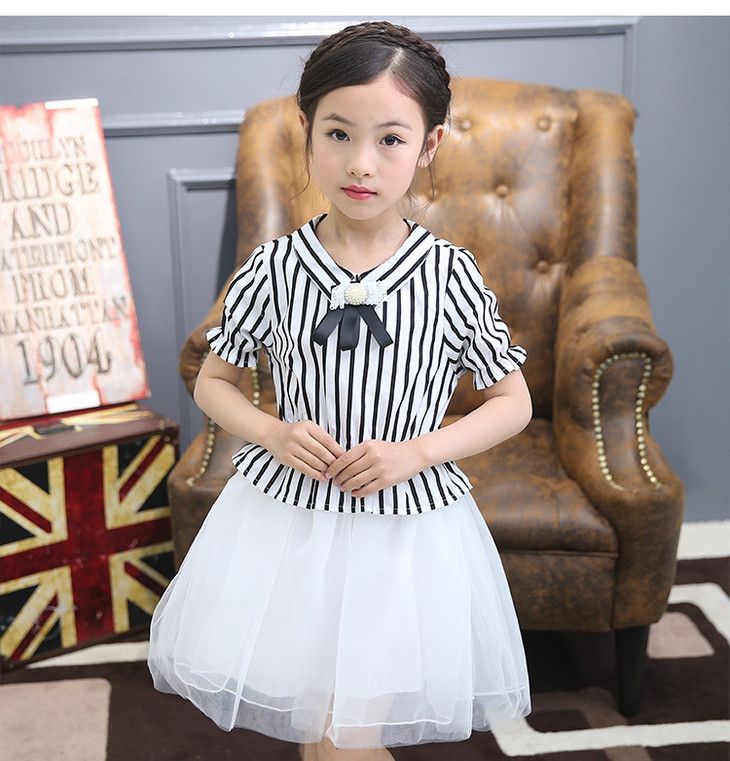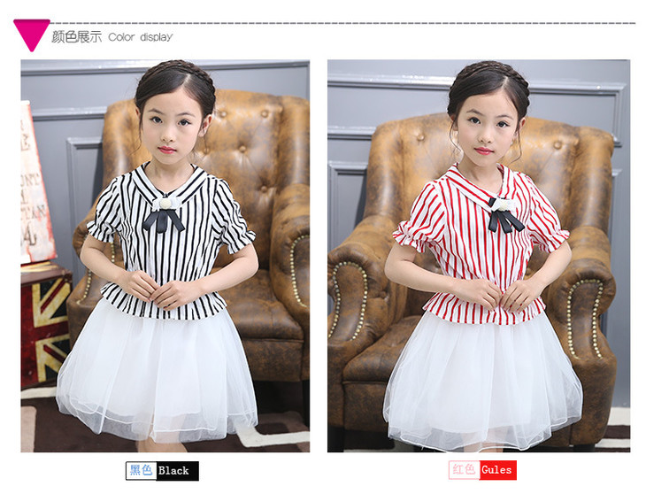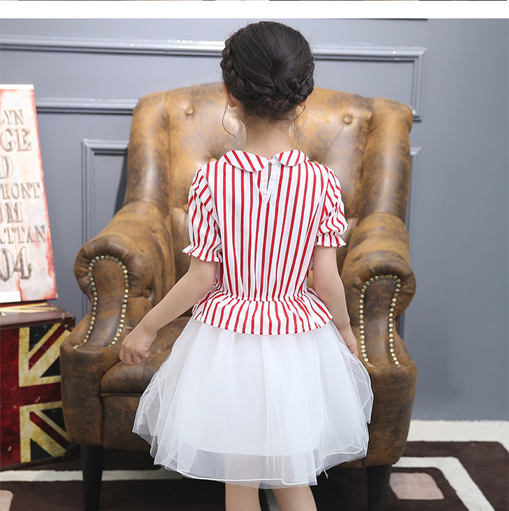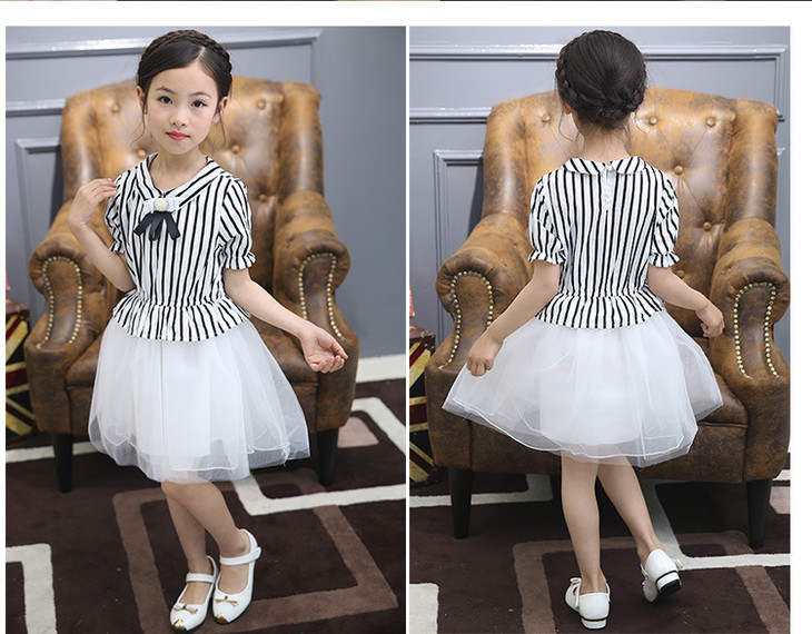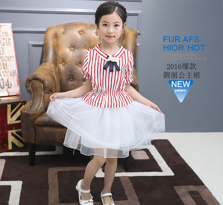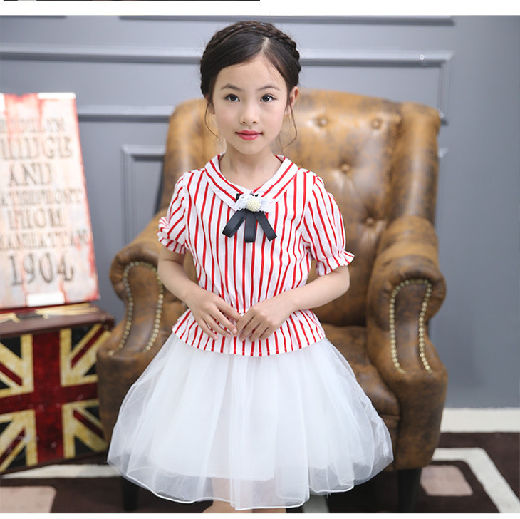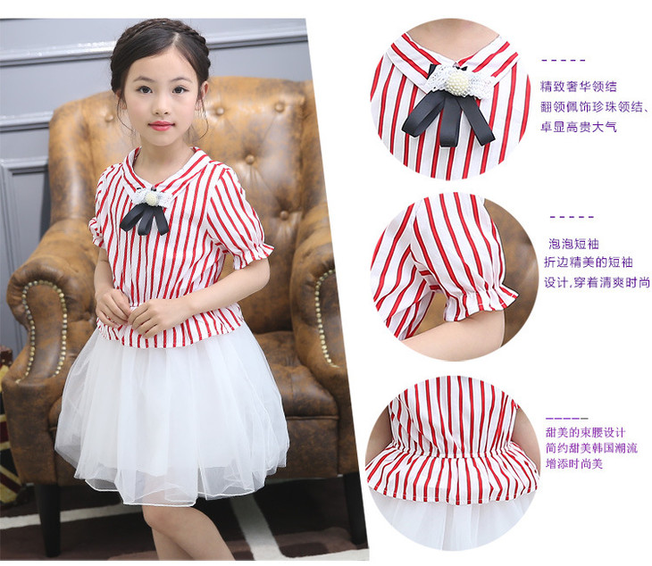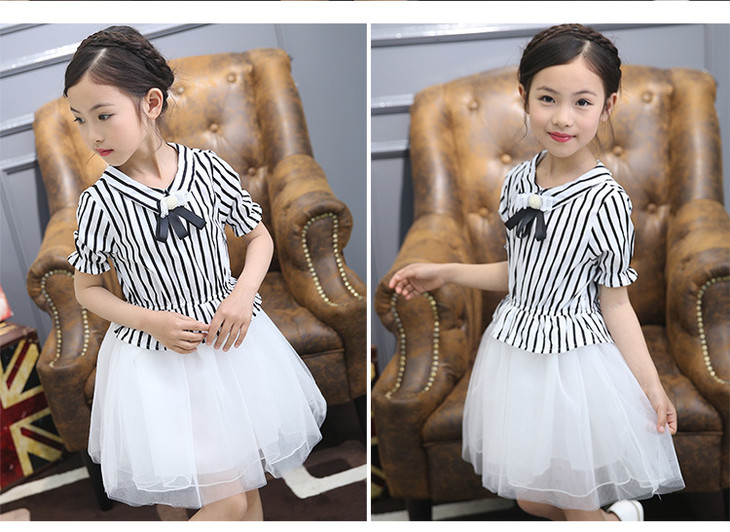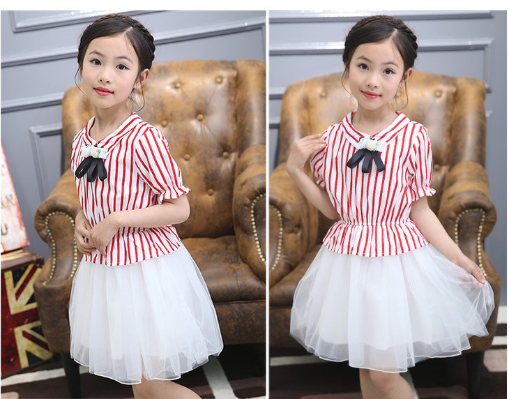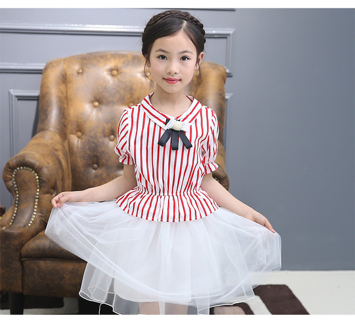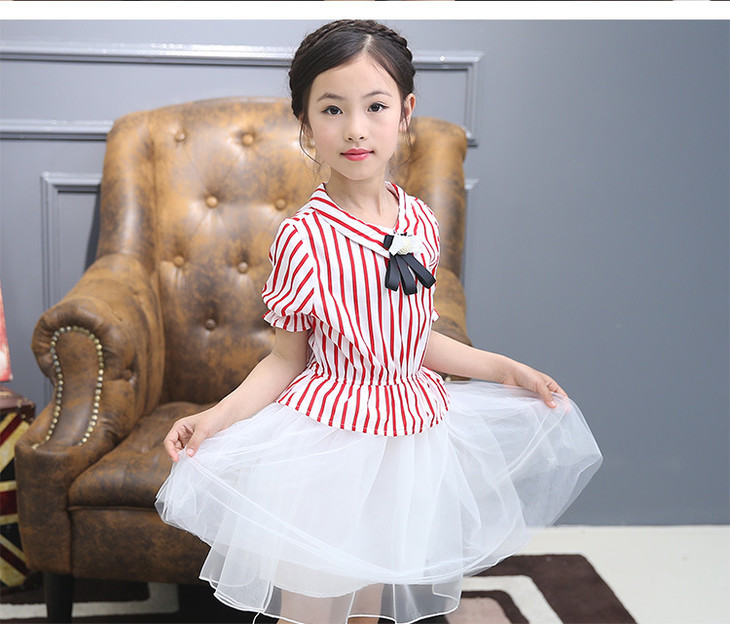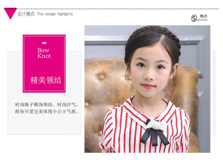 【女童裙子】春款童裙 中大童韩版女童翻领短袖条纹修身连衣裙 潮