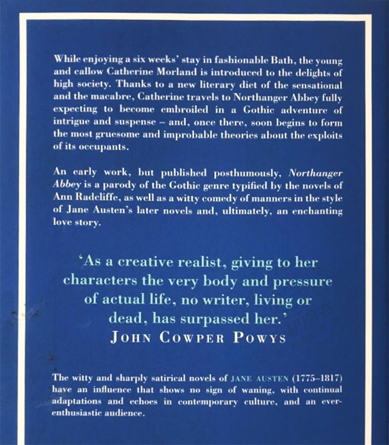 Northanger Abbey《诺桑觉寺》是英国女作家简奥斯汀所创作的首部小说作品,但在其去世后才发表。书中,奥斯汀用犀利的语言和鲜明的人物形象,以一个普通家庭女孩的视角,向读者展现了19世纪上层社会的缩影。看似描述贵族的日常生活,实质上是对当时社会的一些讽刺。