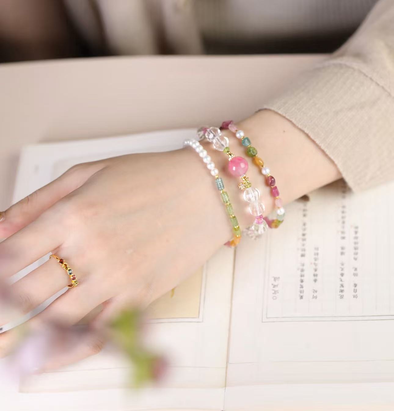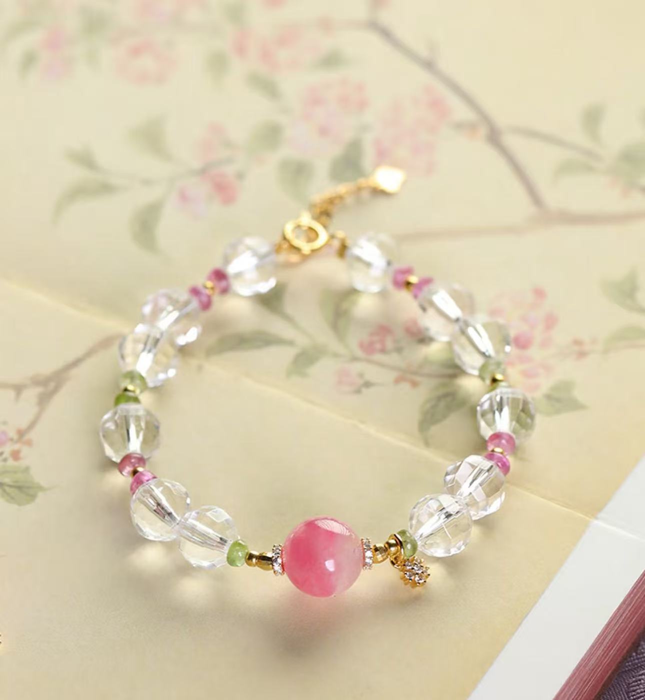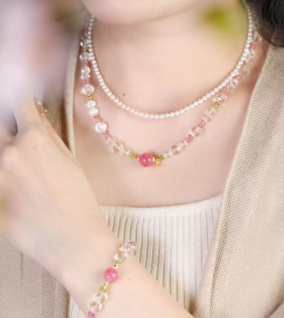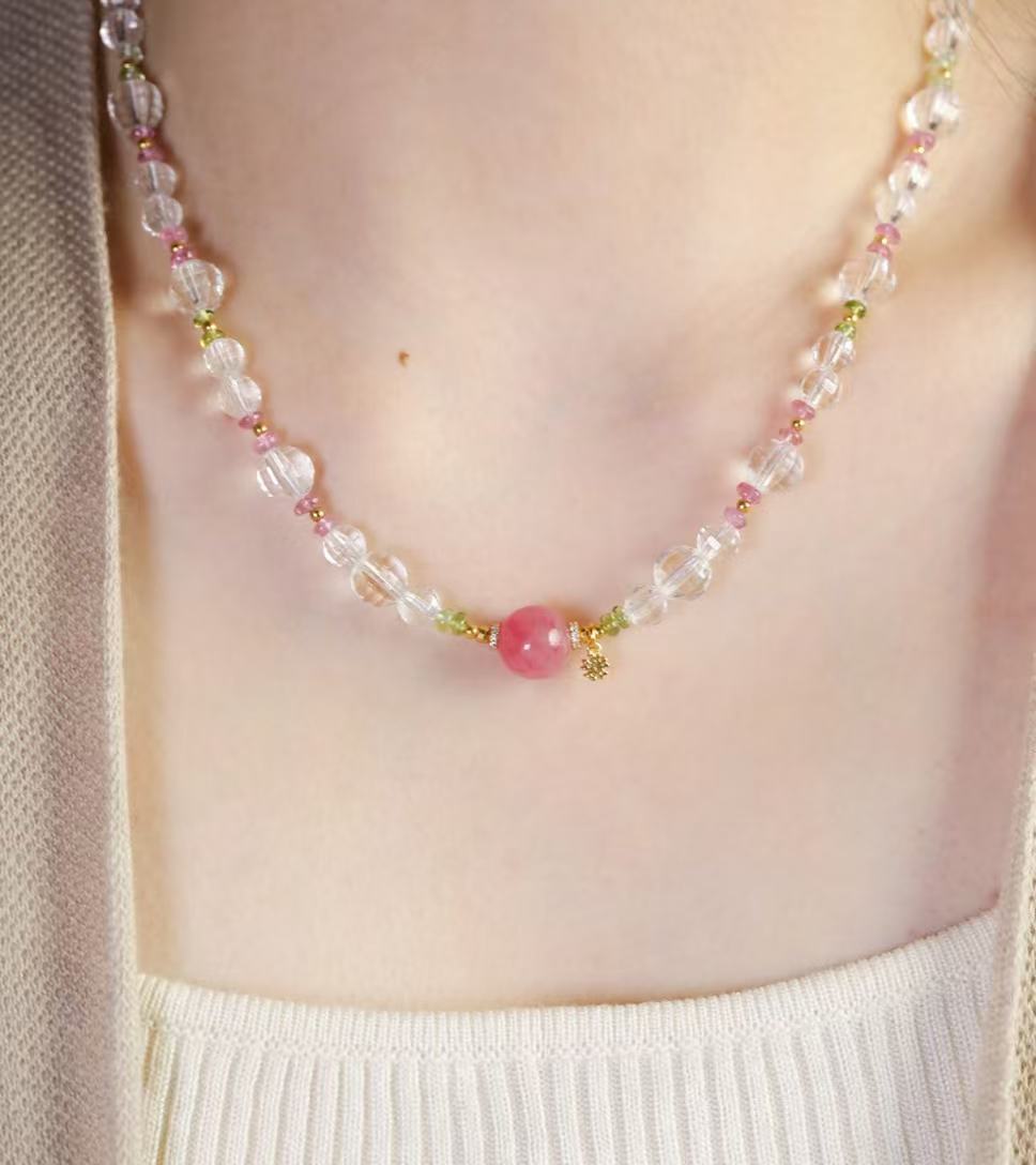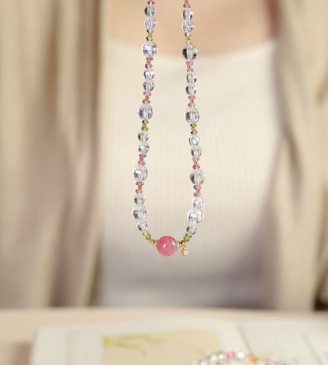 【宫里手串】桃红柳绿·天然白水晶蔷薇辉石碧玺小花手链/项链(48小时发货)