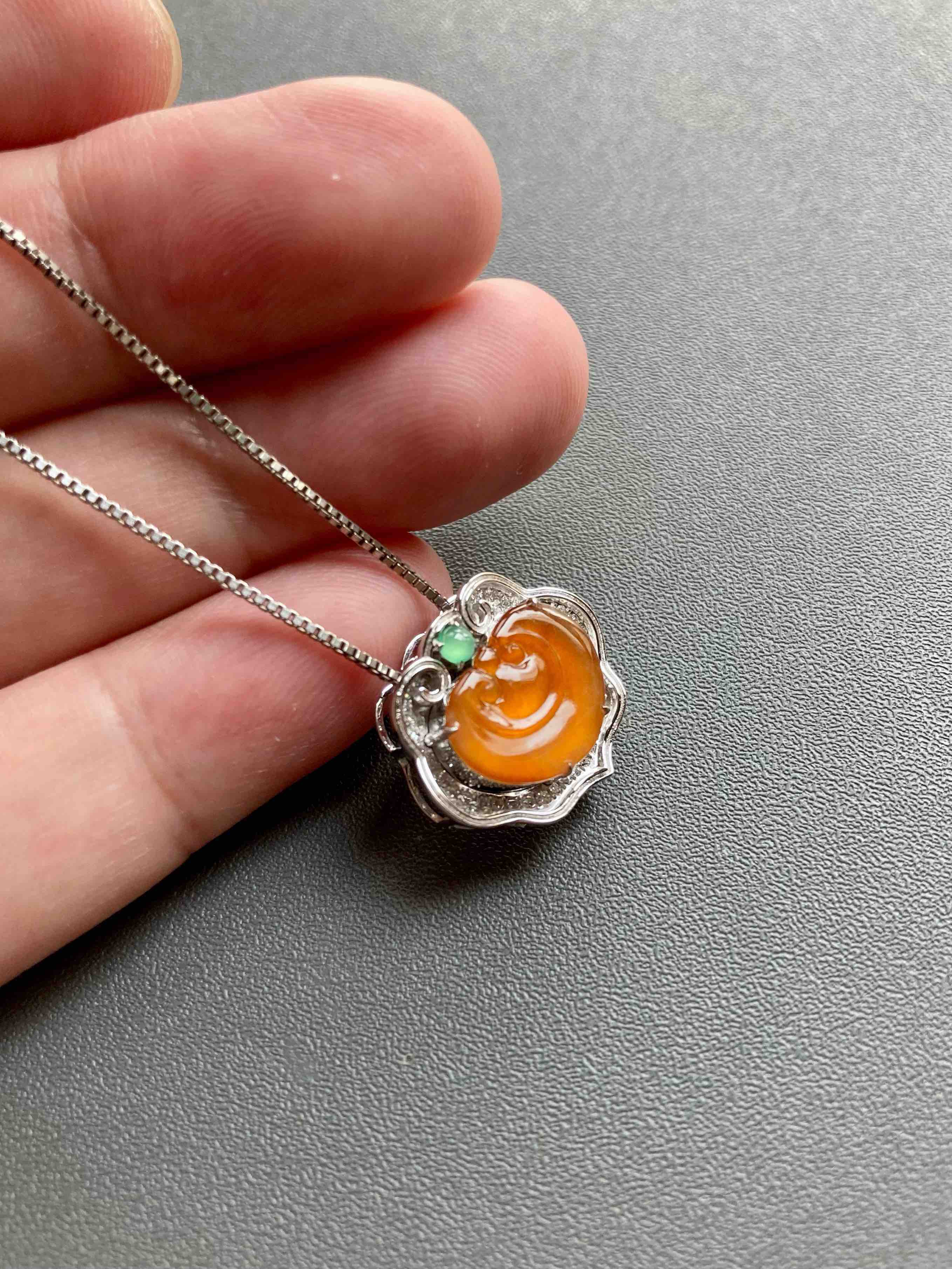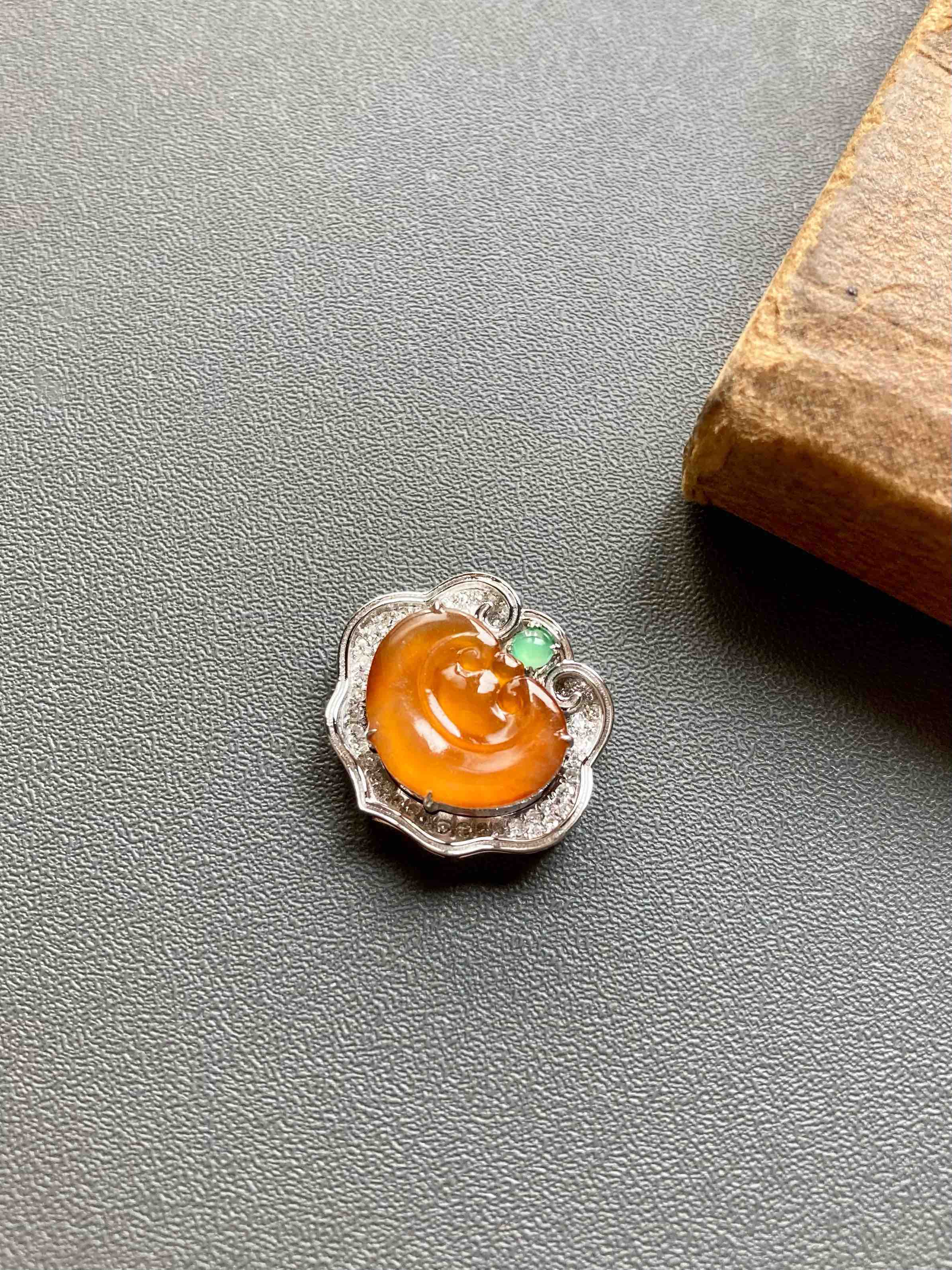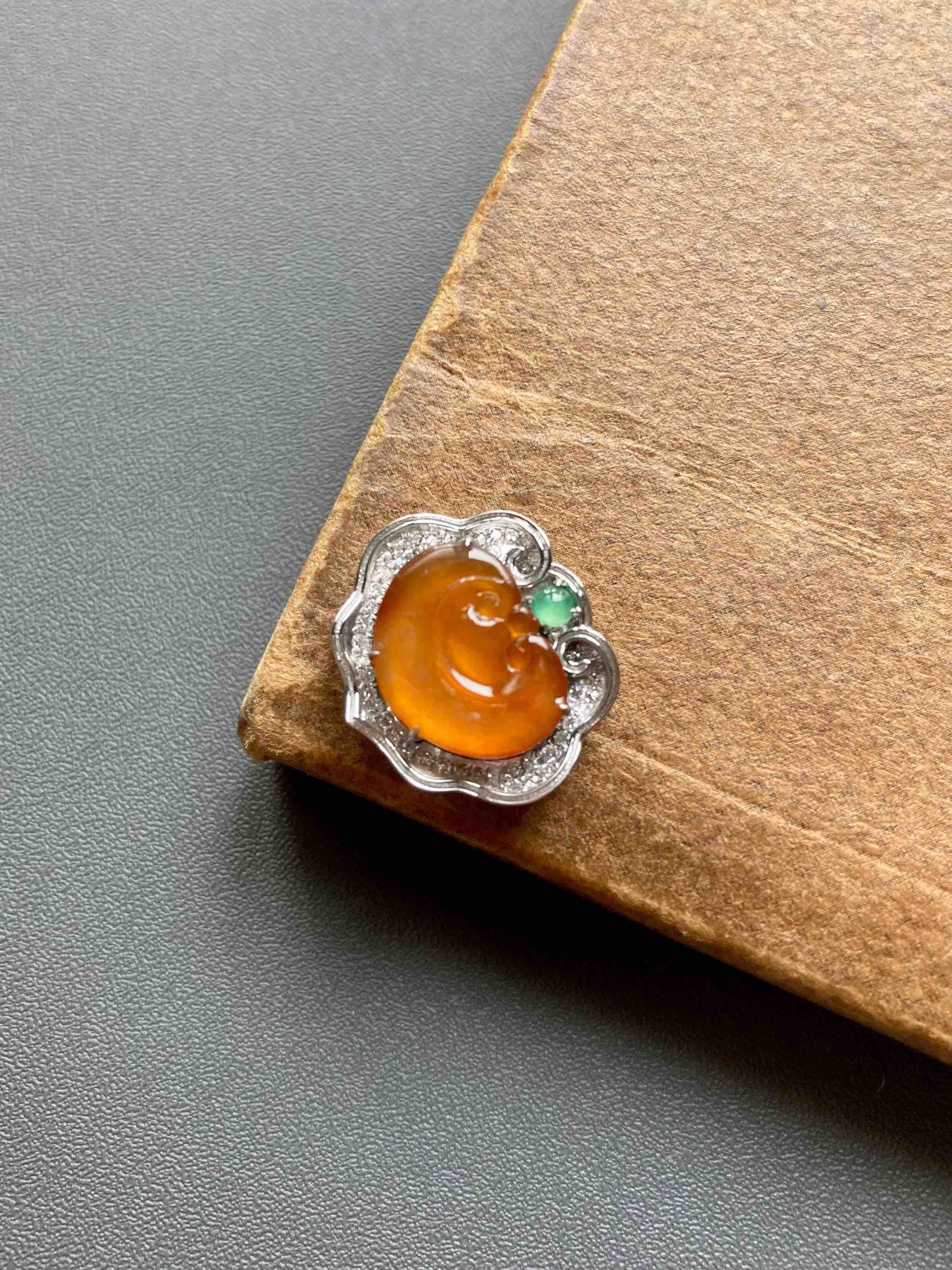 稀罕物,高冰到玻璃种黄翡如意,绝美芬达色,种水晶莹剔透,荧光四射,如梦幻般的橘黄太迷人,18k白金钻石镶嵌,一颗阳绿蛋面点缀,错过了它怕你再难遇到,裸石12.5×9.6×1.3mm,镶嵌后17.7×15.4×6mm
