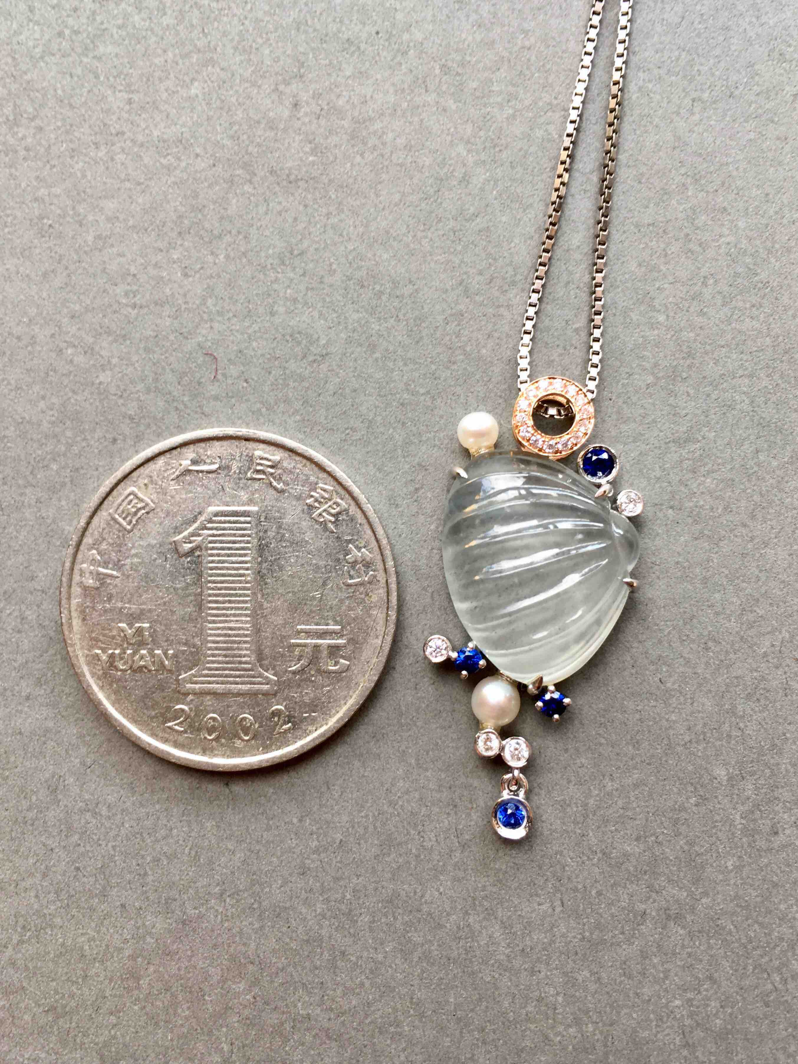 海边的小贝壳,高冰种翡翠贝壳,17.1×13.9×4.5mm,镶嵌后33×15.5×6.6mm,近玻璃种,荧光四射,寒气逼人,贝壳厚庄,立体饱满,18k白金玫瑰金钻石镶嵌,点缀珍珠和蓝宝石,冷色系的质感中不乏玫瑰金的暖调,满满浪漫气息,不容错过的特色精品,推荐