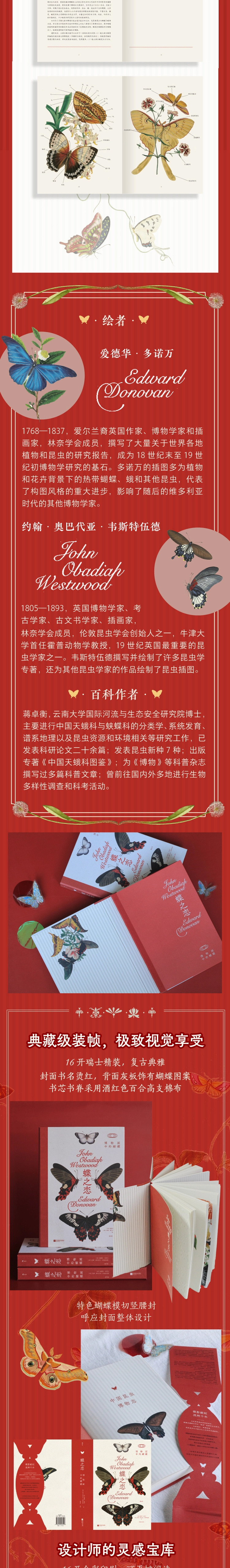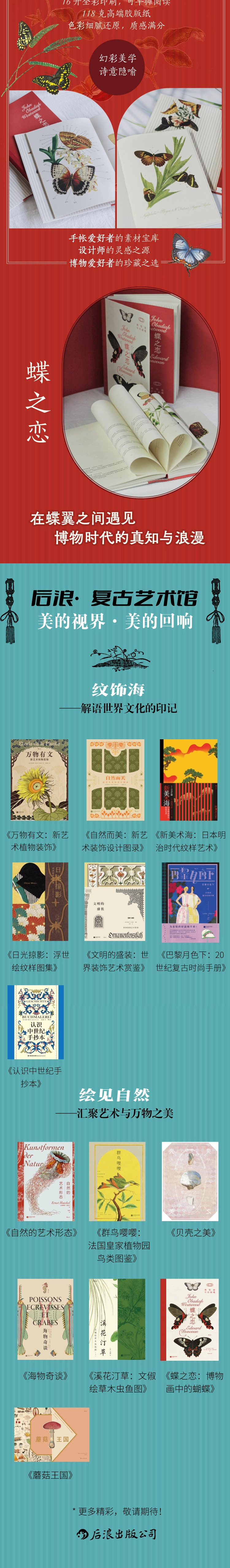 本书采用市面上较为难得的瑞士精装装帧,封面书名烫红,封面背面灰板饰有蝴蝶图案,打开书本如同开启一个精致礼盒;书芯书脊采用酒红色百合高支棉布,复古质感,持久耐用;书页可完全摊平,翻阅舒适。封底套有蝴蝶模切竖腰封,呼应封面整体设计。内文使用118克优质胶版纸,细腻还原斑斓色彩,在纸页间遇见博物时代的真知与浪漫。