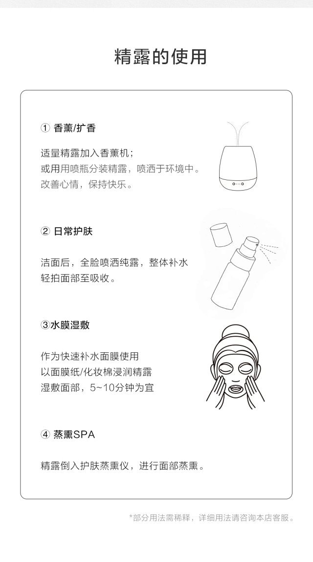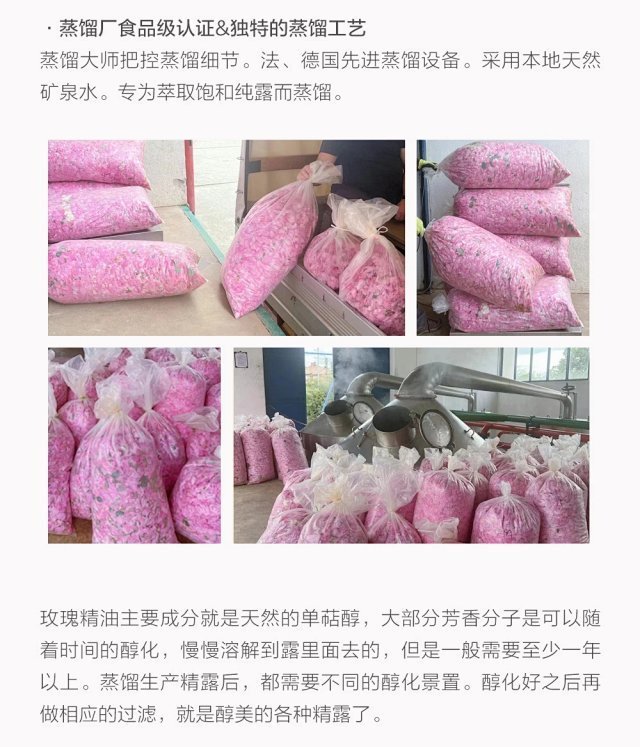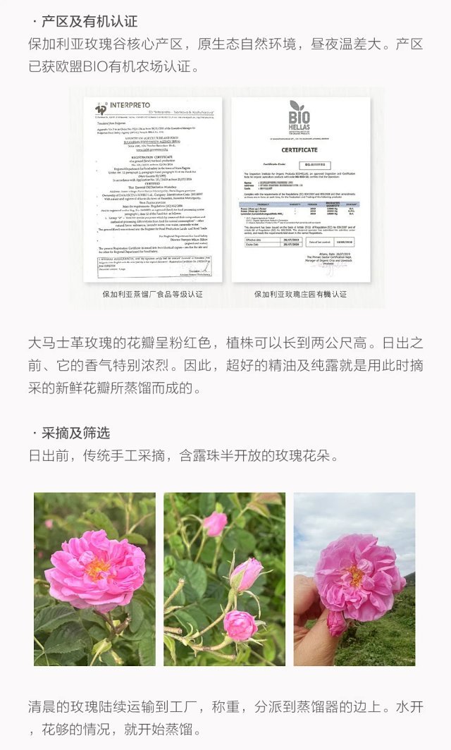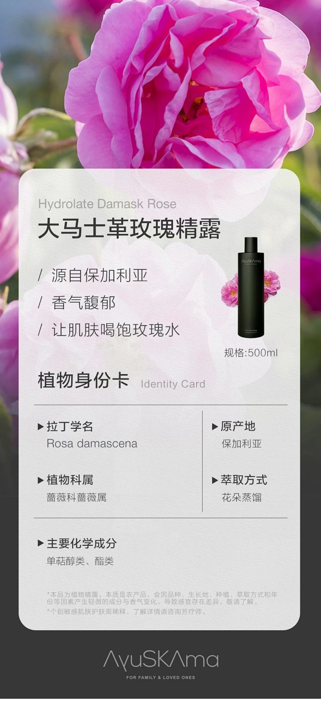 这是玫瑰精露,已经有不少老粉入过小瓶装了吧?它真的是能从头用到脚,除了能敷能喷,能漱口还能用作香薰、烹饪、甚至加水或做成饮料喝喝!AyuSkAma的玫瑰精露跟他们家堪比黄金一样贵的玫瑰精油一样,原料都是保加利亚的大马士革玫瑰,作为精油含量坠高的玫瑰品种,香气热烈奔放,在医用药用上也有很高的价值。大马士革玫瑰中的醛、酮对于人体可以起到消焱、镇静的作用,还能够促进伤口愈合,媄白肌肤。制作这款精露的玫瑰必须是日出前传统手工采摘的含露半开放花朵,再通过蒸馏萃取而成,所以有更多的苯乙醇成分,从而起到芳香理疗作用。要说玫瑰精露的具体用法,那真的太多了——直接当爽肤水&随身喷雾,洗完脸后喷喷喷,随时补充肌肤水分;浸湿面膜纸自制玫瑰面膜,效果比市面上大多数补水面膜效果更好;加在香薰机/加湿器里使用,净化空气,平衡身心;口腔溃疡、牙龈出血直接口含3分钟吐掉,清洁口气,洁净口腔;烹饪/口服,当作天然香料加入到甜品、饮品中,直接就有香甜的玫瑰芳香!还有其他个护用法,大家可以参考页面里的介绍来自己试试!我特别爱喝,每天一杯,味道跟玫瑰花茶差不多,但更浓一些,真的打出来的嗝都是香的,喝完不想再吃东西,想保持好口气!约会前,一定来一杯,男票问,就说是天生的体香!
