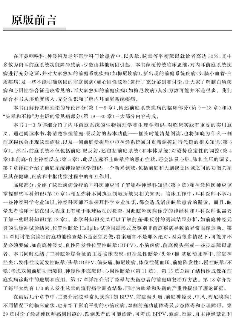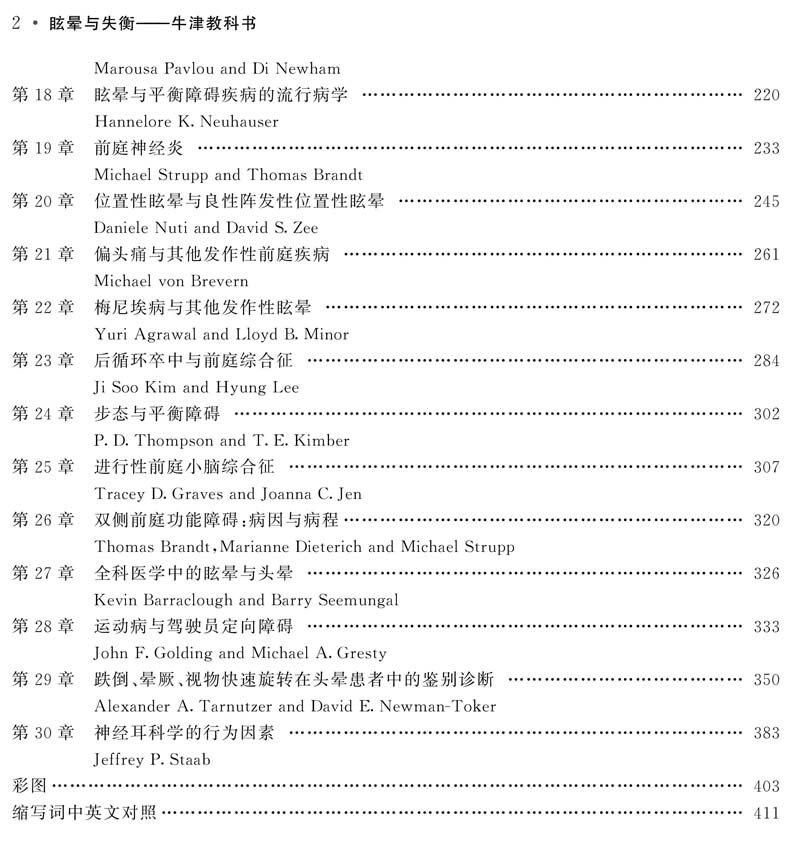 本书出自英国牛津大学出版社,由帝国理工学院查令十字医院神经耳科专家Adolfo M.Bronstein领衔,汇集欧美耳科、神经科、平衡医学研究单位及全科诸多眩晕专业顶级专家编著而成,是一部整合度高、内容精湛的治疗眩晕的医学著作。全书共30章。第1-8章对前庭基础理论进行了详细阐述,包括前庭生物物理学、前庭生理学、前庭系统解剖学、姿势控制、前庭代偿理论及前庭自主神经系统知识;第9-18章着重介绍了眩晕疾病的各种评价手段和方法、流行病学特征及疾病国际分类;第19-30章汇总了常见眩晕疾病的诊疗判别思路。译者团队紧扣原书内容整理了中英文对照专业词汇及缩写词等,希望能帮助读者更好地了解眩晕疾病的英文专业词汇。本书内容系统翔实,可供耳科、神经科、老年医学科、精神心理科等从事眩晕疾病诊疗的医务人员、技师及研究人员阅读参考。